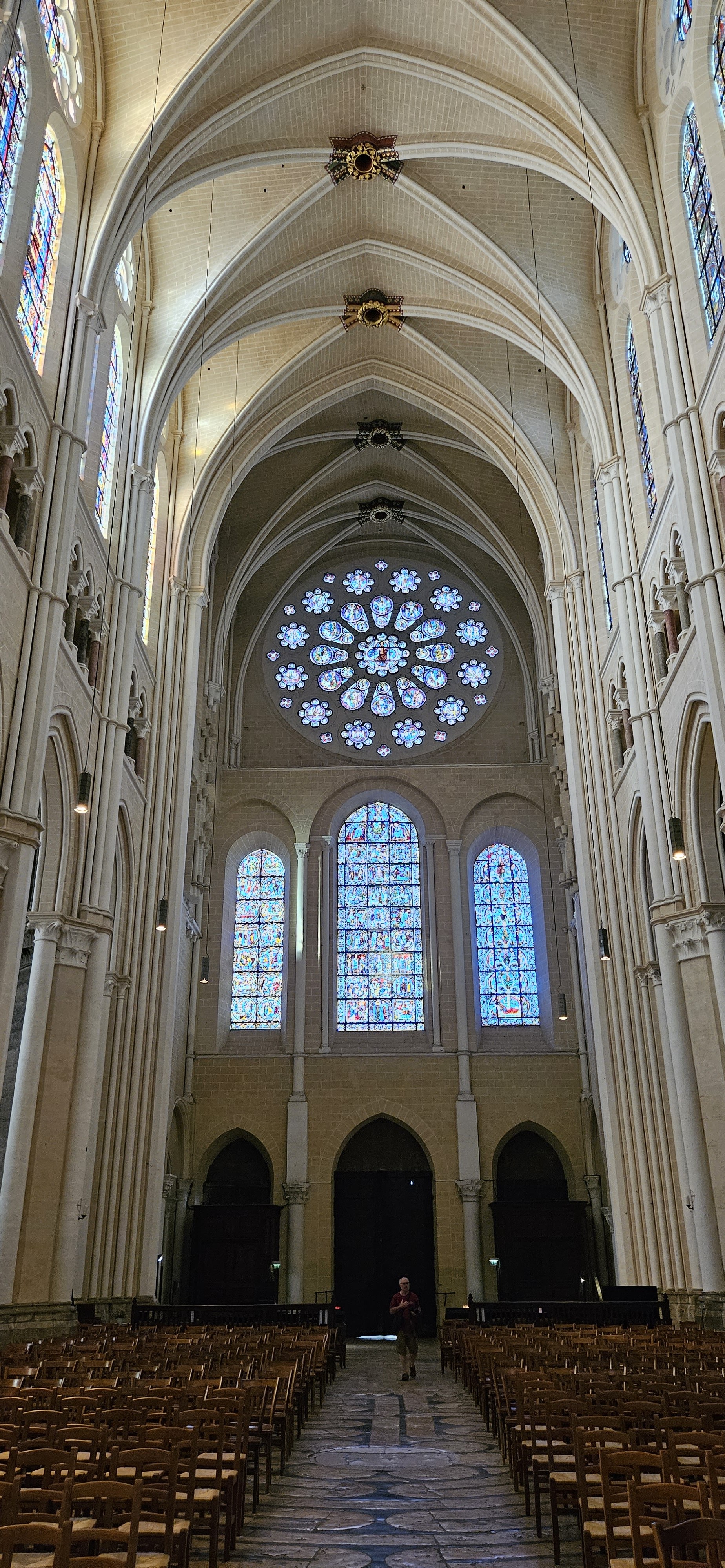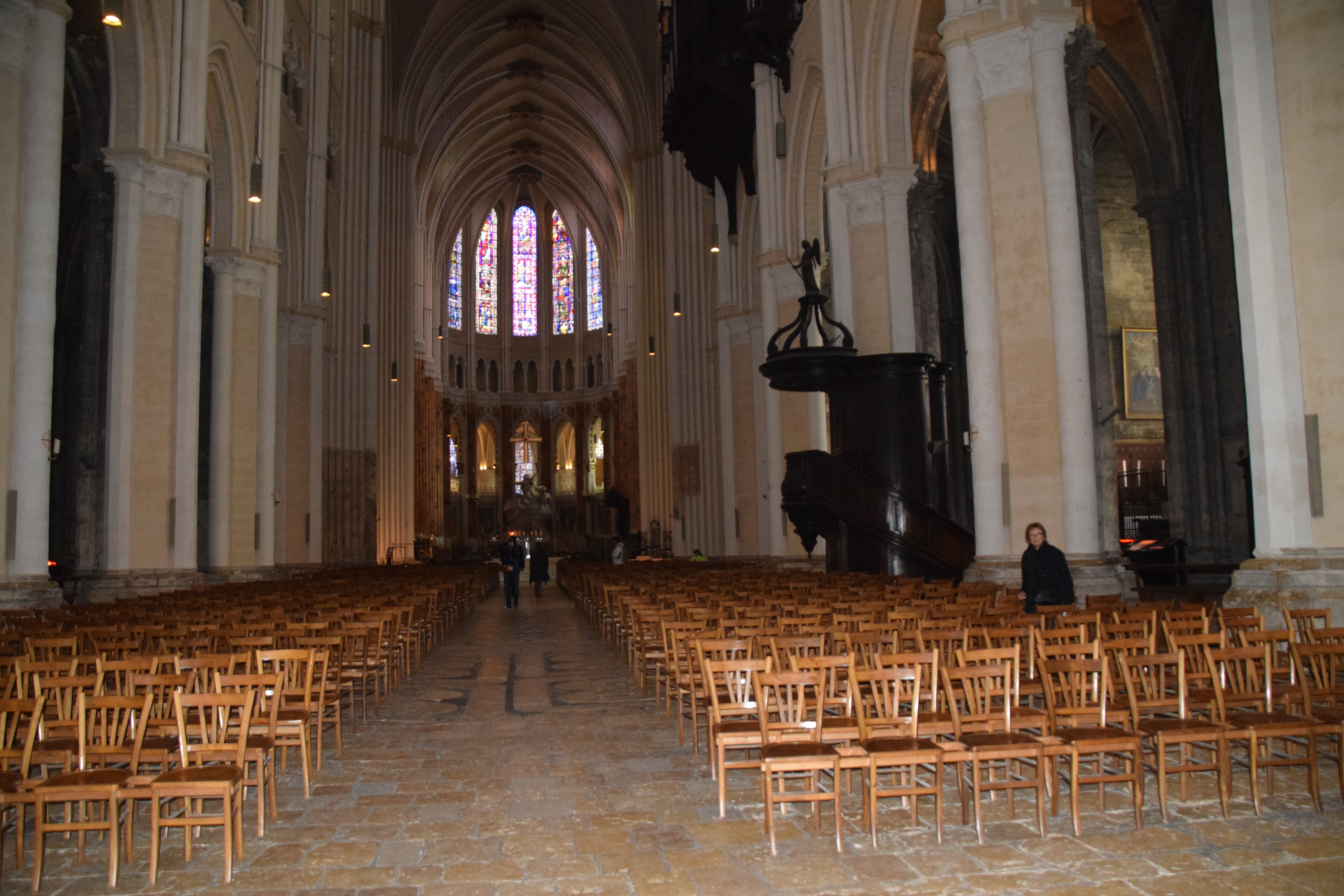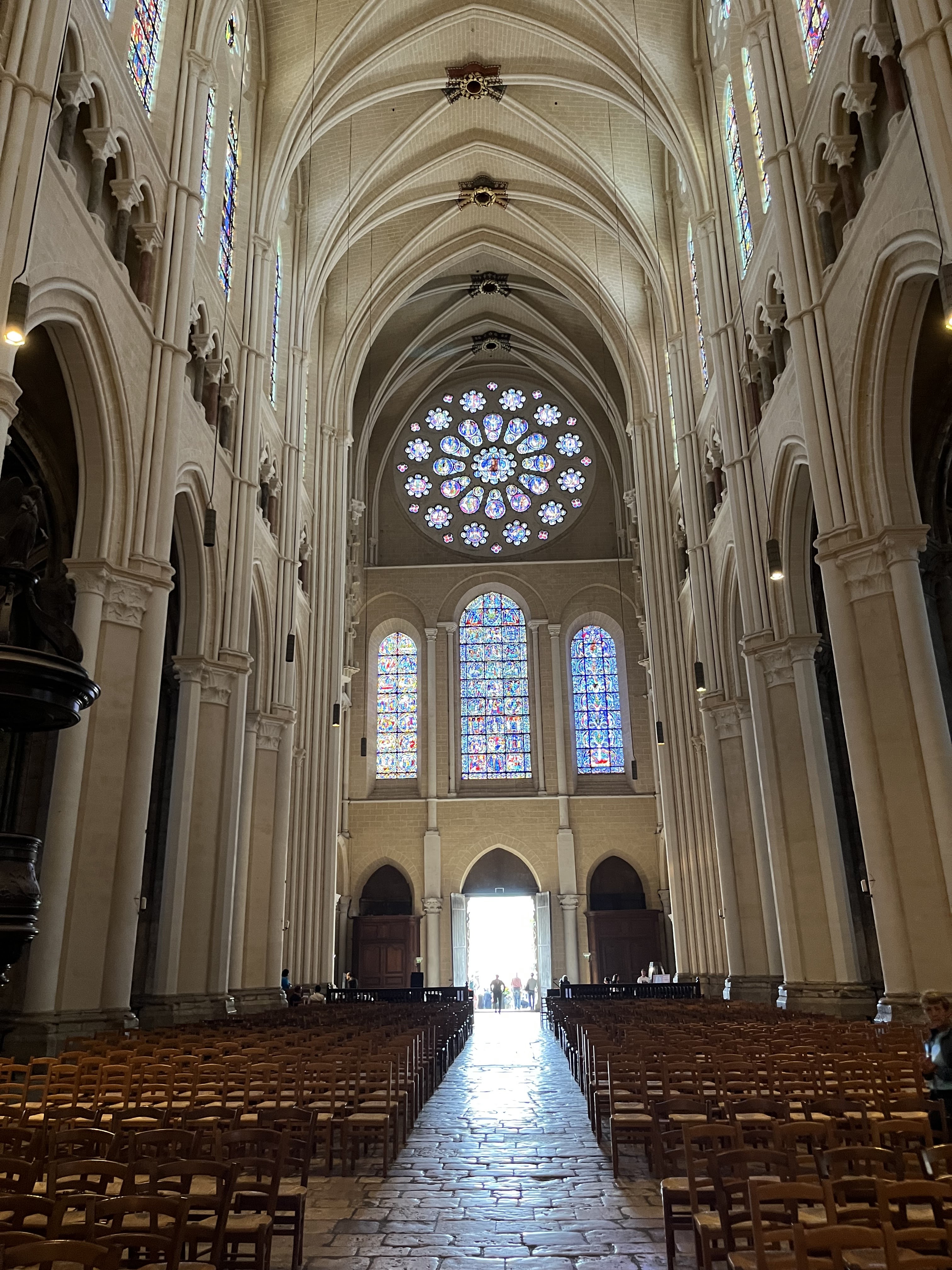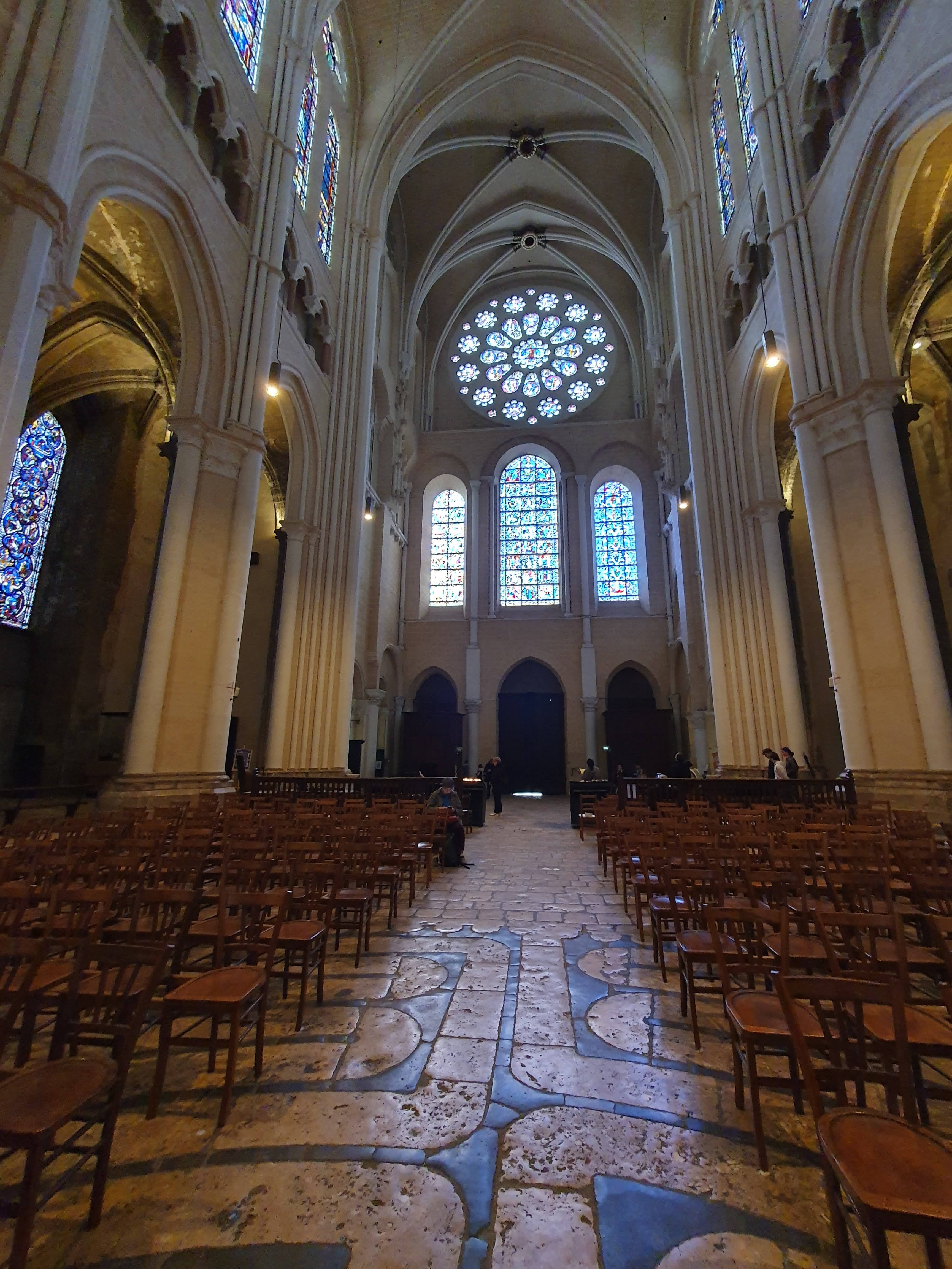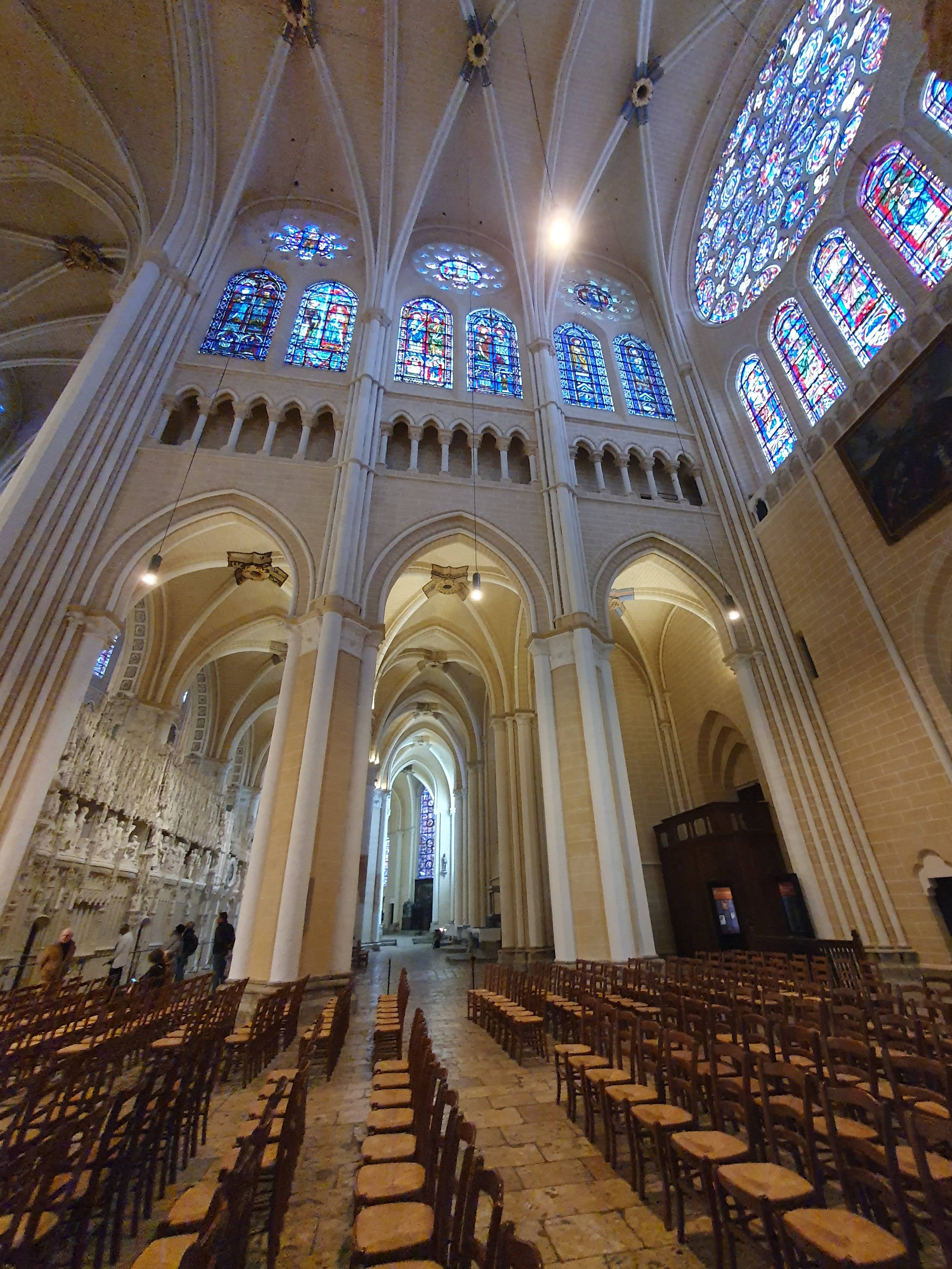 Tout d'abord vous êtes pris par les hauteurs, la richesse et la conservation des vitraux , puis se qui frappe se sont les détails et le nombres des sculptures en pierres ,je suis admirative des travaux des artisans de l'époque. Certaine période révolution ont laissés des traces non réparables ( têtes et mains coupés) . Les travaux discrait ,vous font réapparaître la pierre blanche . Le labyrinthe , comme à la cathédrale d'Amiens est visible malgré les chaises .