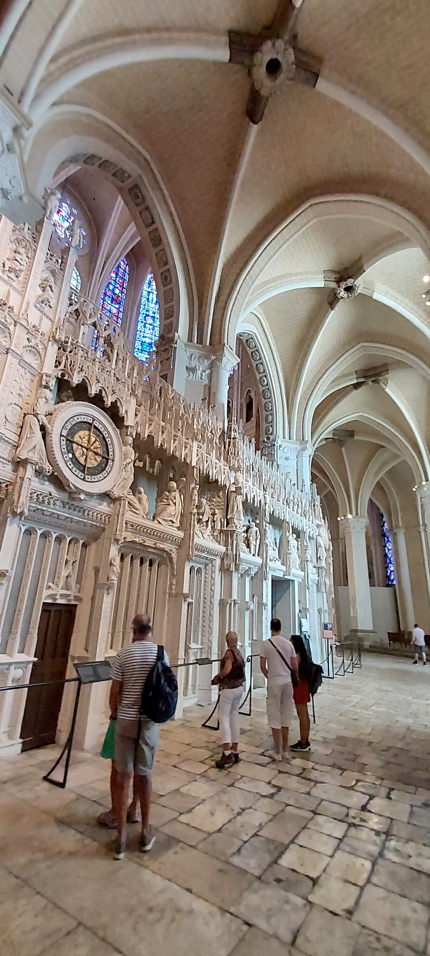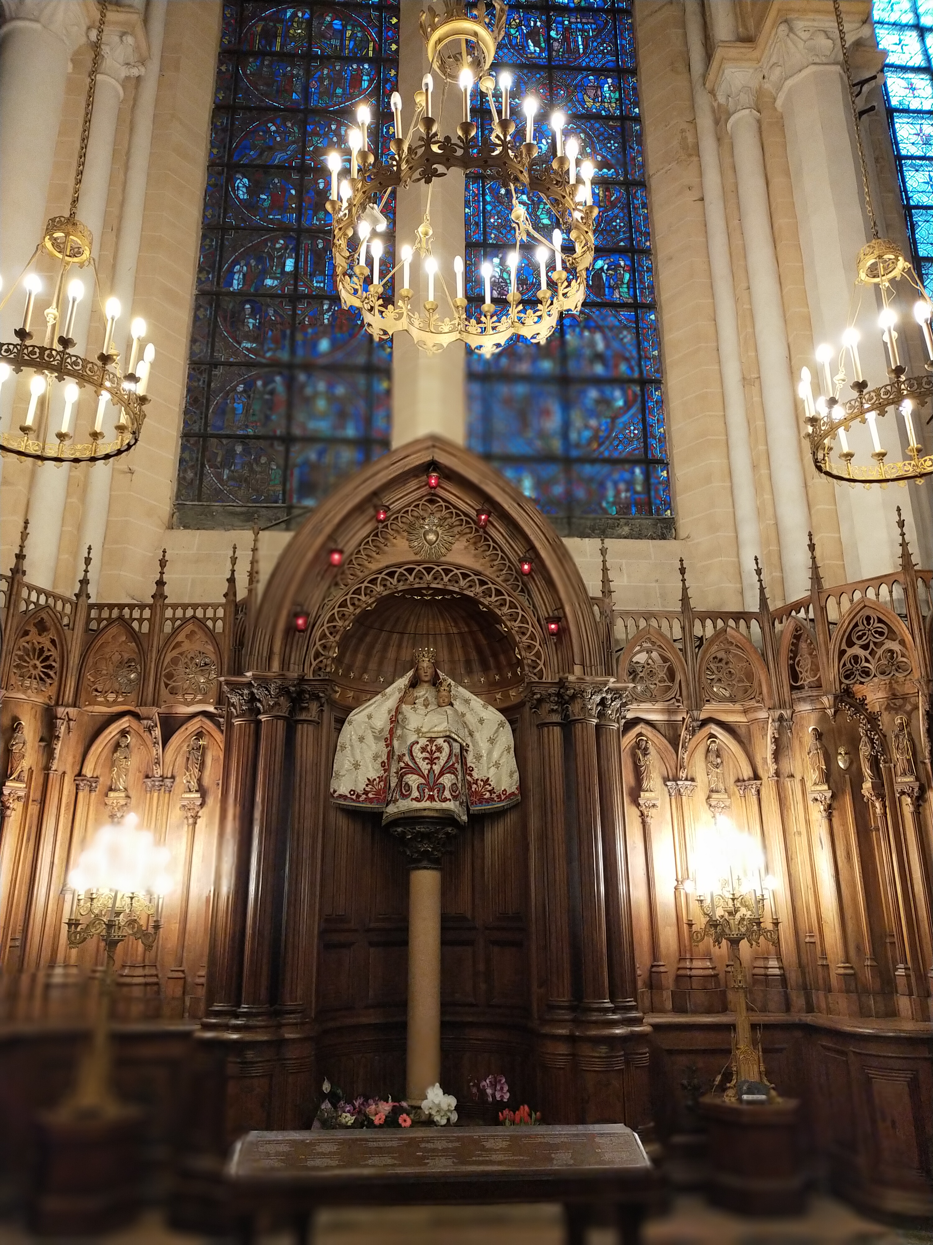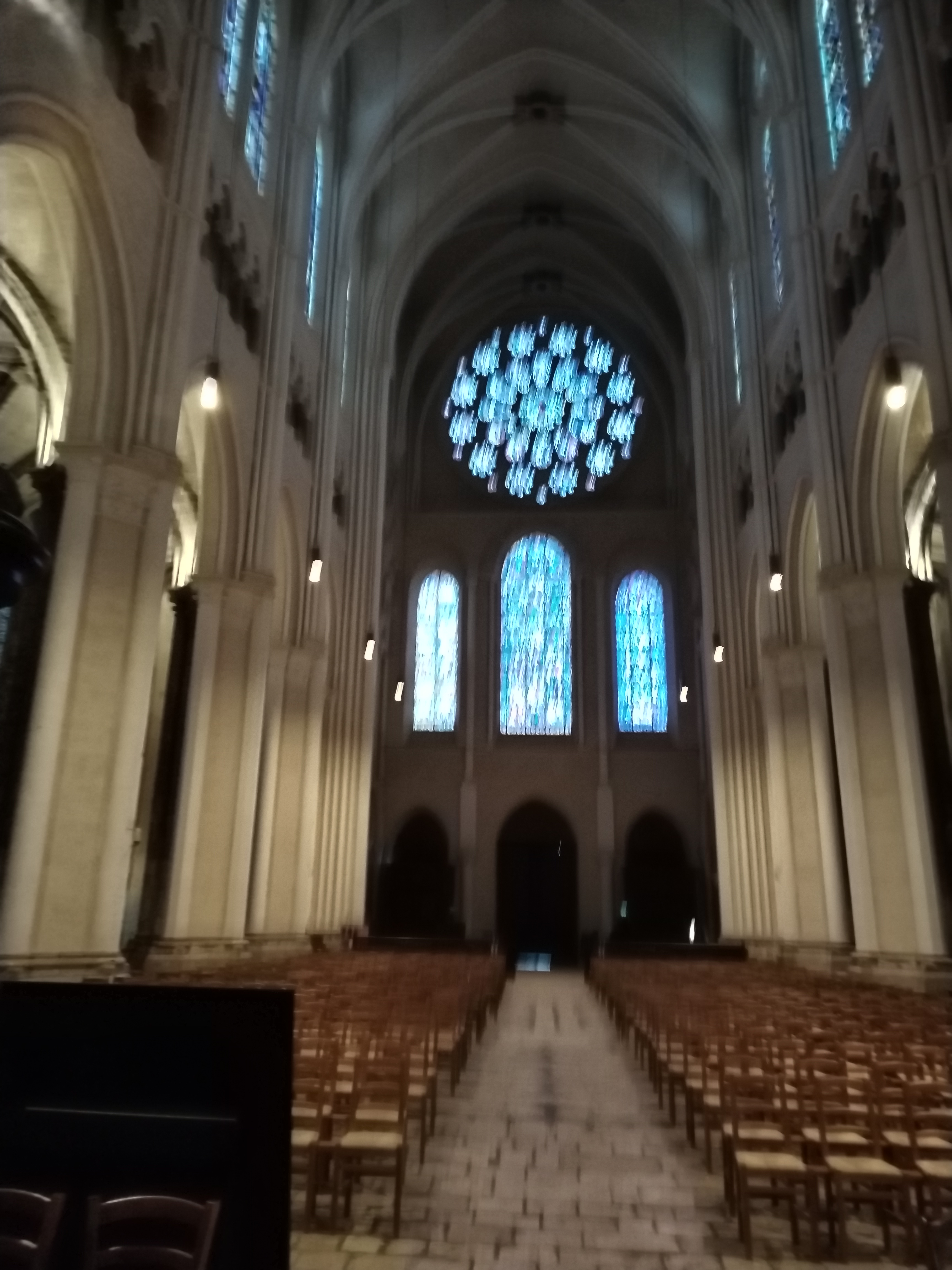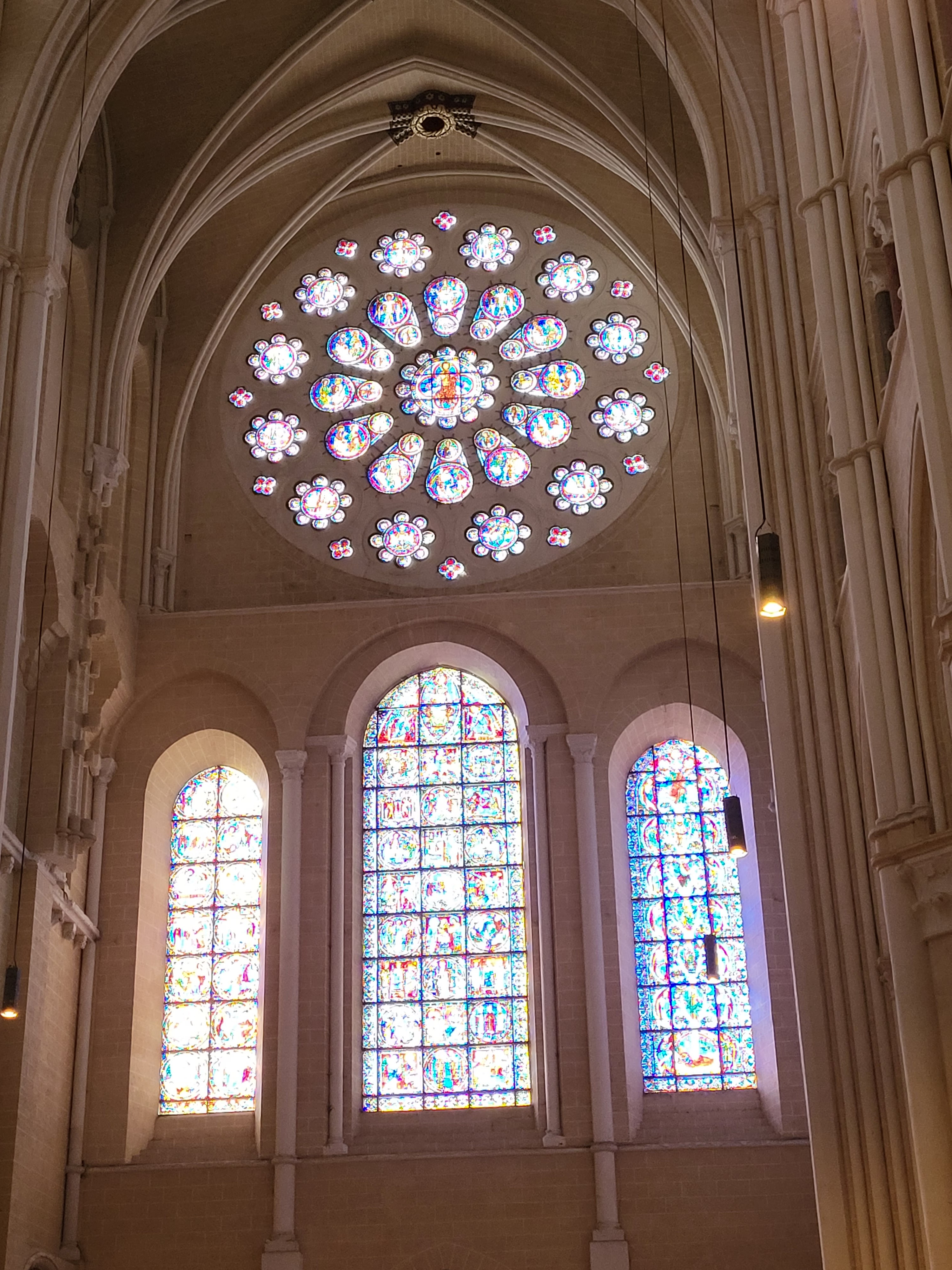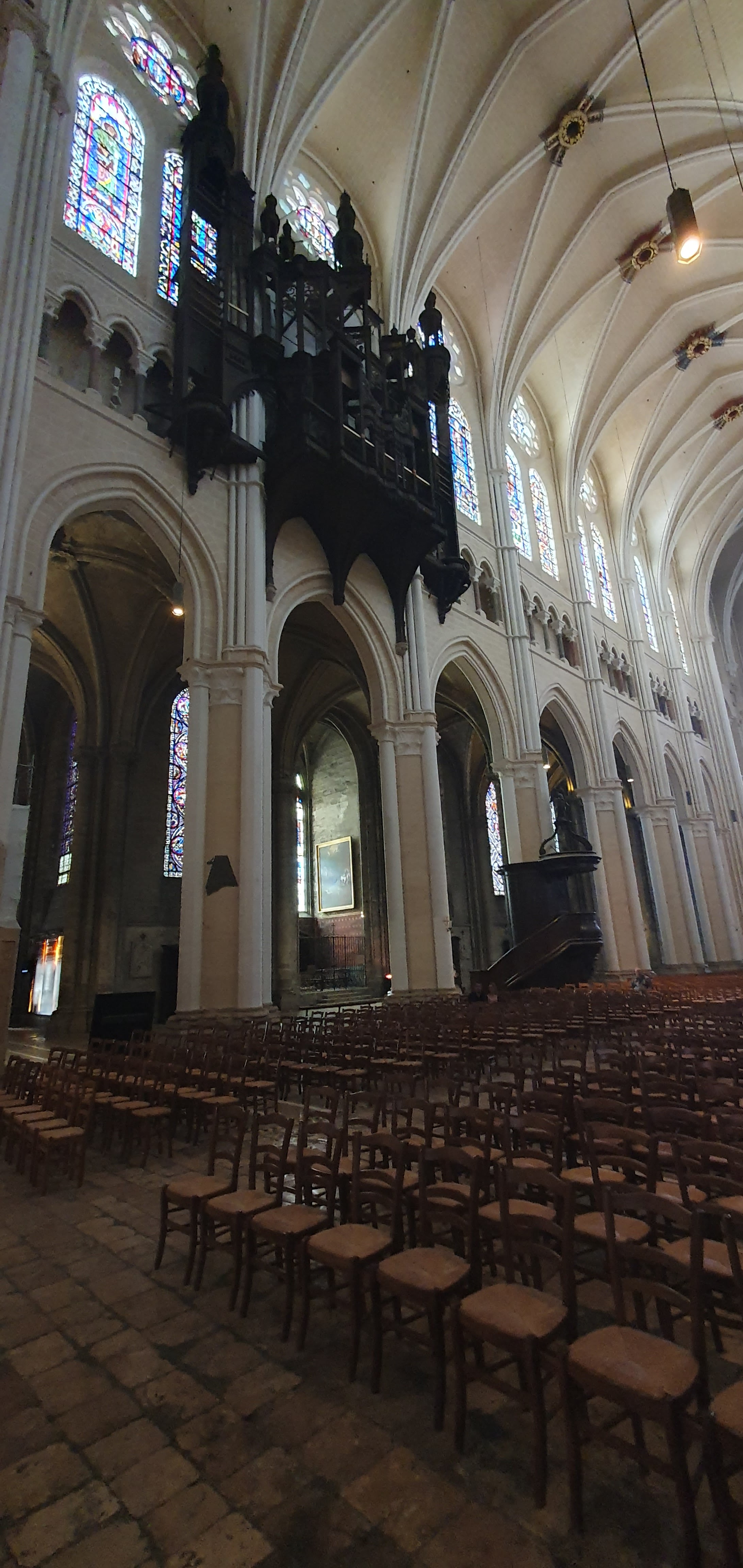 Tout d'abord vous êtes pris par les hauteurs, la richesse et la conservation des vitraux , puis se qui frappe se sont les détails et le nombres des sculptures en pierres ,je suis admirative des travaux des artisans de l'époque. Certaine période révolution ont laissés des traces non réparables ( têtes et mains coupés) . Les travaux discrait ,vous font réapparaître la pierre blanche . Le labyrinthe , comme à la cathédrale d'Amiens est visible malgré les chaises .