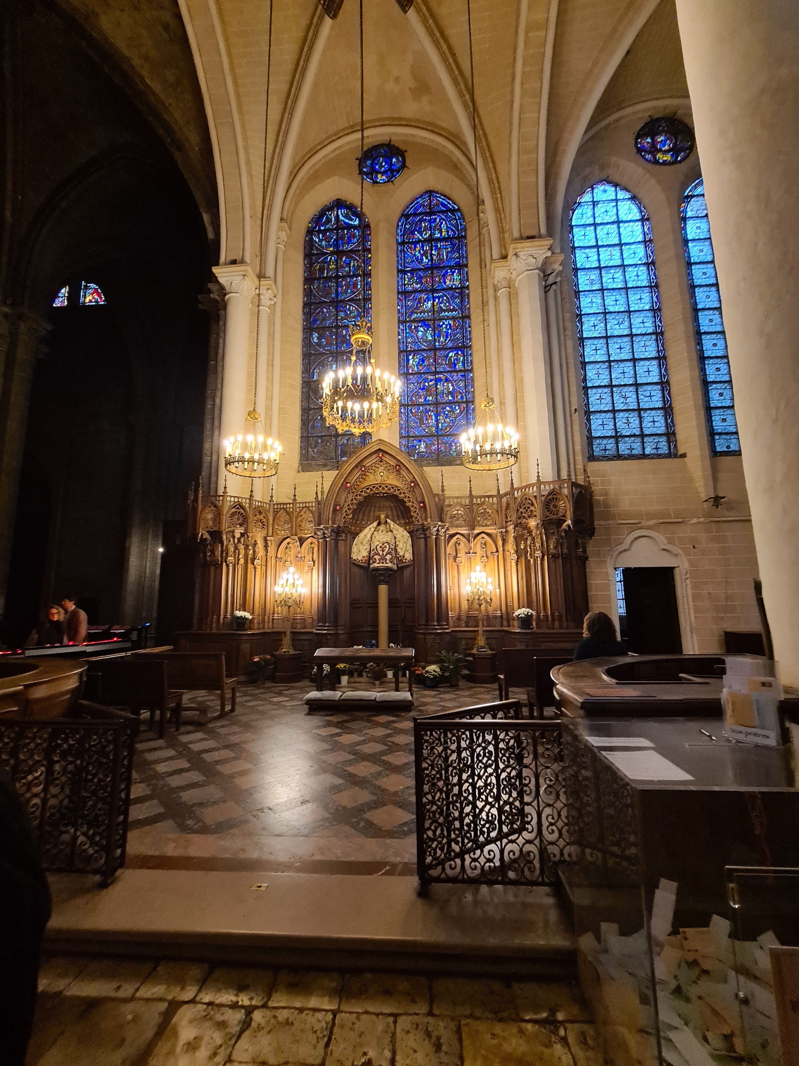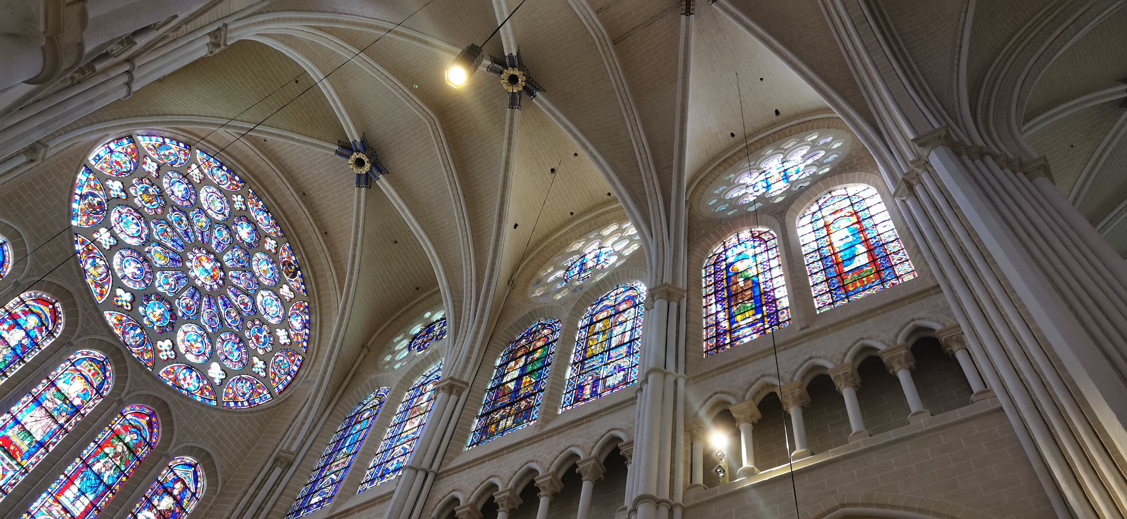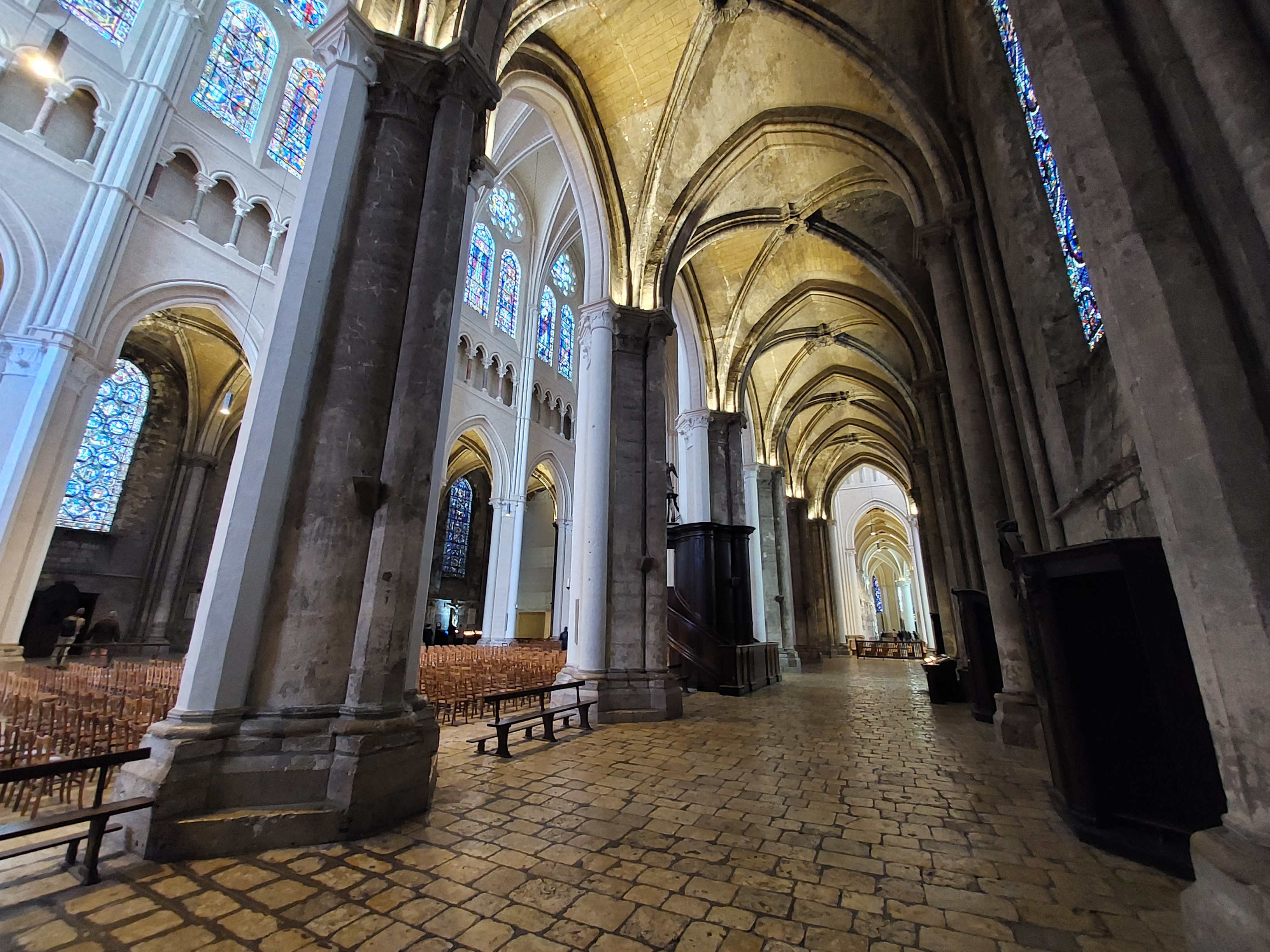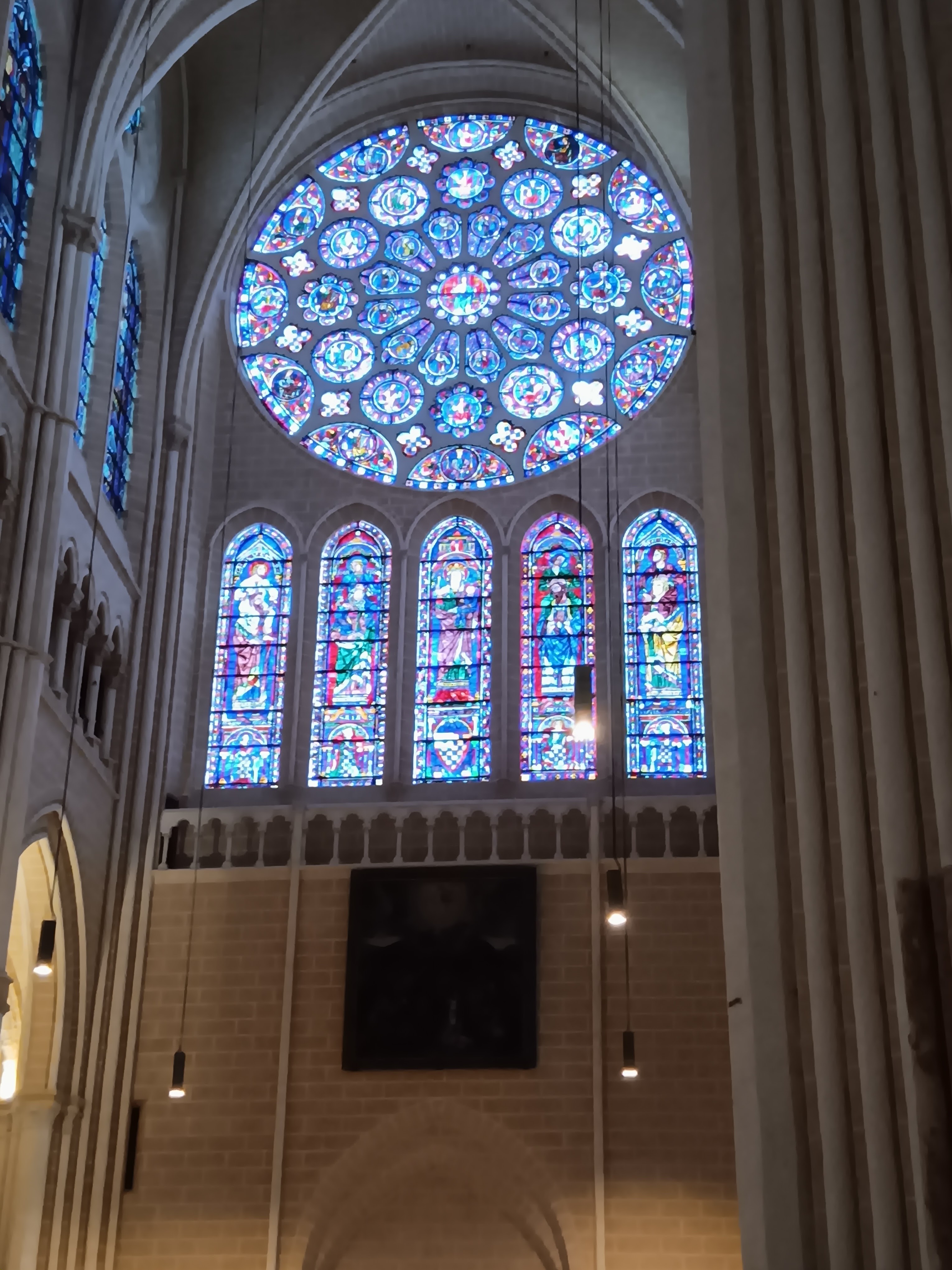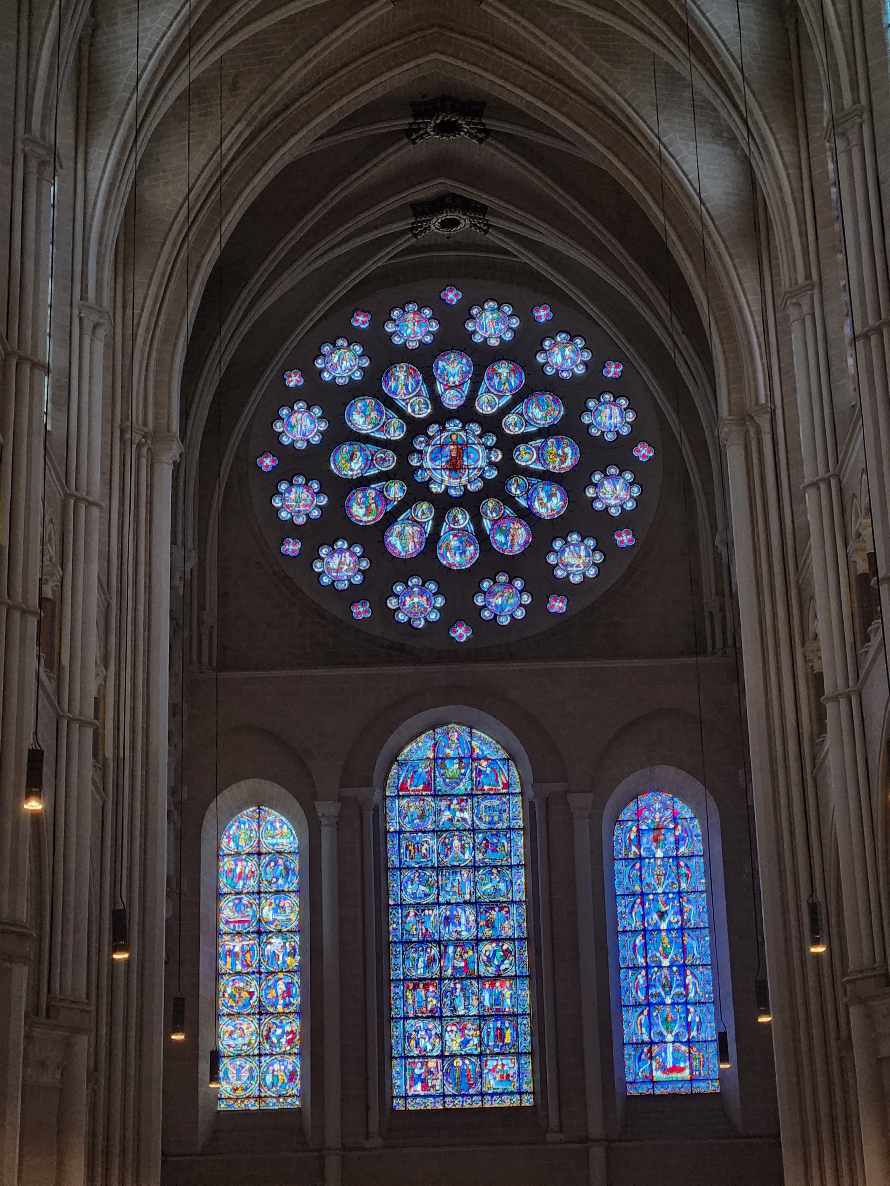 Tout d'abord vous êtes pris par les hauteurs, la richesse et la conservation des vitraux , puis se qui frappe se sont les détails et le nombres des sculptures en pierres ,je suis admirative des travaux des artisans de l'époque. Certaine période révolution ont laissés des traces non réparables ( têtes et mains coupés) . Les travaux discrait ,vous font réapparaître la pierre blanche . Le labyrinthe , comme à la cathédrale d'Amiens est visible malgré les chaises .