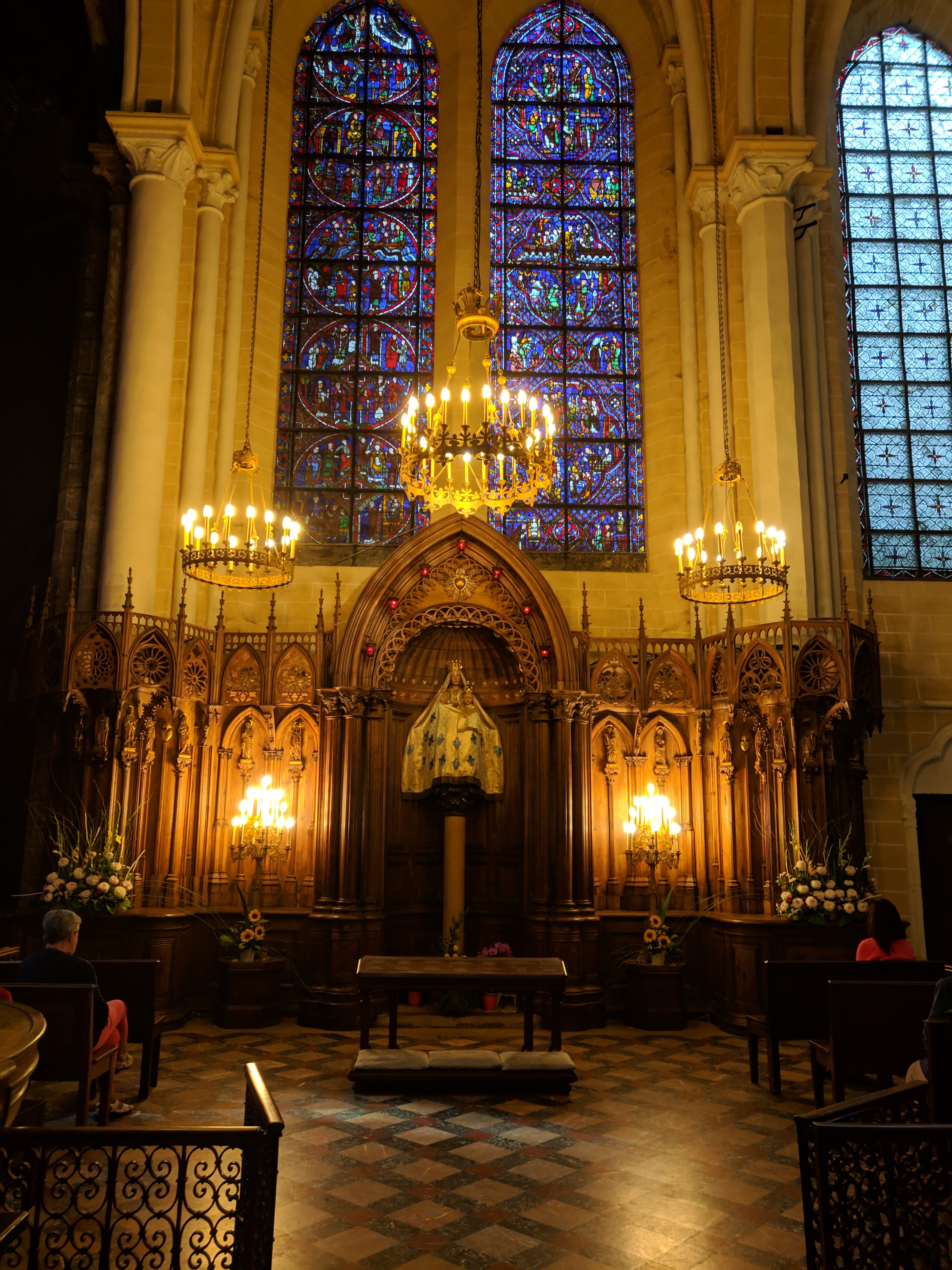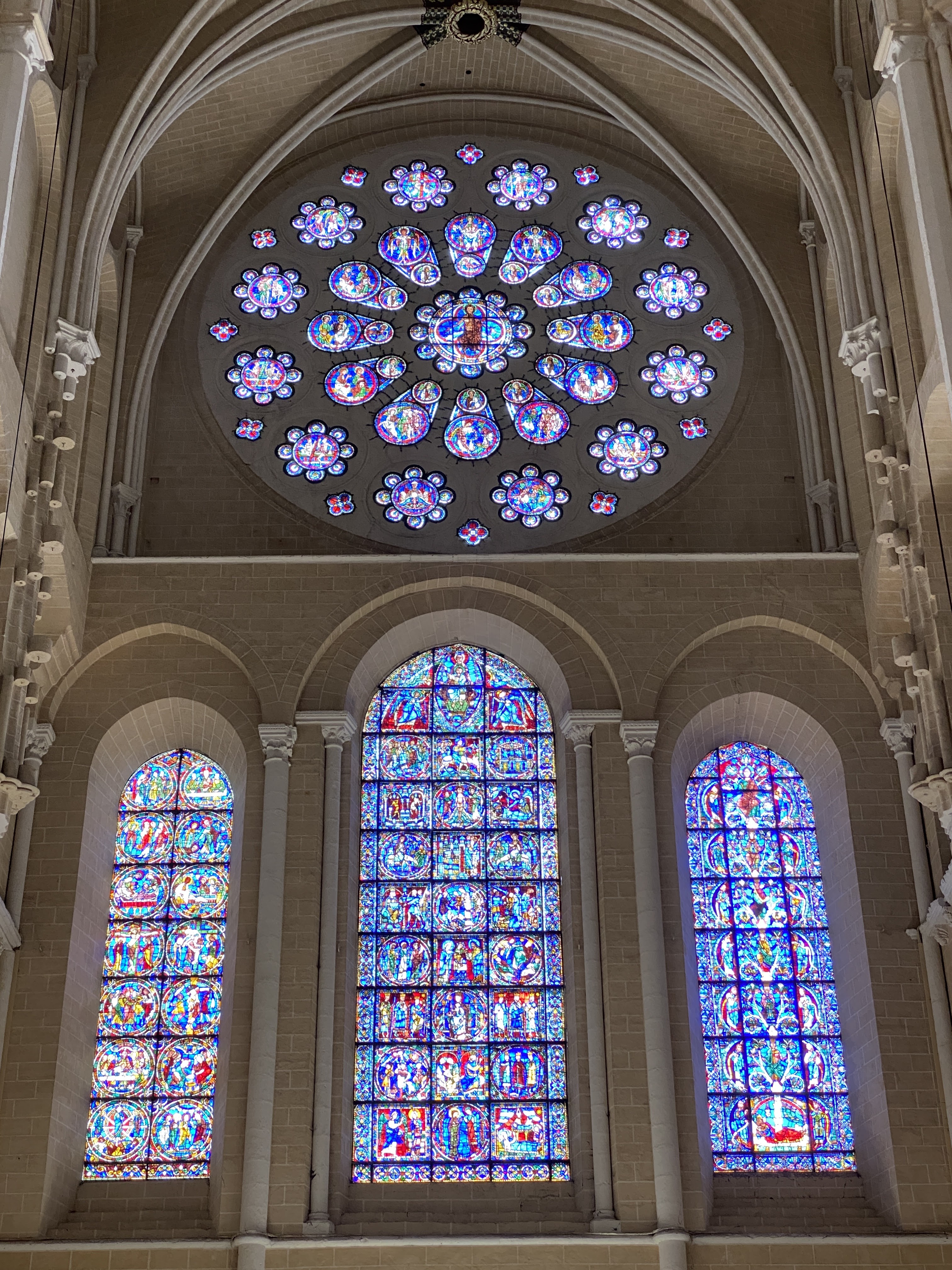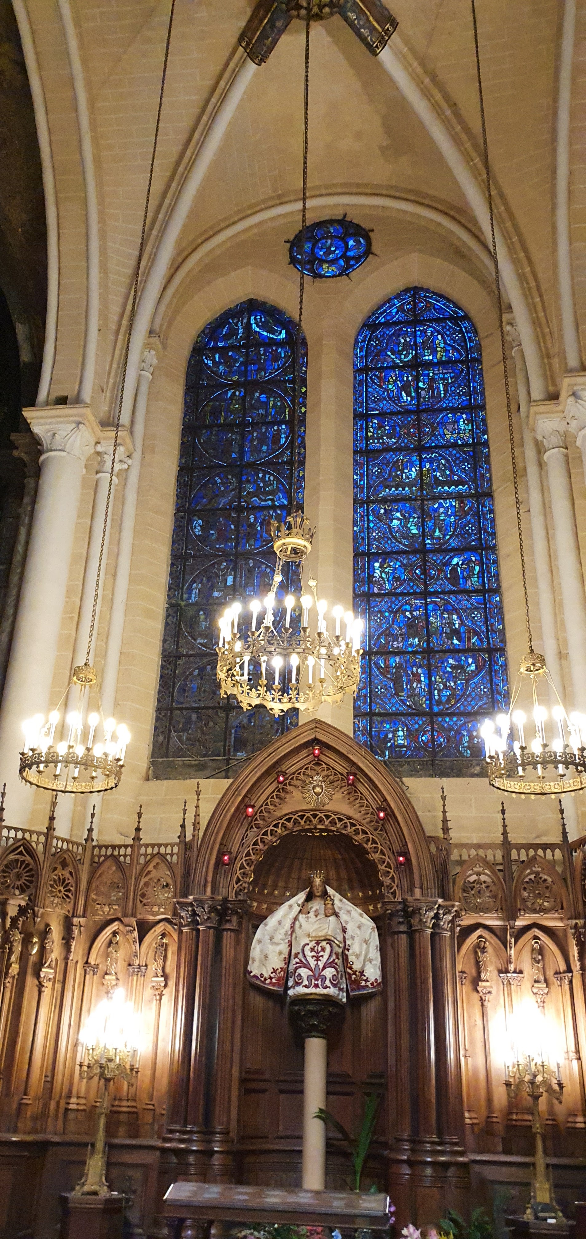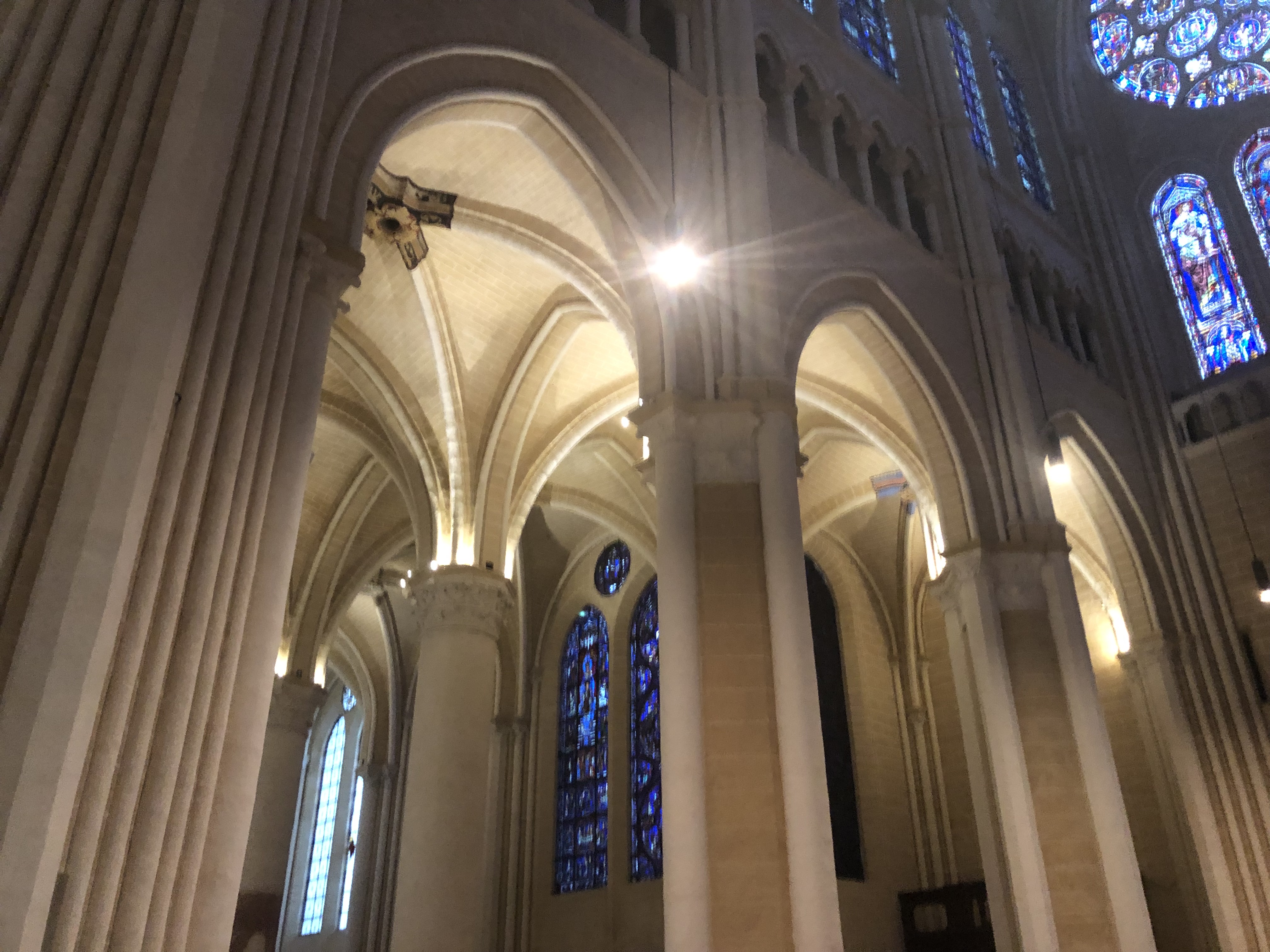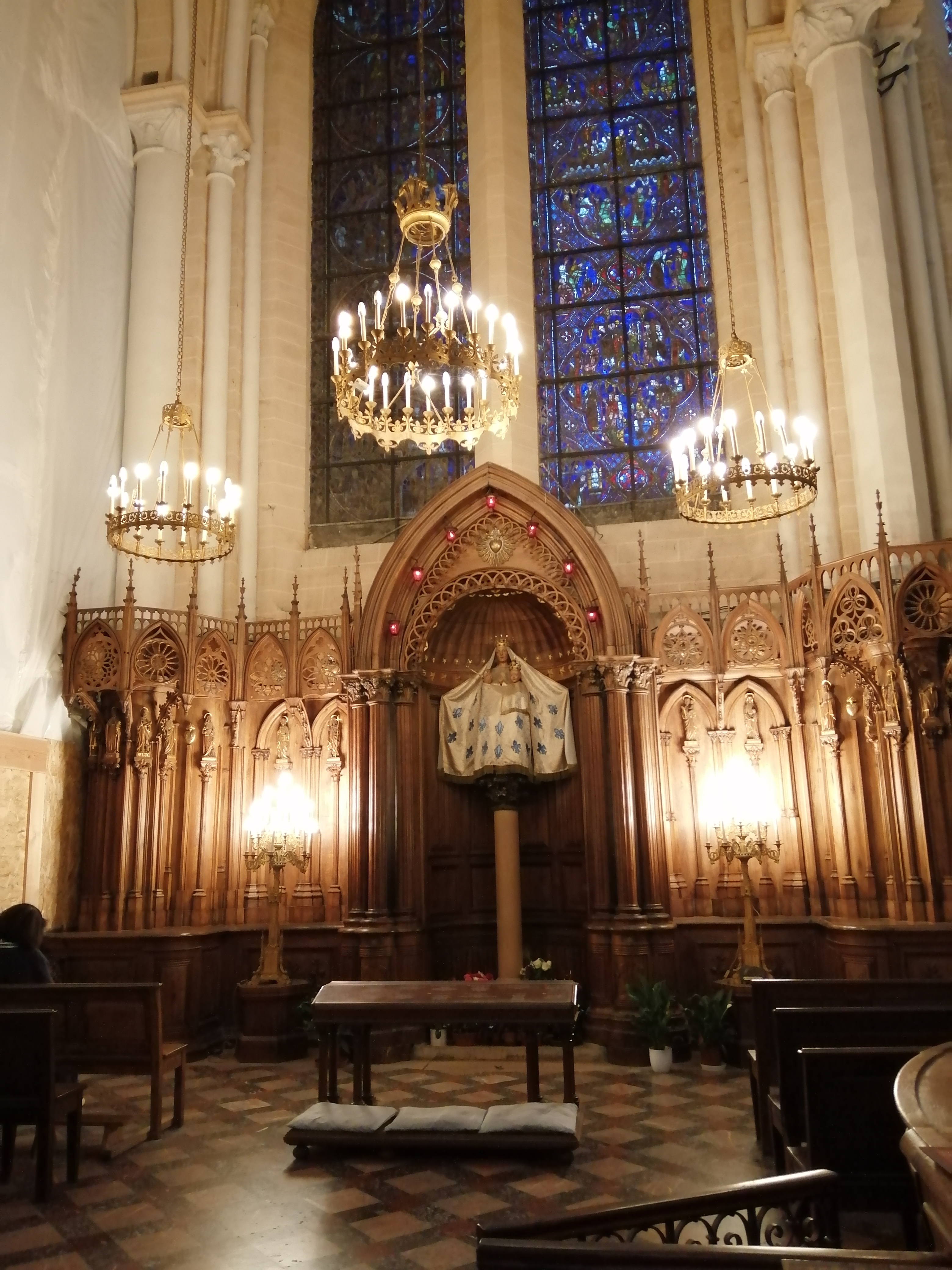 Tout d'abord vous êtes pris par les hauteurs, la richesse et la conservation des vitraux , puis se qui frappe se sont les détails et le nombres des sculptures en pierres ,je suis admirative des travaux des artisans de l'époque. Certaine période révolution ont laissés des traces non réparables ( têtes et mains coupés) . Les travaux discrait ,vous font réapparaître la pierre blanche . Le labyrinthe , comme à la cathédrale d'Amiens est visible malgré les chaises .