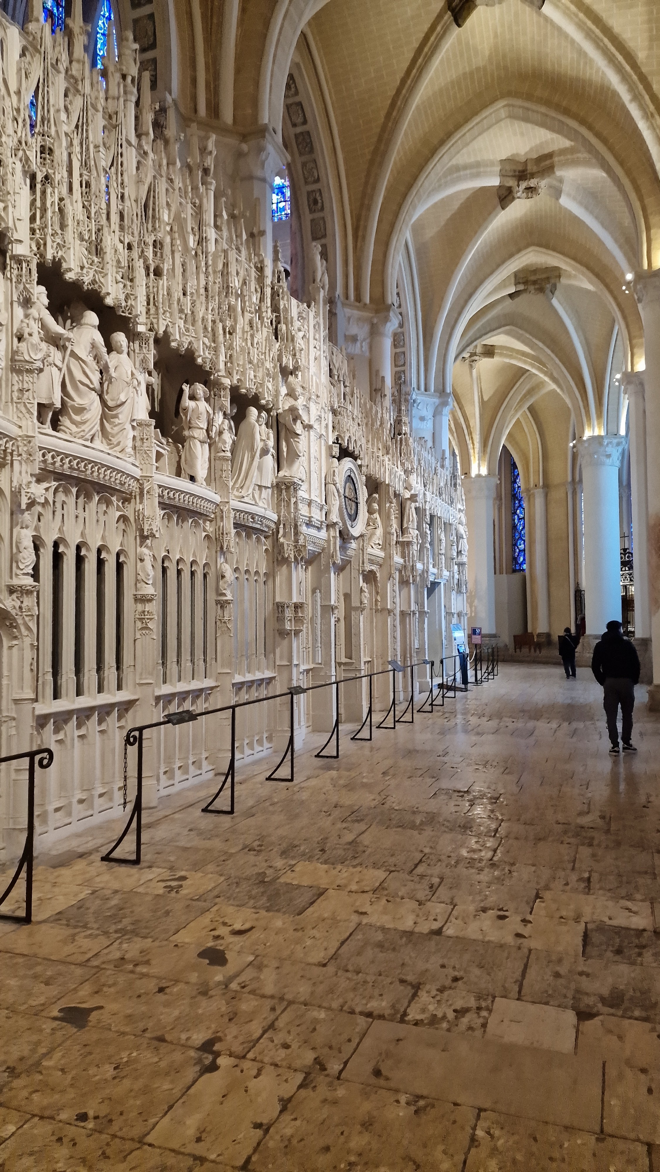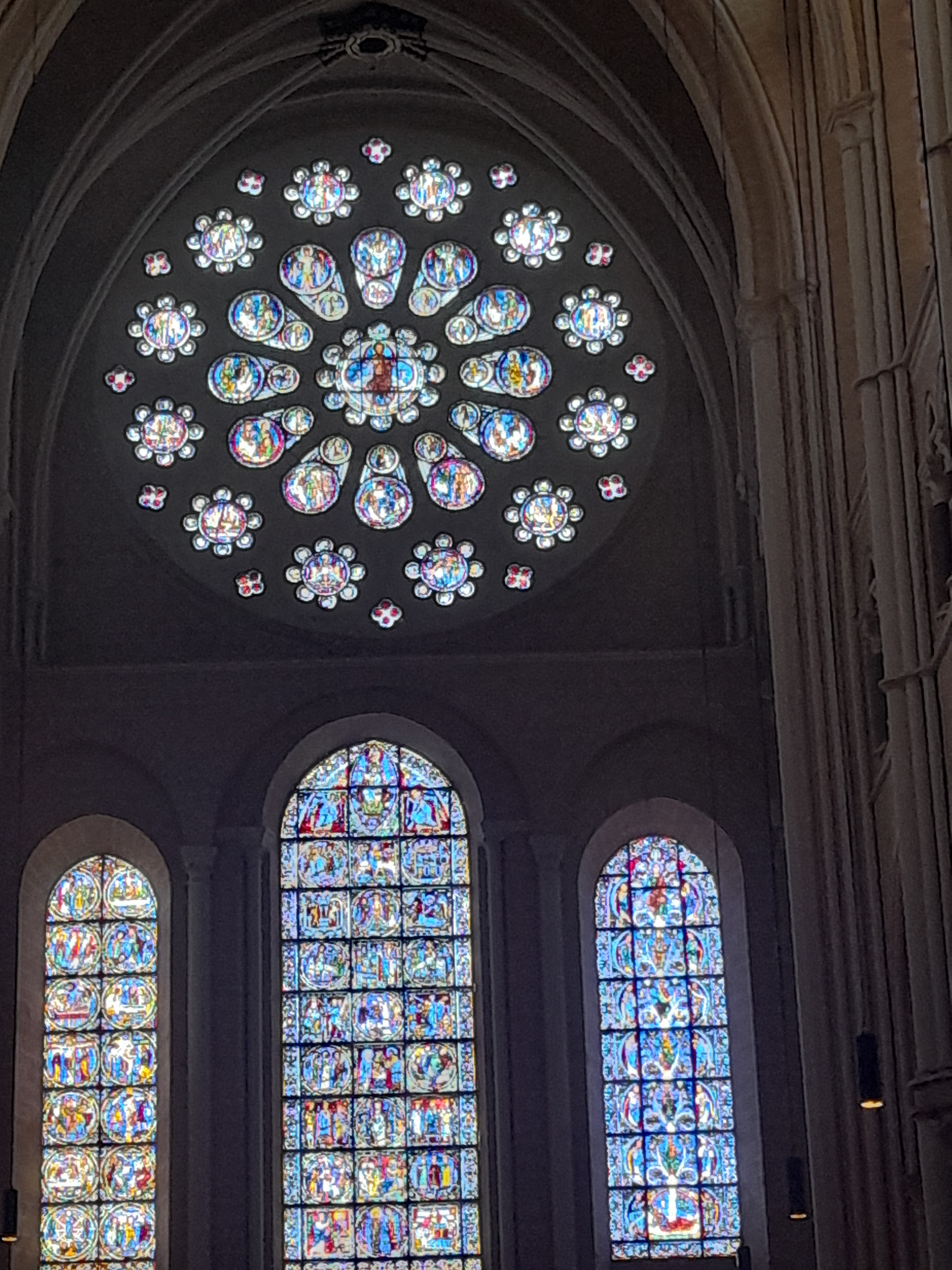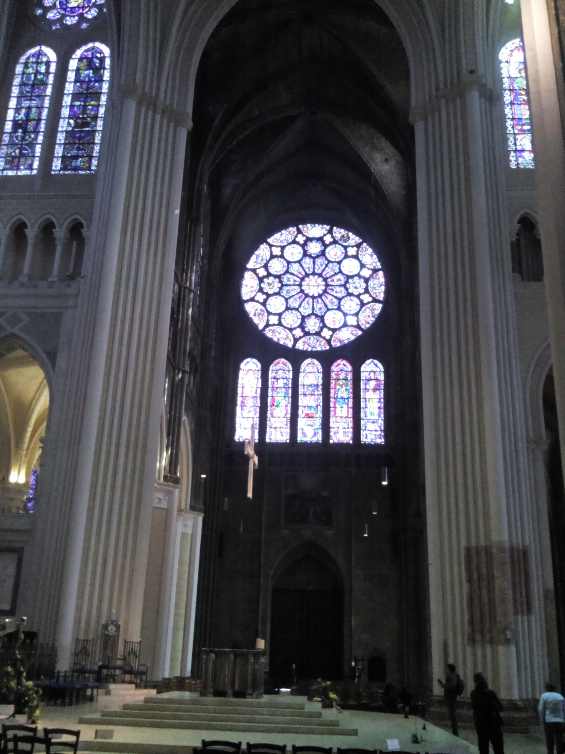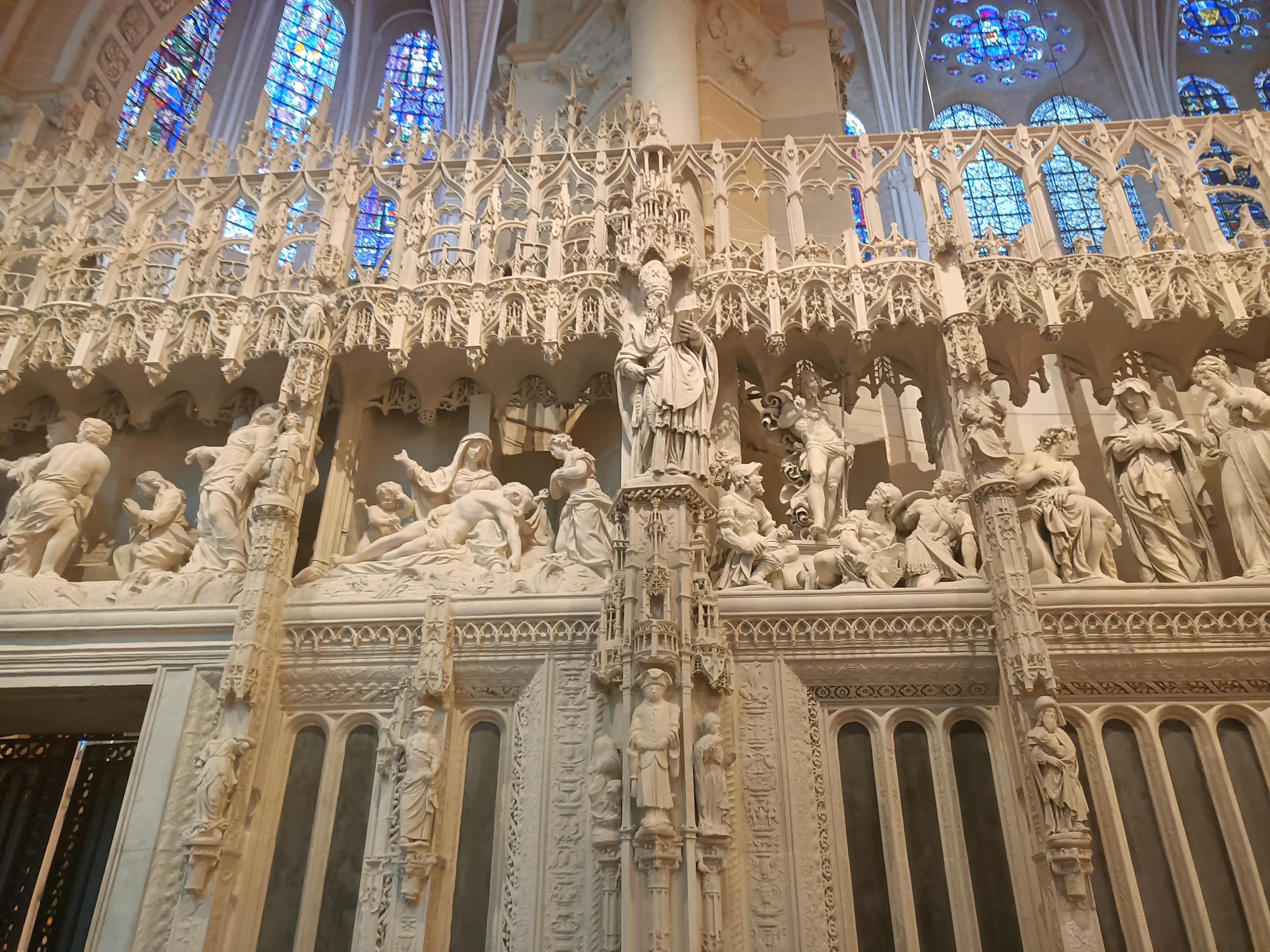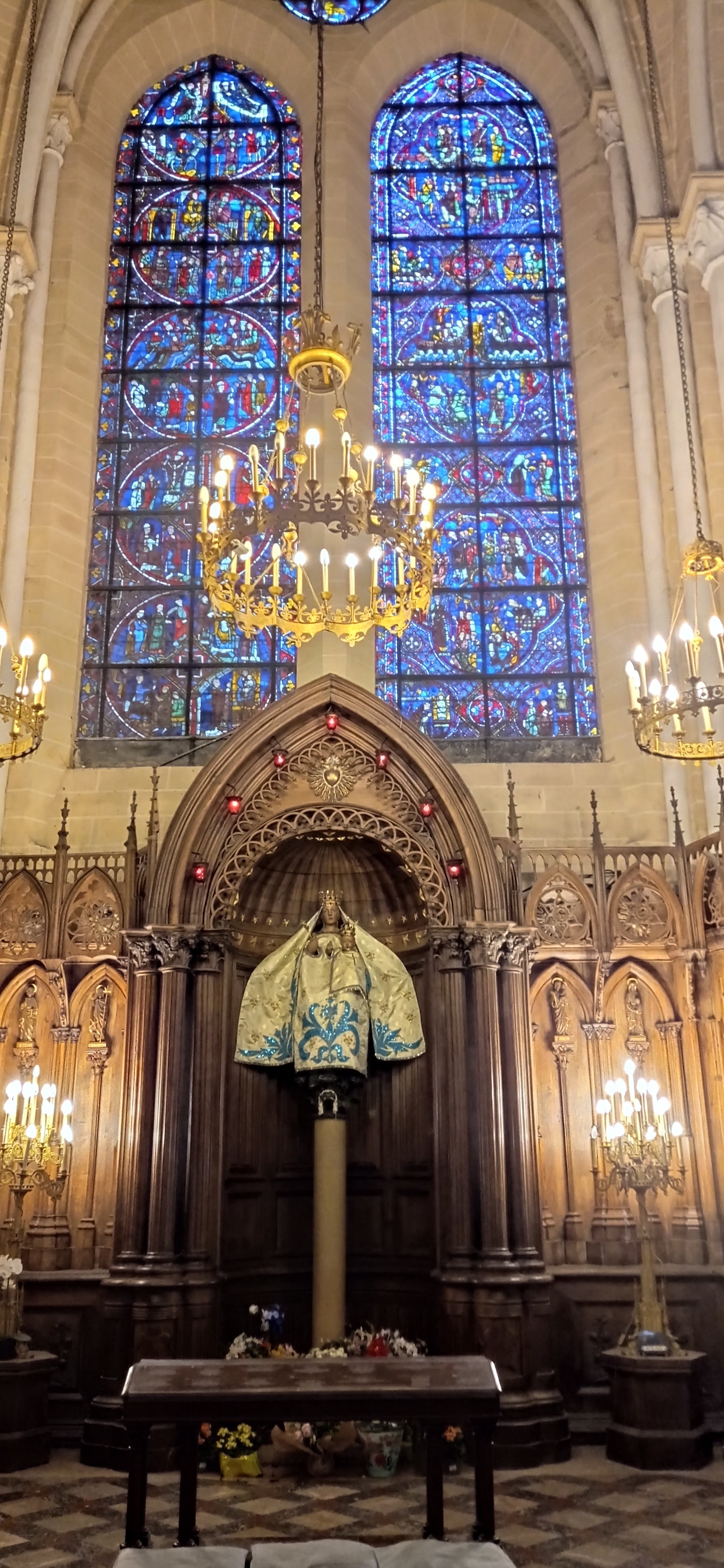 Tout d'abord vous êtes pris par les hauteurs, la richesse et la conservation des vitraux , puis se qui frappe se sont les détails et le nombres des sculptures en pierres ,je suis admirative des travaux des artisans de l'époque. Certaine période révolution ont laissés des traces non réparables ( têtes et mains coupés) . Les travaux discrait ,vous font réapparaître la pierre blanche . Le labyrinthe , comme à la cathédrale d'Amiens est visible malgré les chaises .