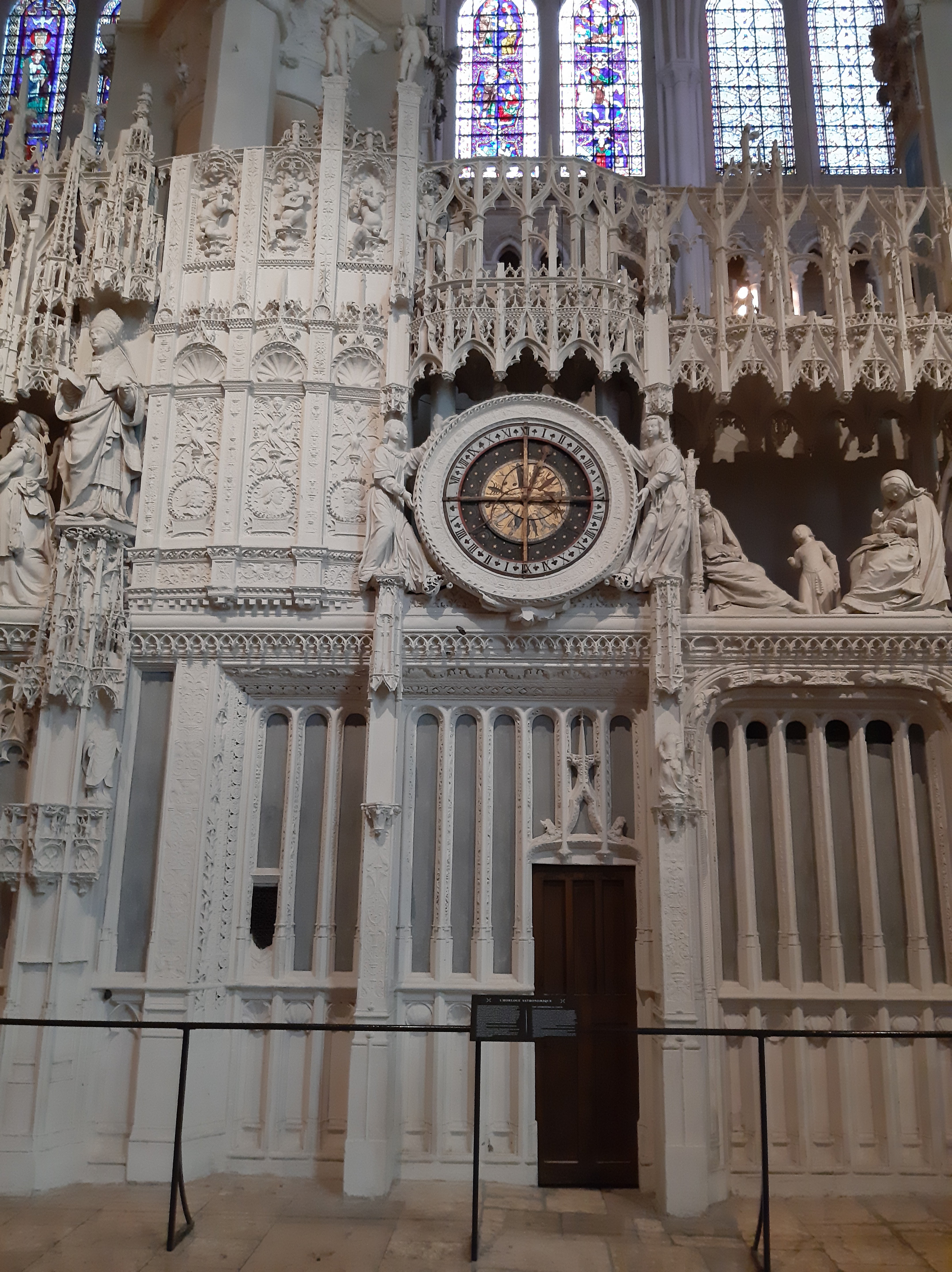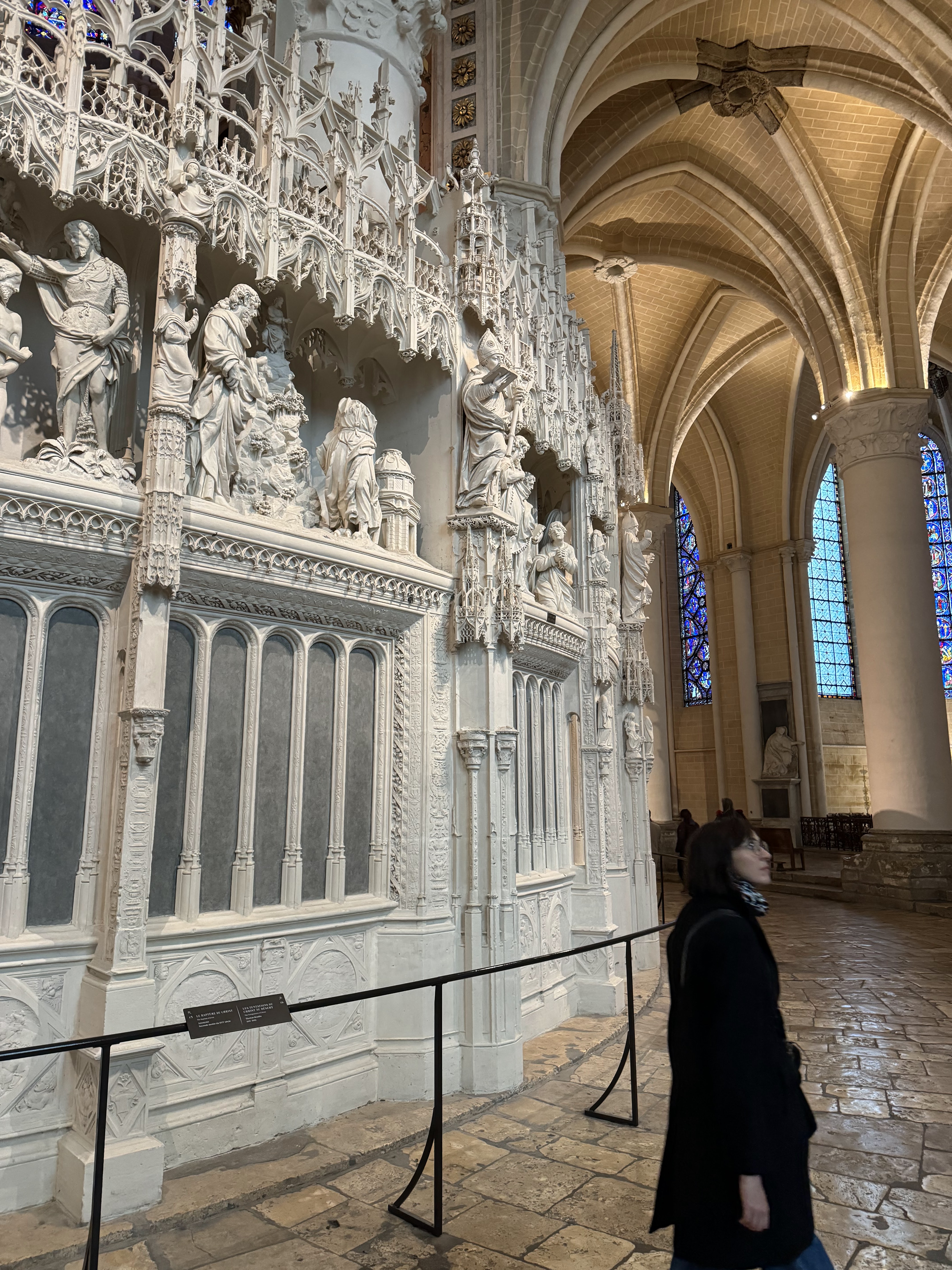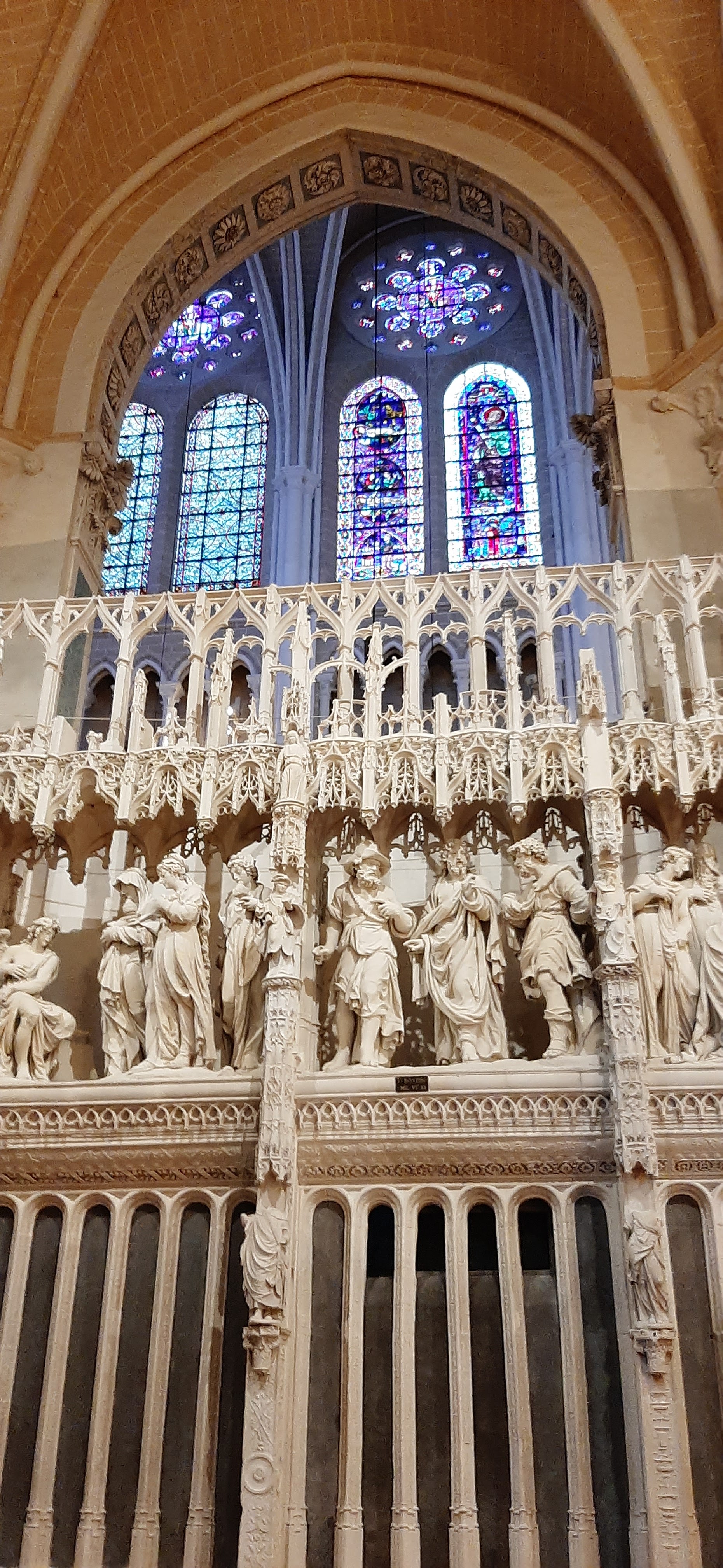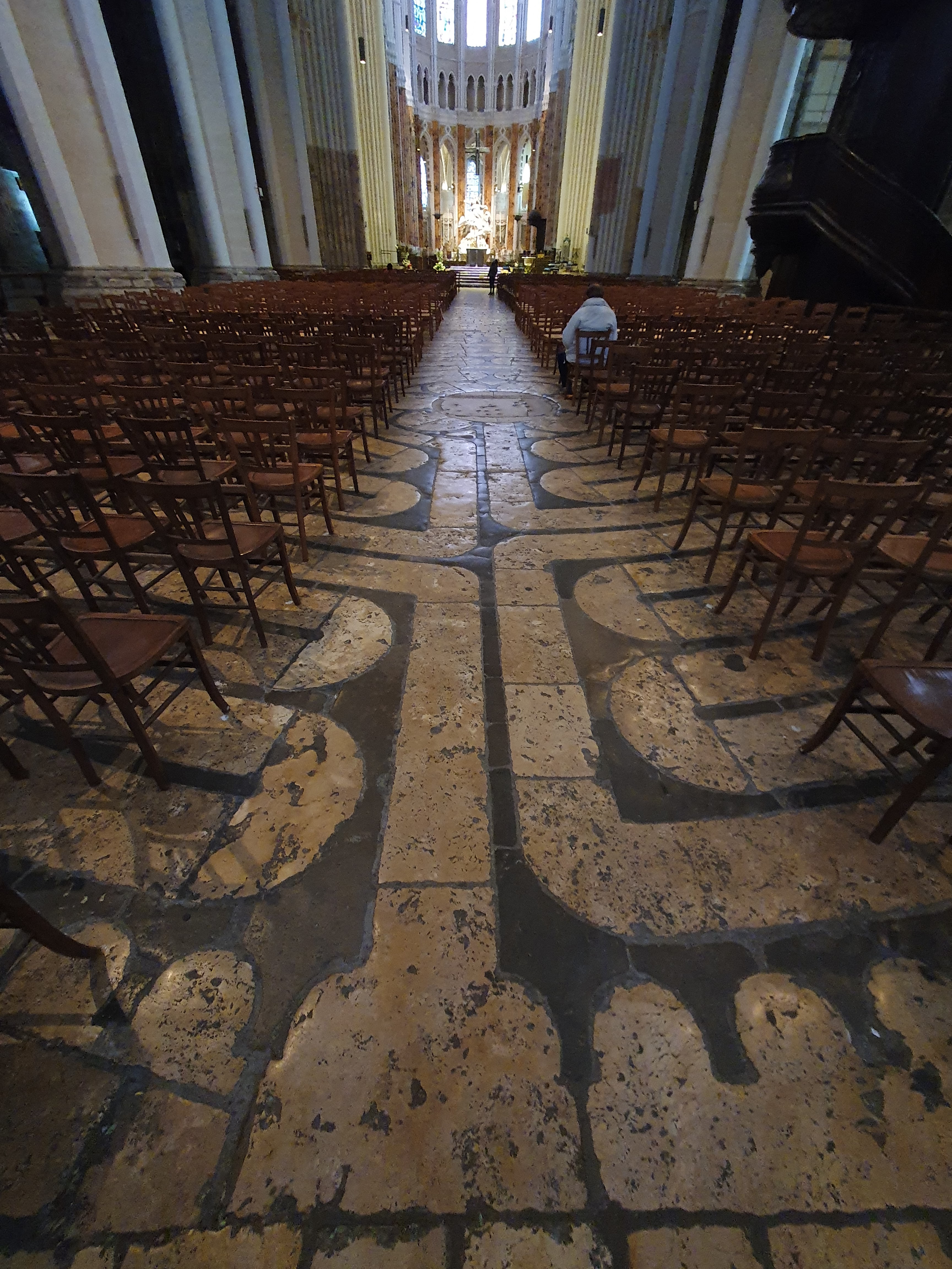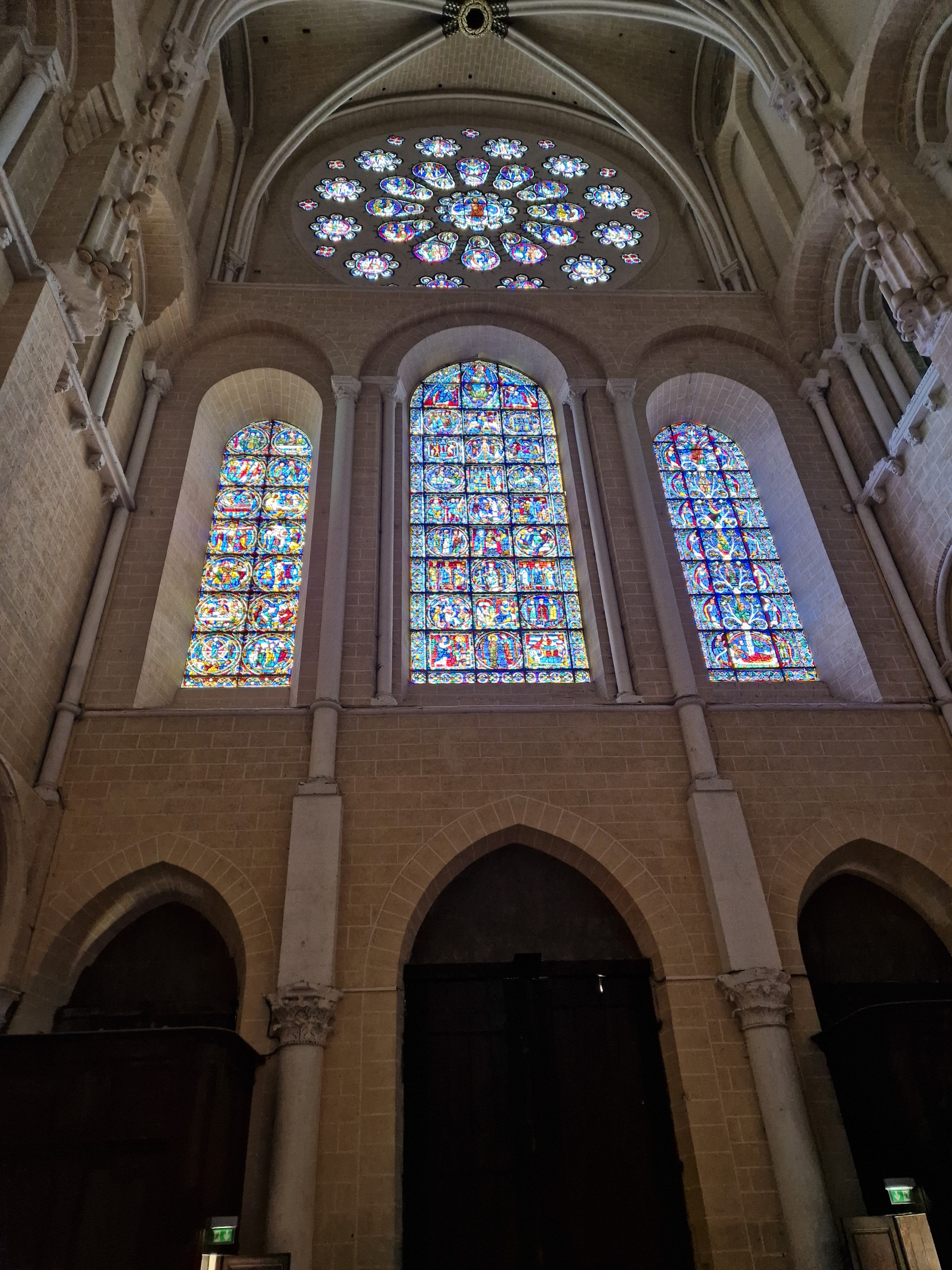 Tout d'abord vous êtes pris par les hauteurs, la richesse et la conservation des vitraux , puis se qui frappe se sont les détails et le nombres des sculptures en pierres ,je suis admirative des travaux des artisans de l'époque. Certaine période révolution ont laissés des traces non réparables ( têtes et mains coupés) . Les travaux discrait ,vous font réapparaître la pierre blanche . Le labyrinthe , comme à la cathédrale d'Amiens est visible malgré les chaises .