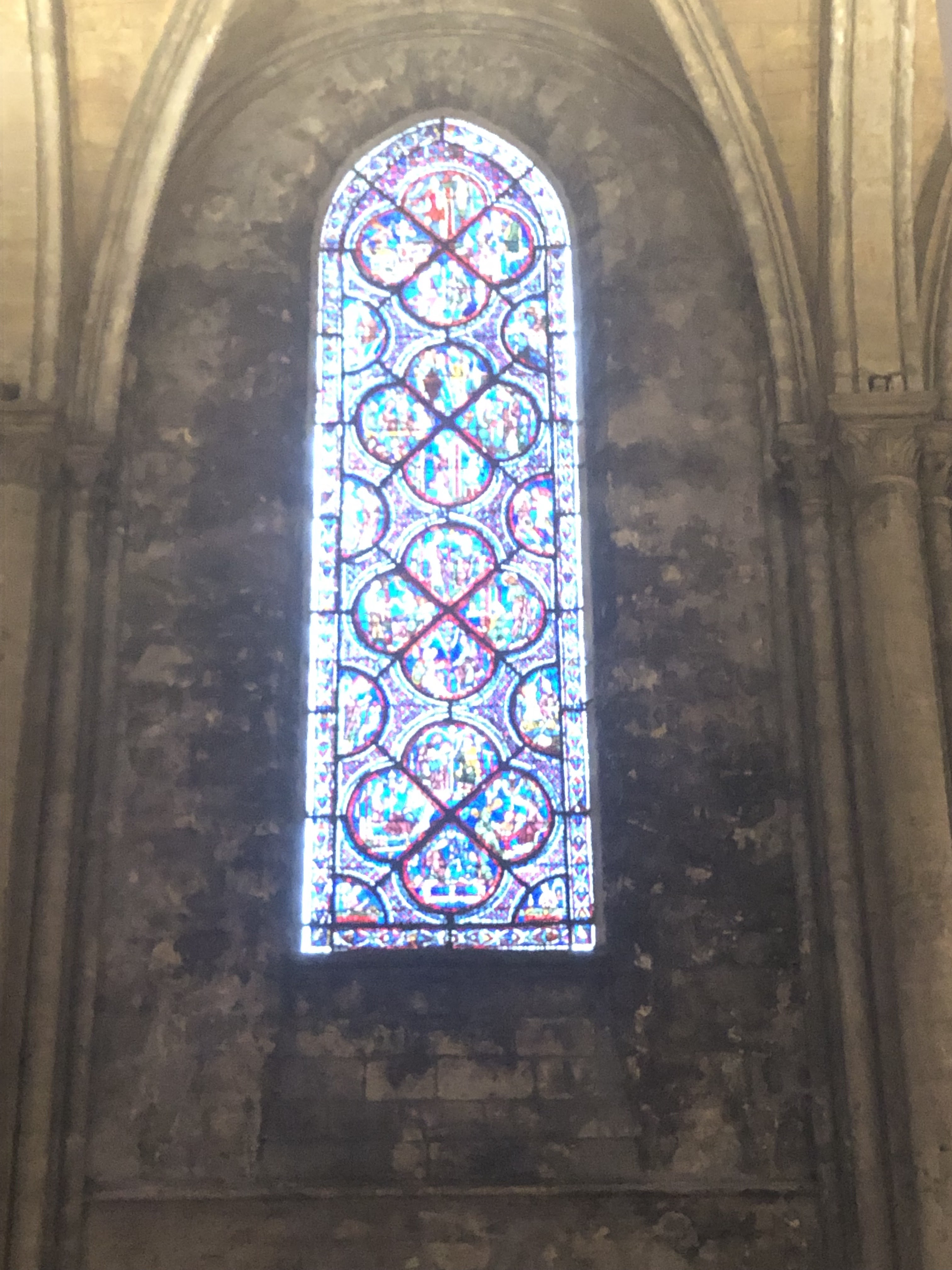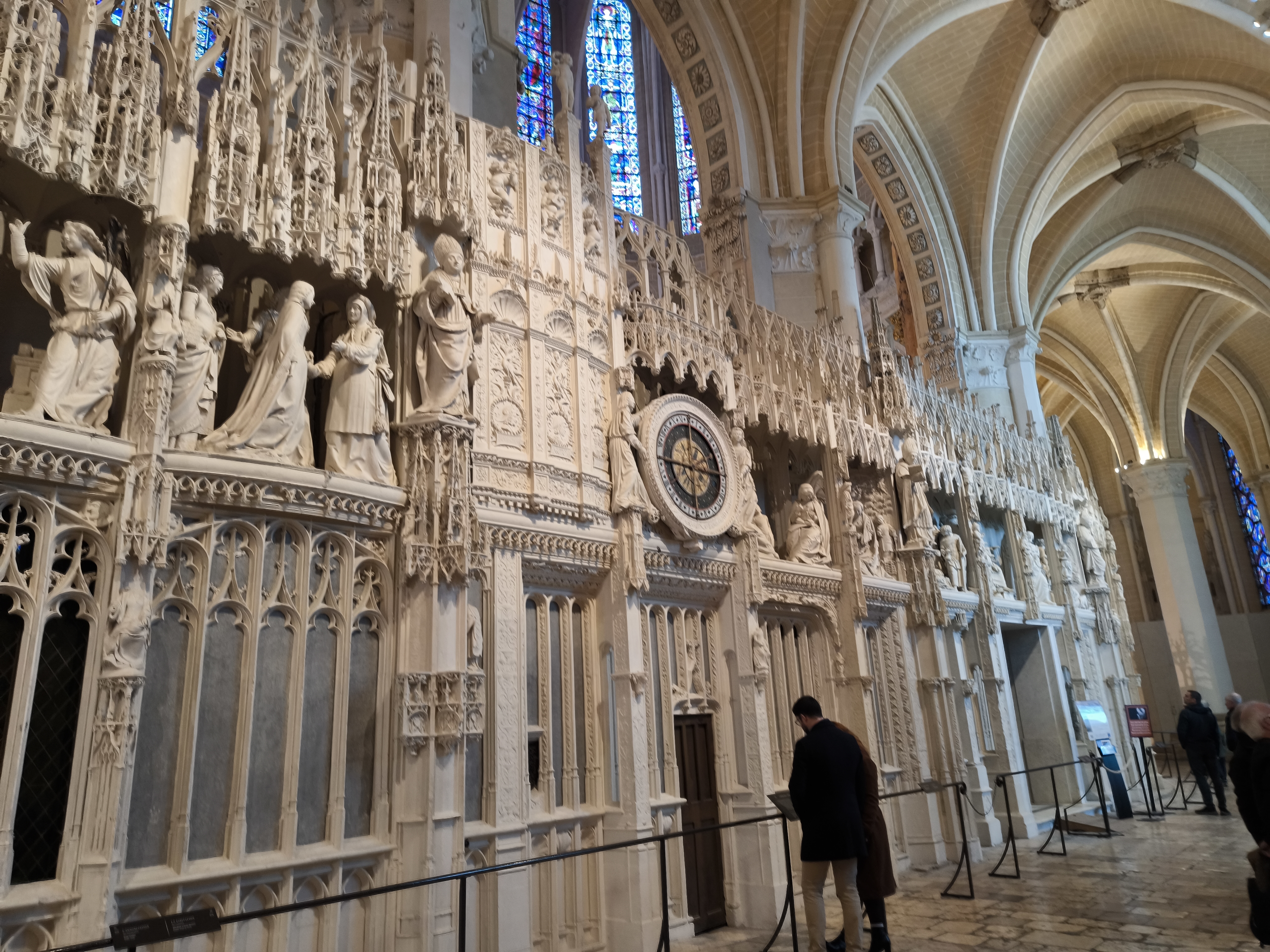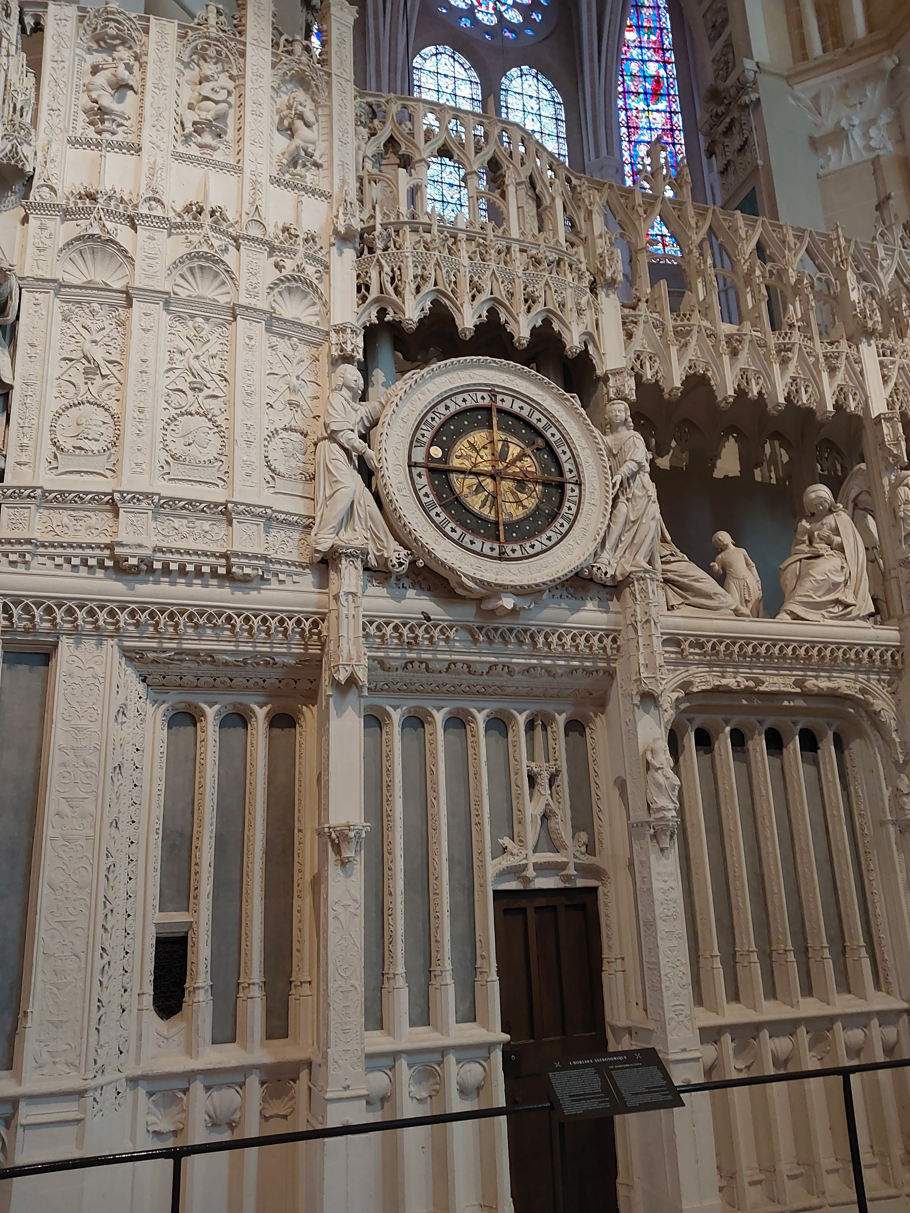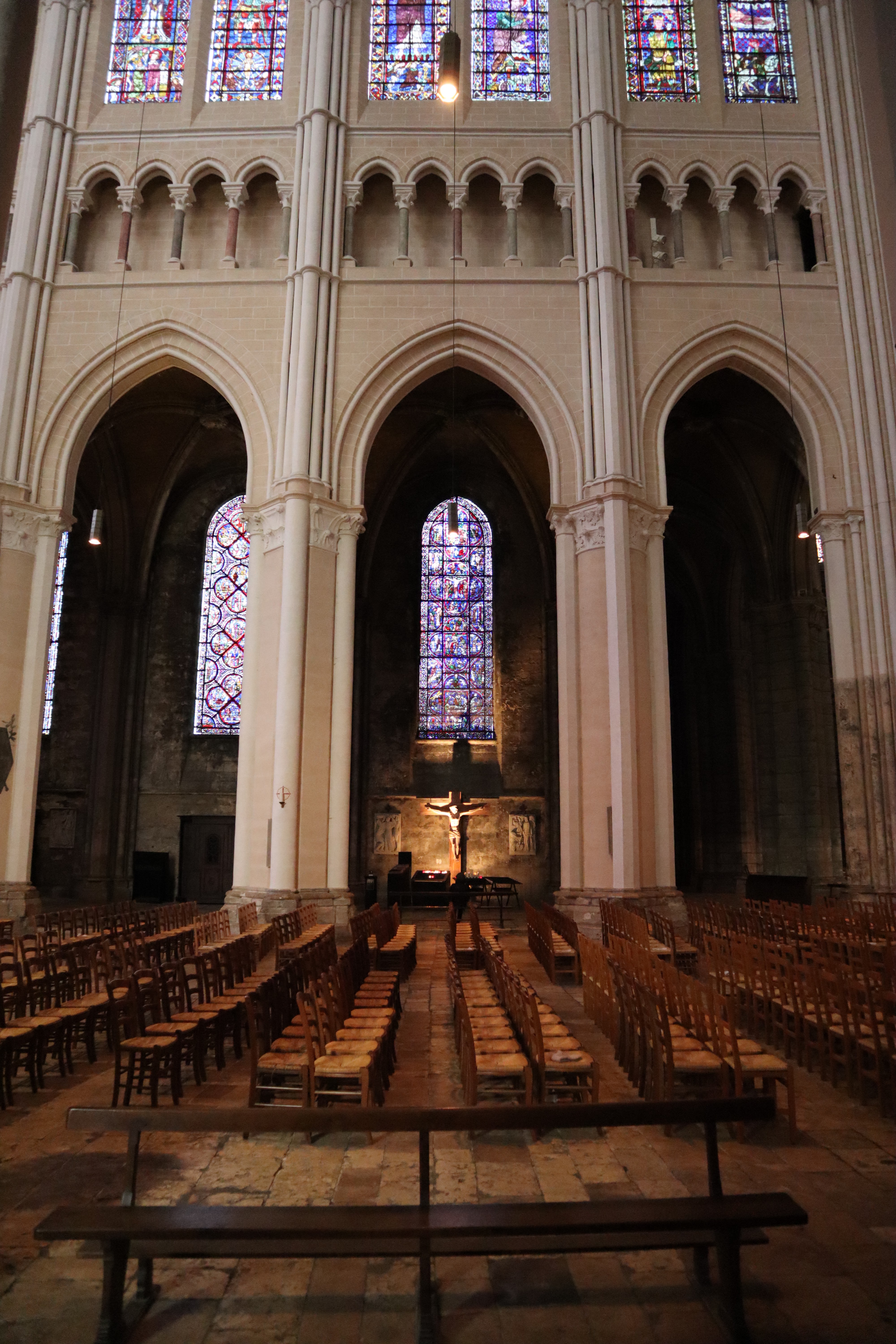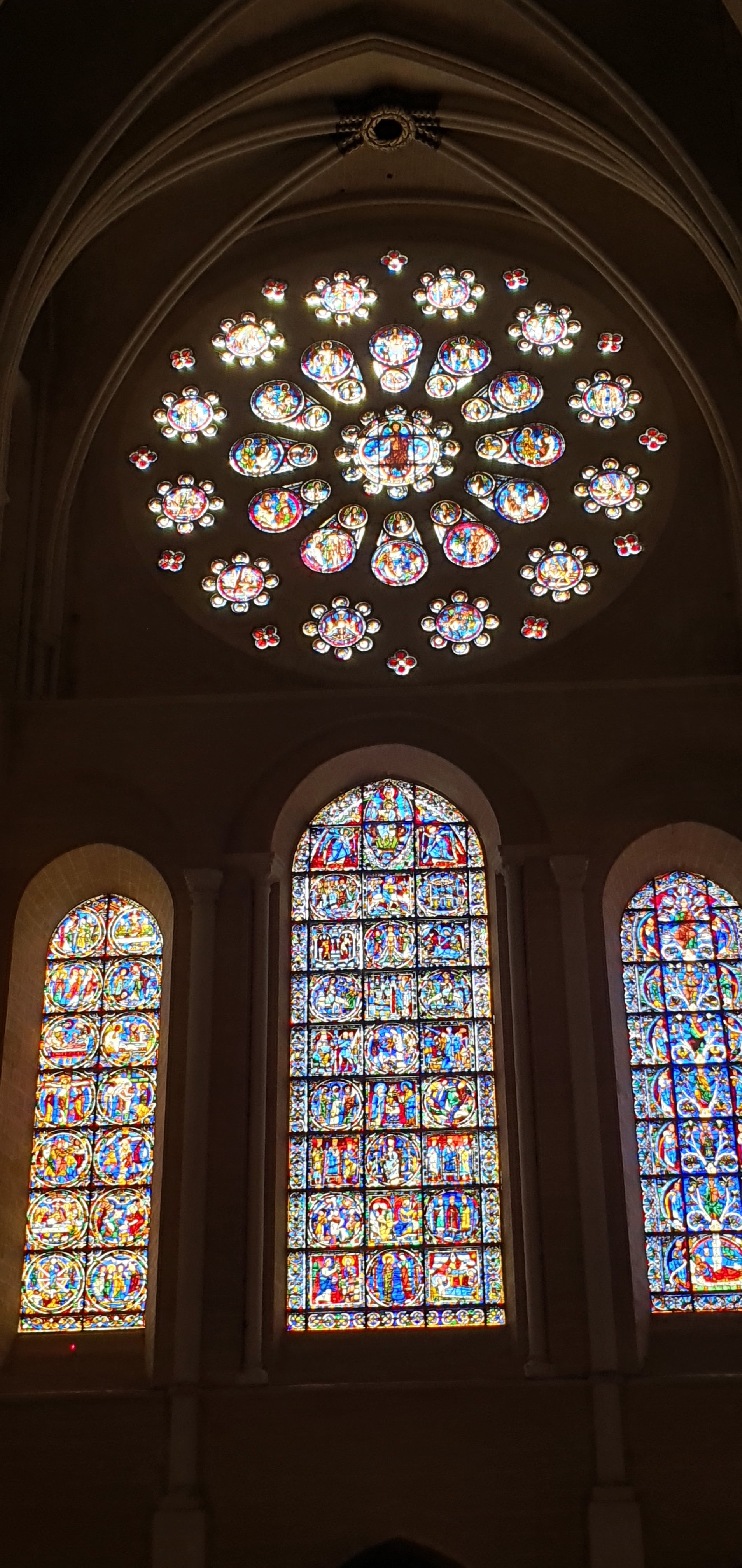 Tout d'abord vous êtes pris par les hauteurs, la richesse et la conservation des vitraux , puis se qui frappe se sont les détails et le nombres des sculptures en pierres ,je suis admirative des travaux des artisans de l'époque. Certaine période révolution ont laissés des traces non réparables ( têtes et mains coupés) . Les travaux discrait ,vous font réapparaître la pierre blanche . Le labyrinthe , comme à la cathédrale d'Amiens est visible malgré les chaises .