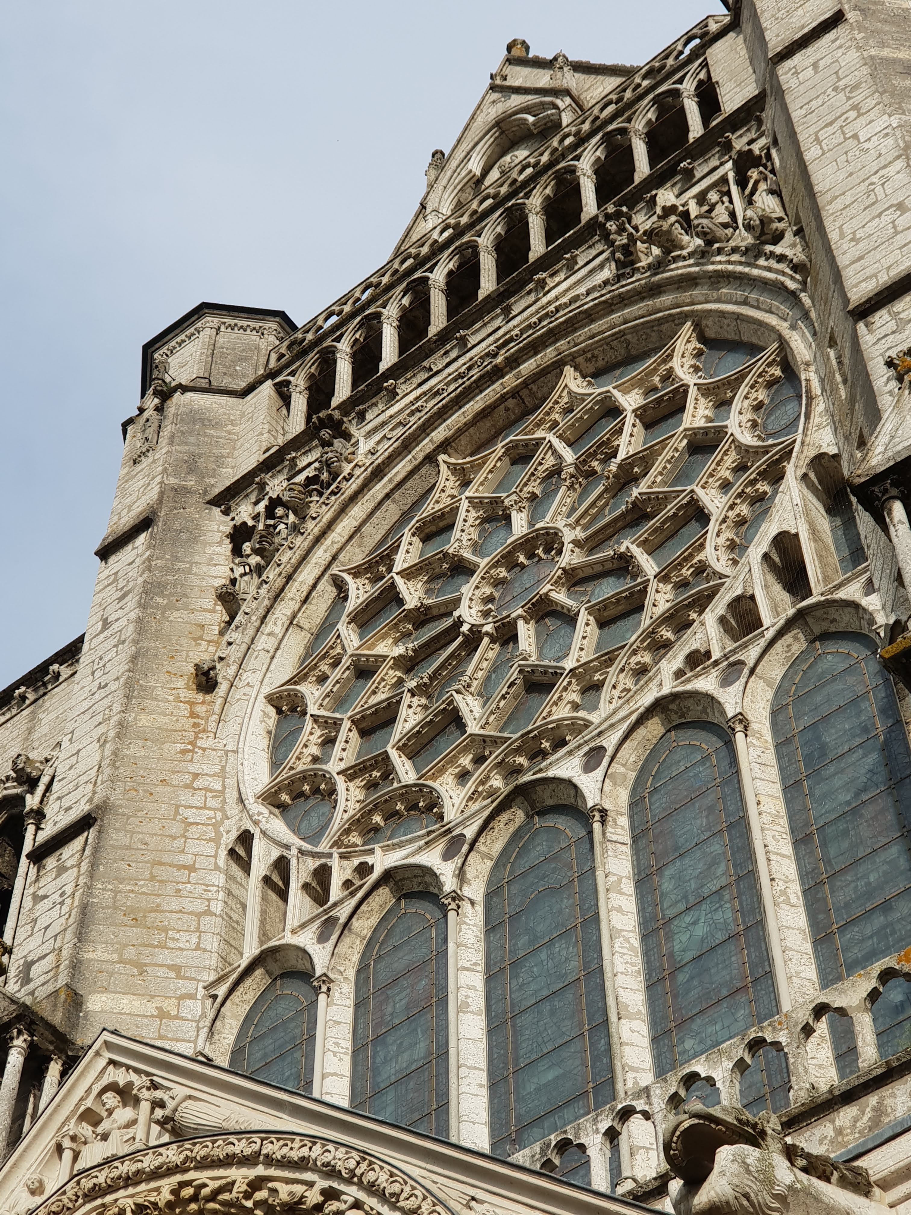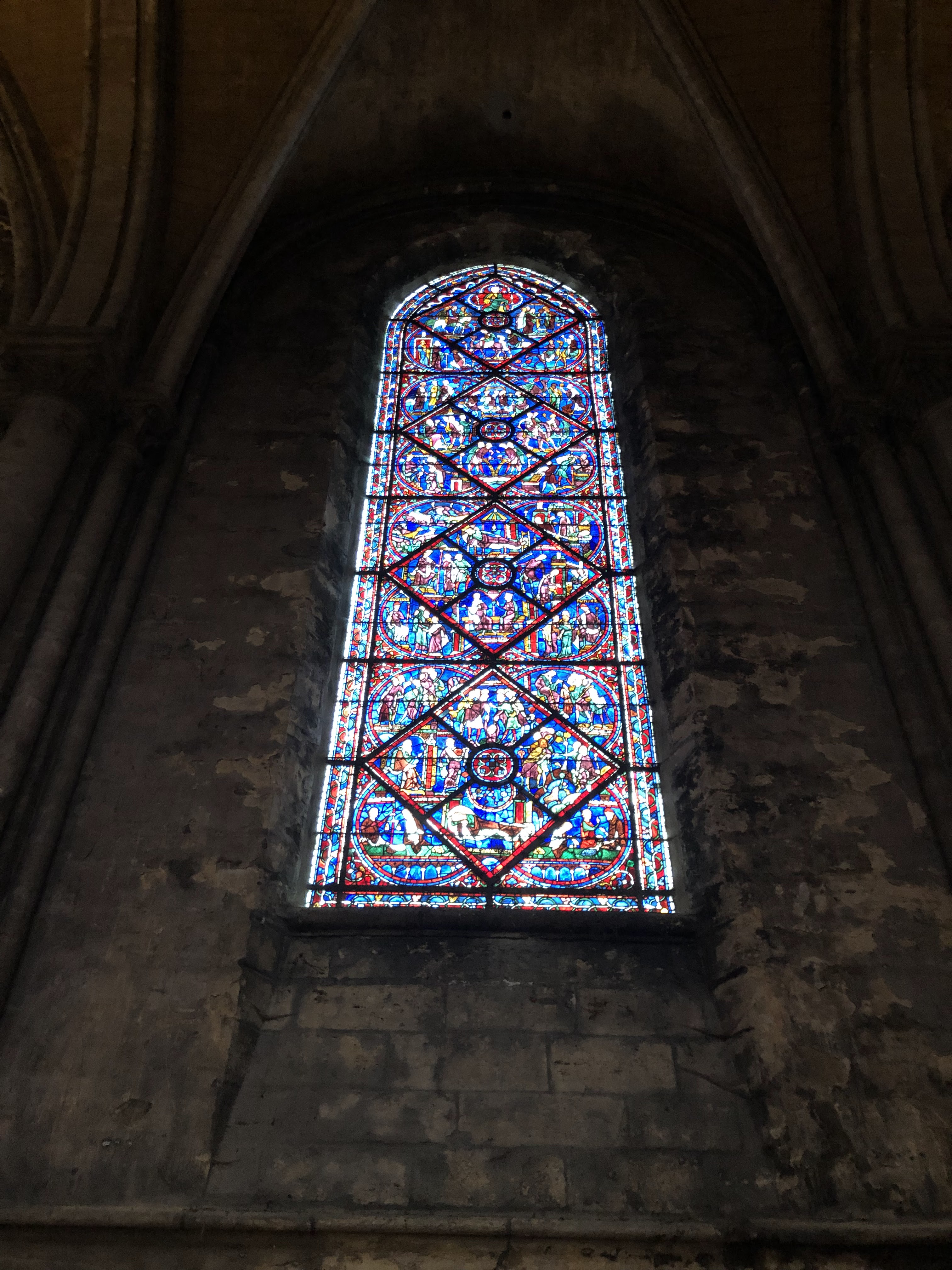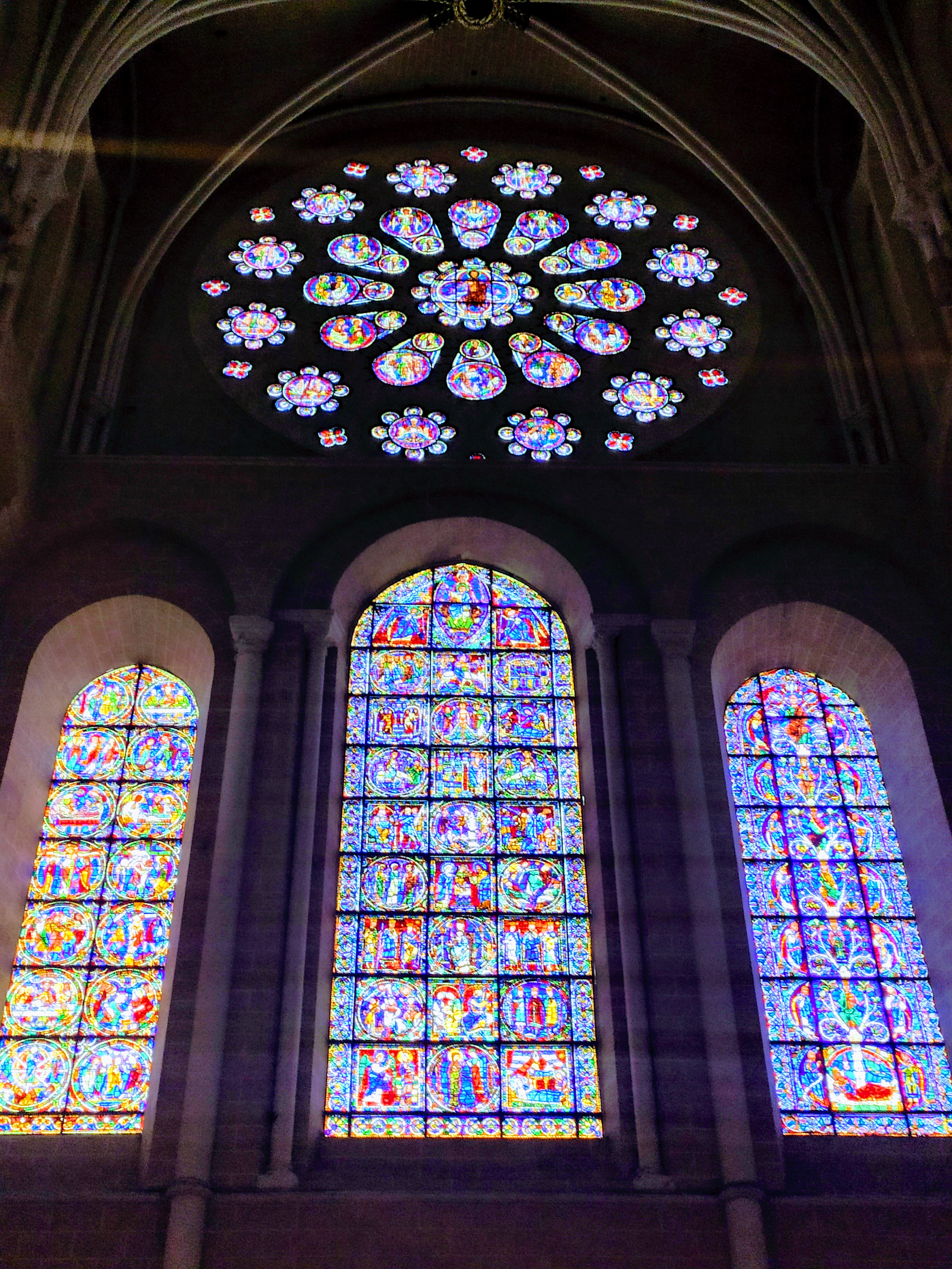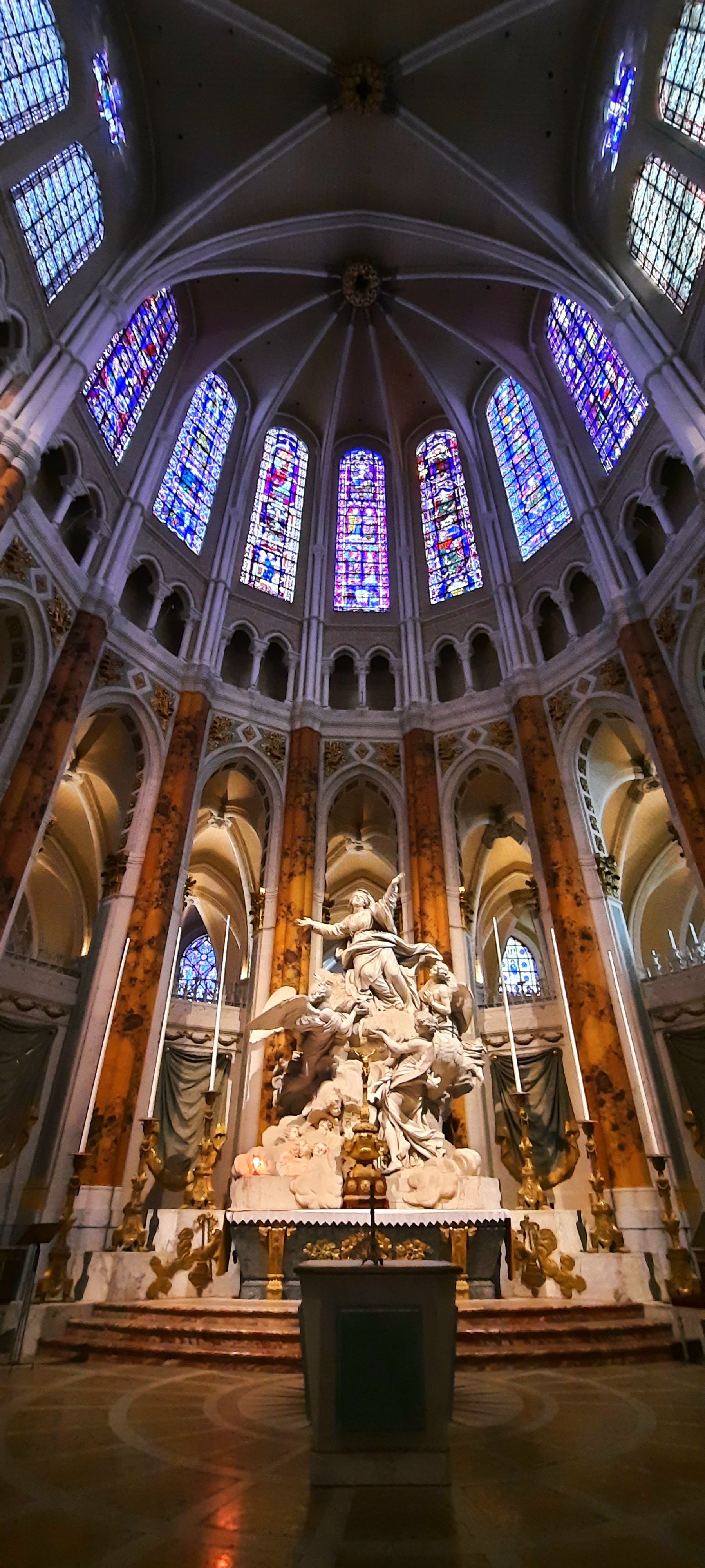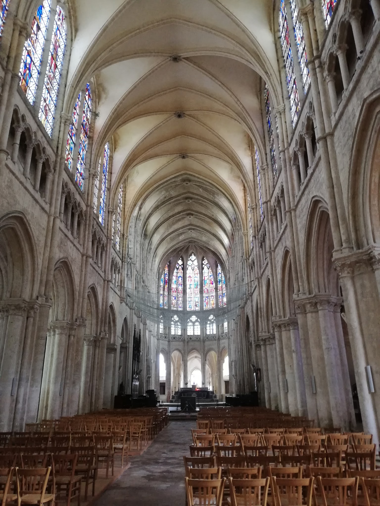 Tout d'abord vous êtes pris par les hauteurs, la richesse et la conservation des vitraux , puis se qui frappe se sont les détails et le nombres des sculptures en pierres ,je suis admirative des travaux des artisans de l'époque. Certaine période révolution ont laissés des traces non réparables ( têtes et mains coupés) . Les travaux discrait ,vous font réapparaître la pierre blanche . Le labyrinthe , comme à la cathédrale d'Amiens est visible malgré les chaises .