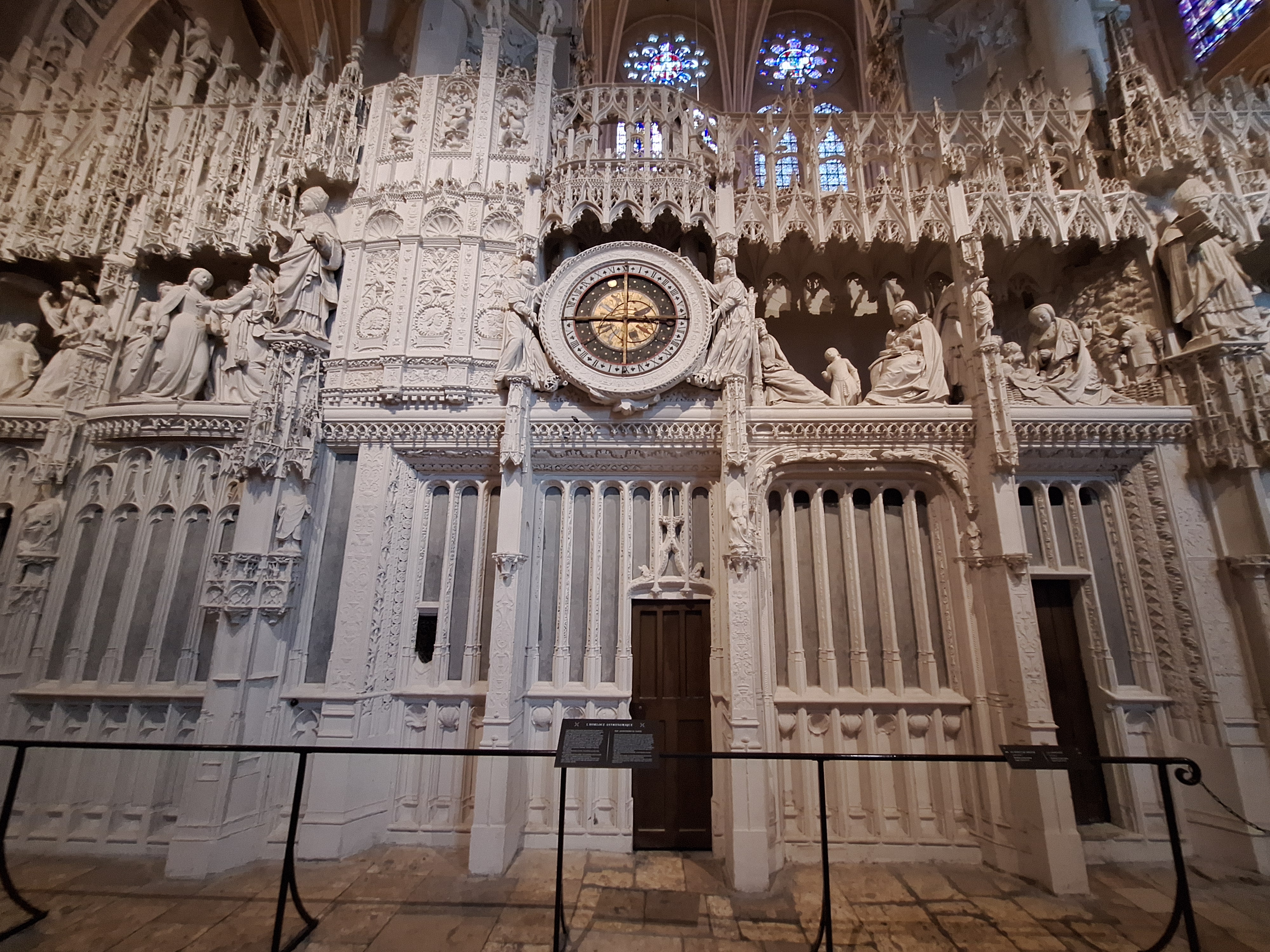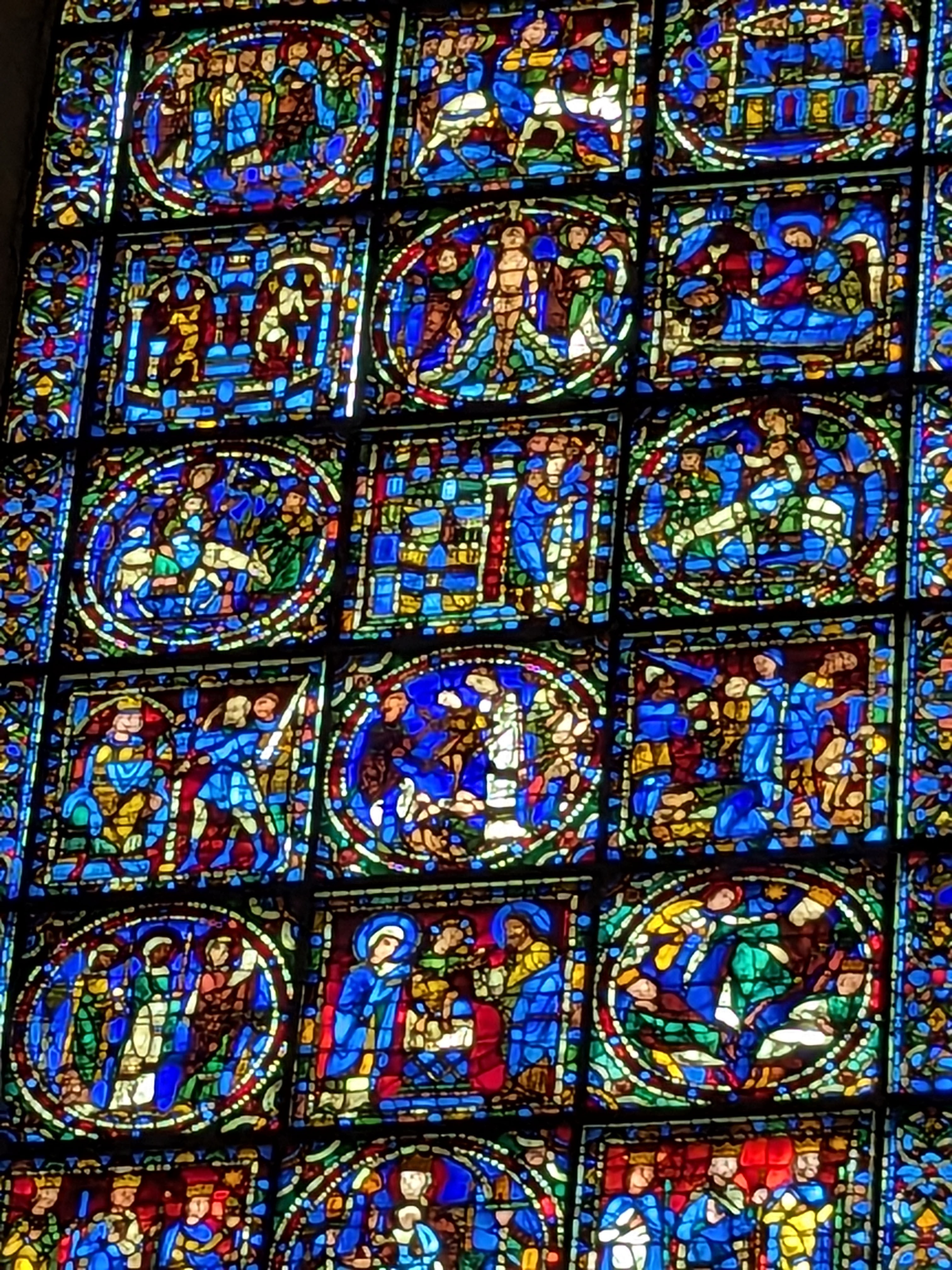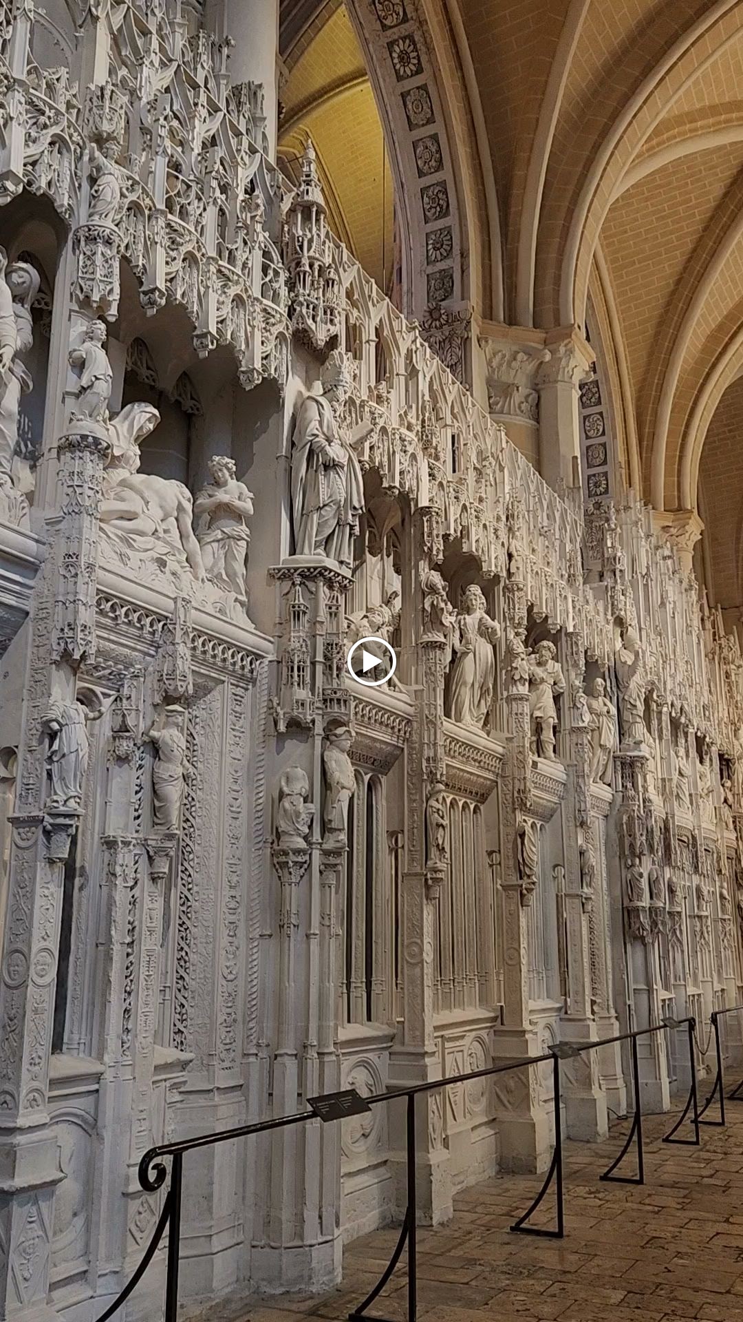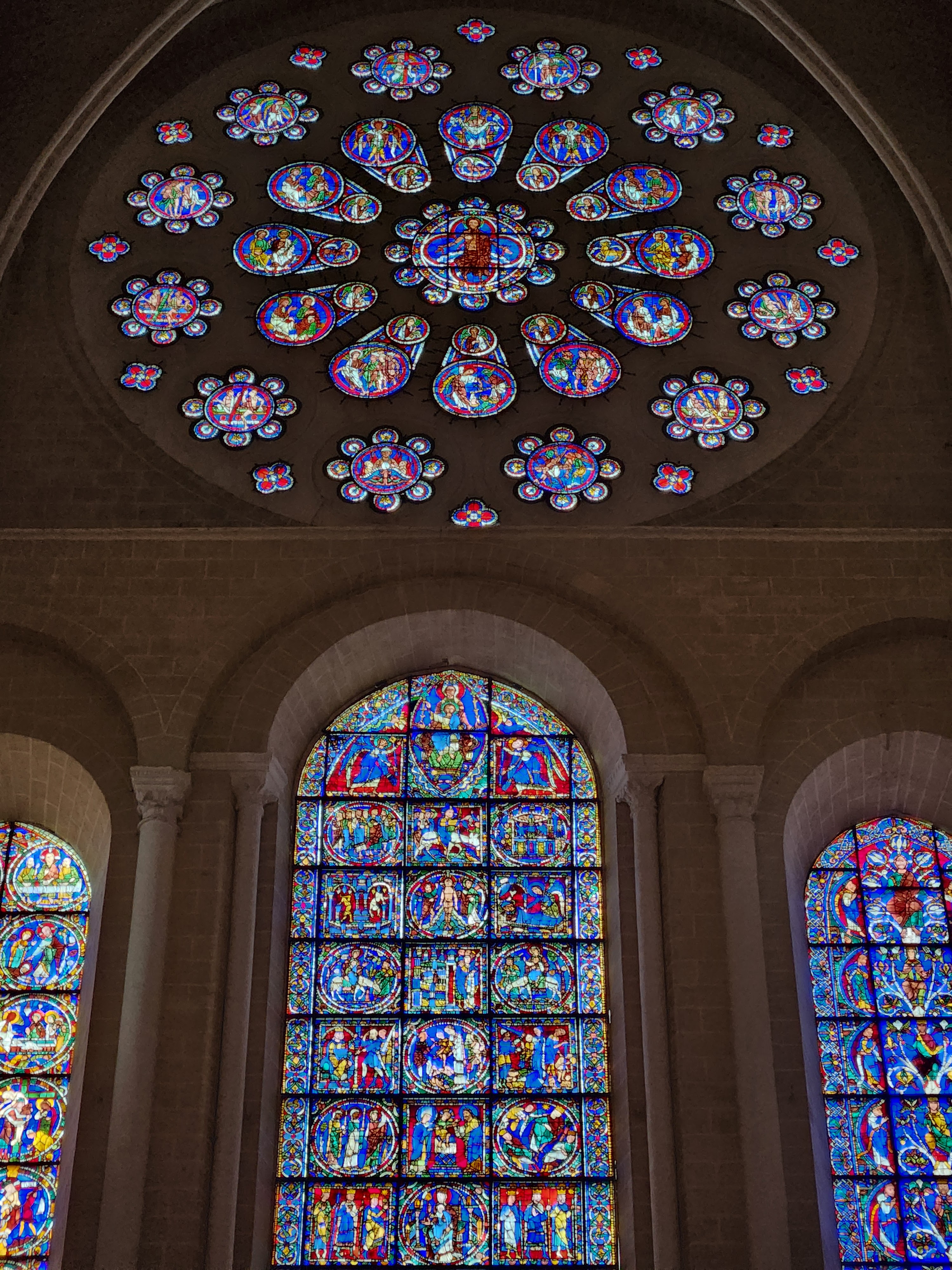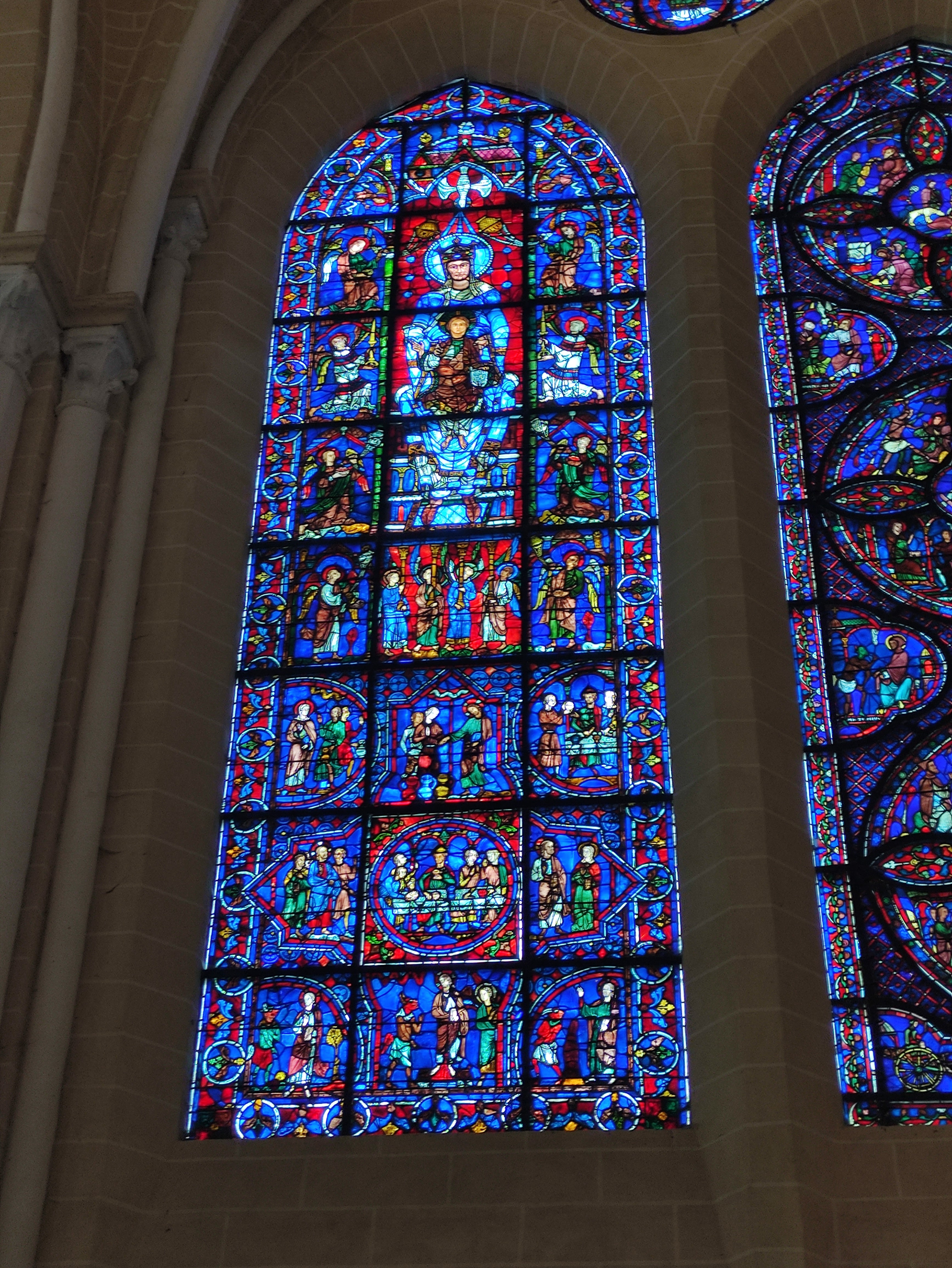 Tout d'abord vous êtes pris par les hauteurs, la richesse et la conservation des vitraux , puis se qui frappe se sont les détails et le nombres des sculptures en pierres ,je suis admirative des travaux des artisans de l'époque. Certaine période révolution ont laissés des traces non réparables ( têtes et mains coupés) . Les travaux discrait ,vous font réapparaître la pierre blanche . Le labyrinthe , comme à la cathédrale d'Amiens est visible malgré les chaises .