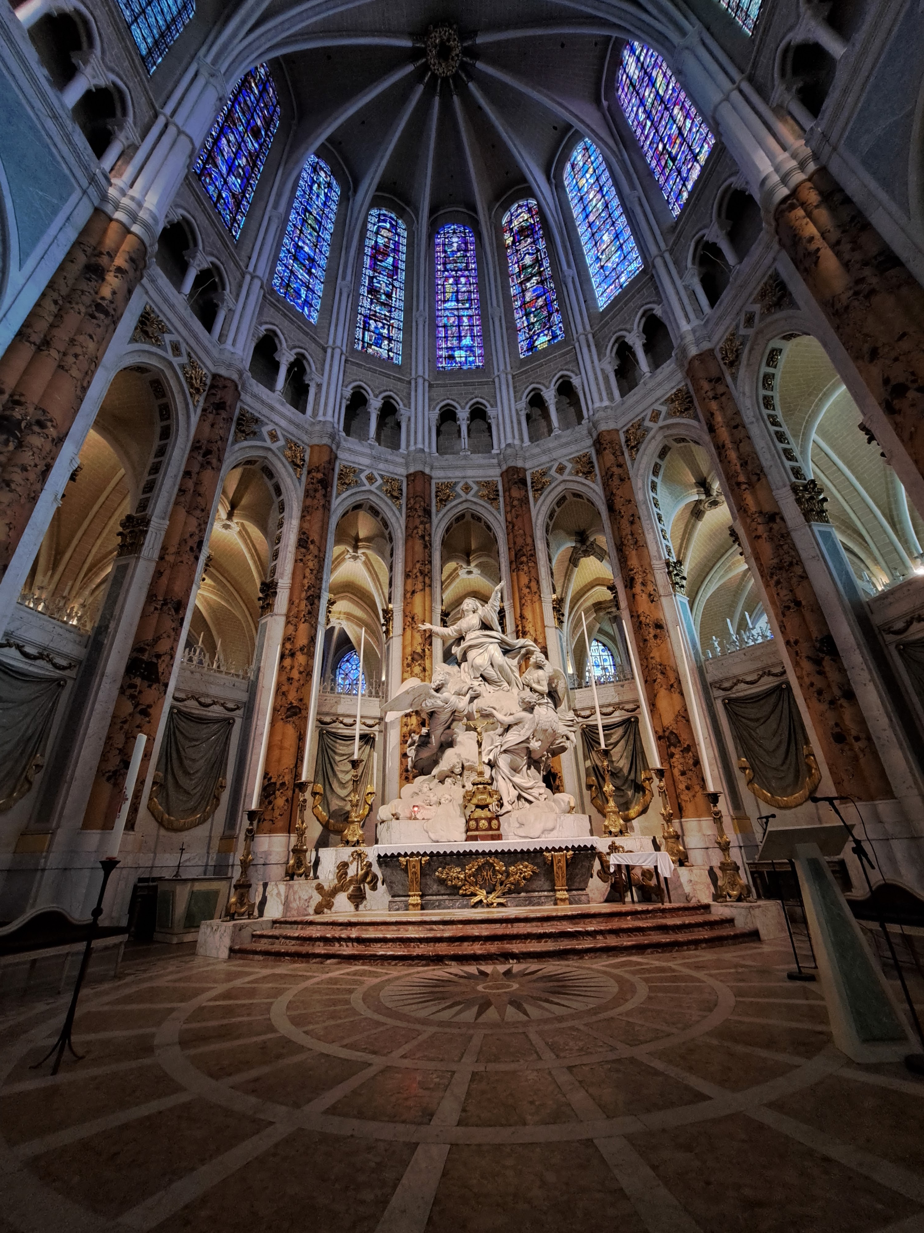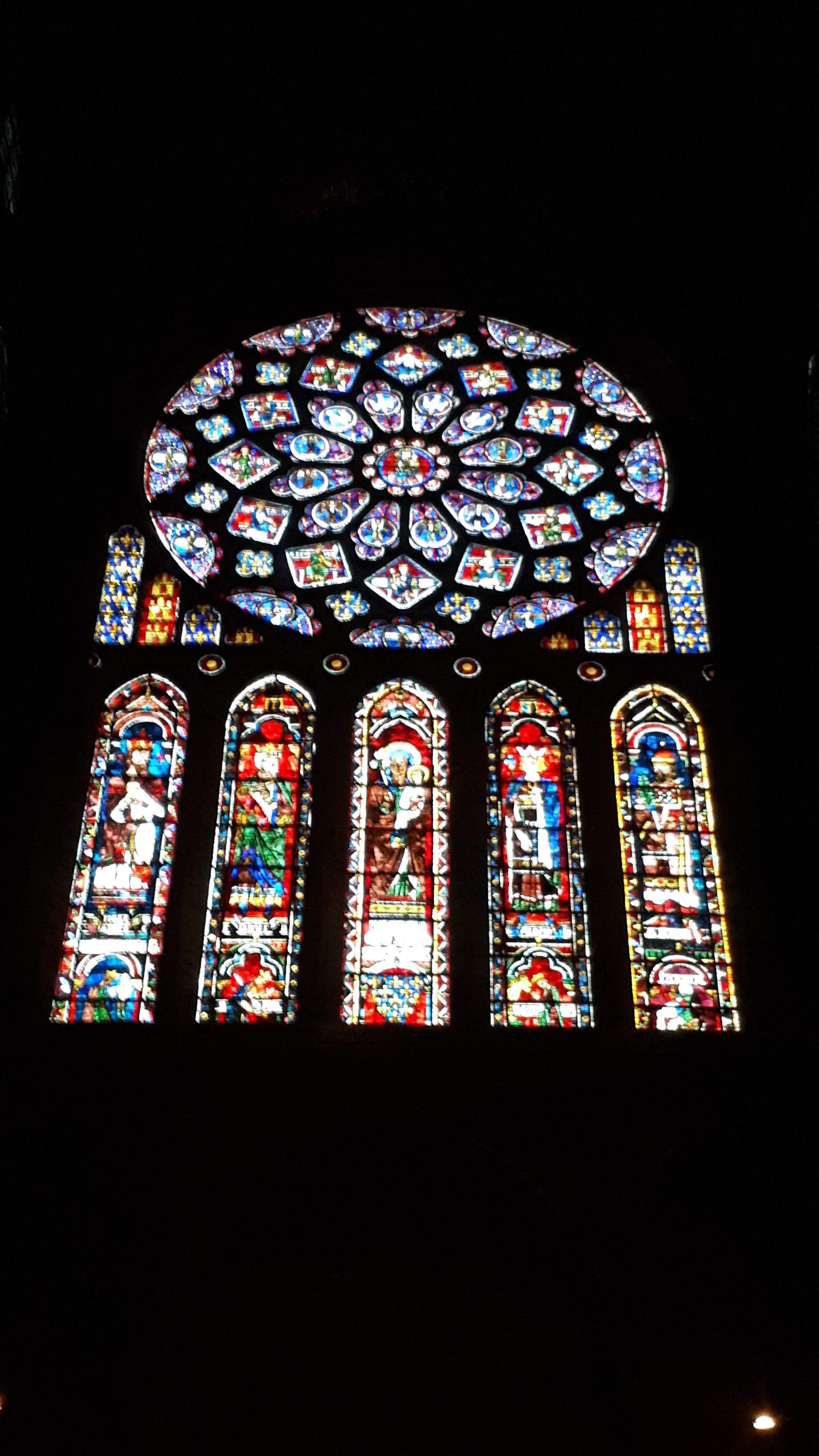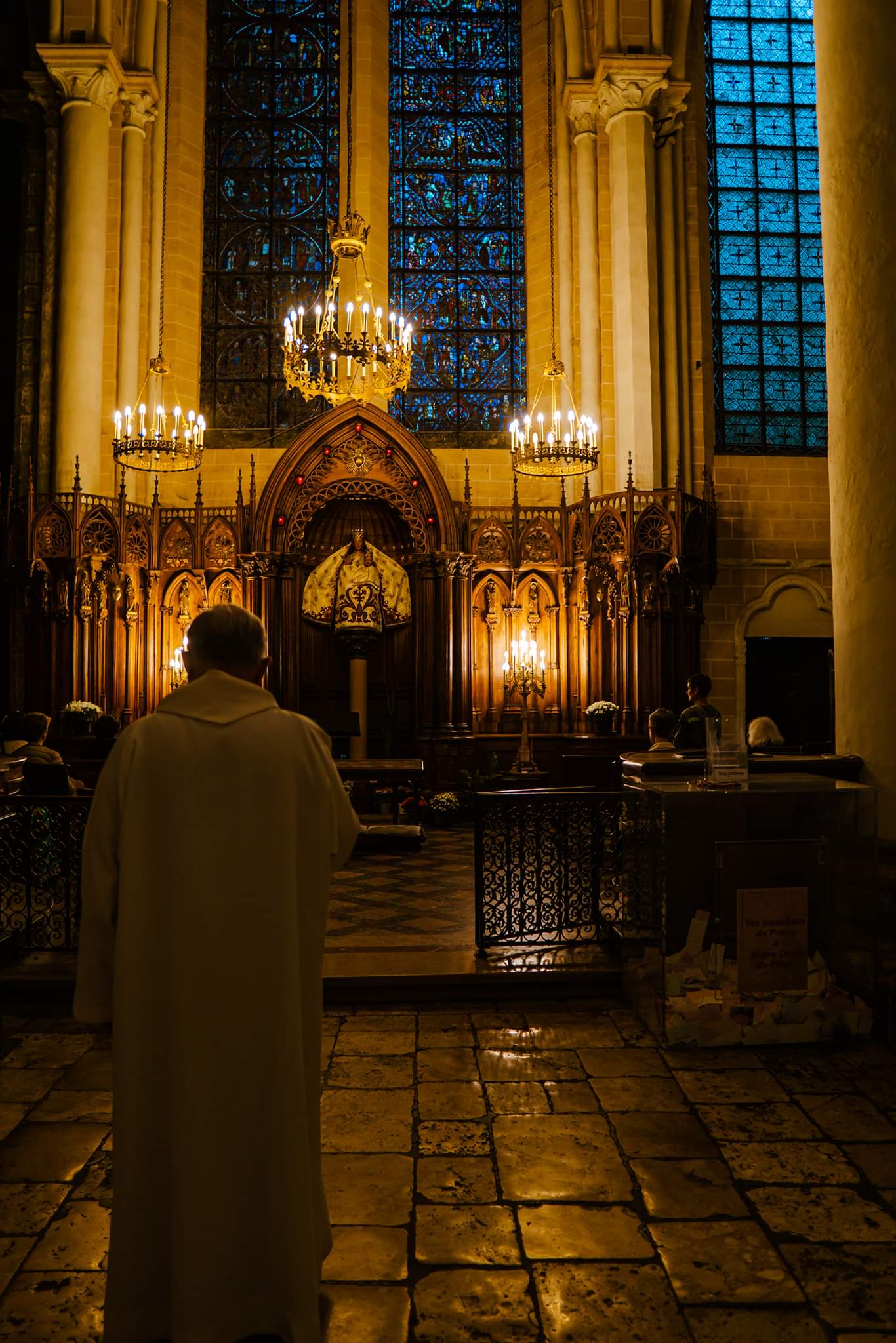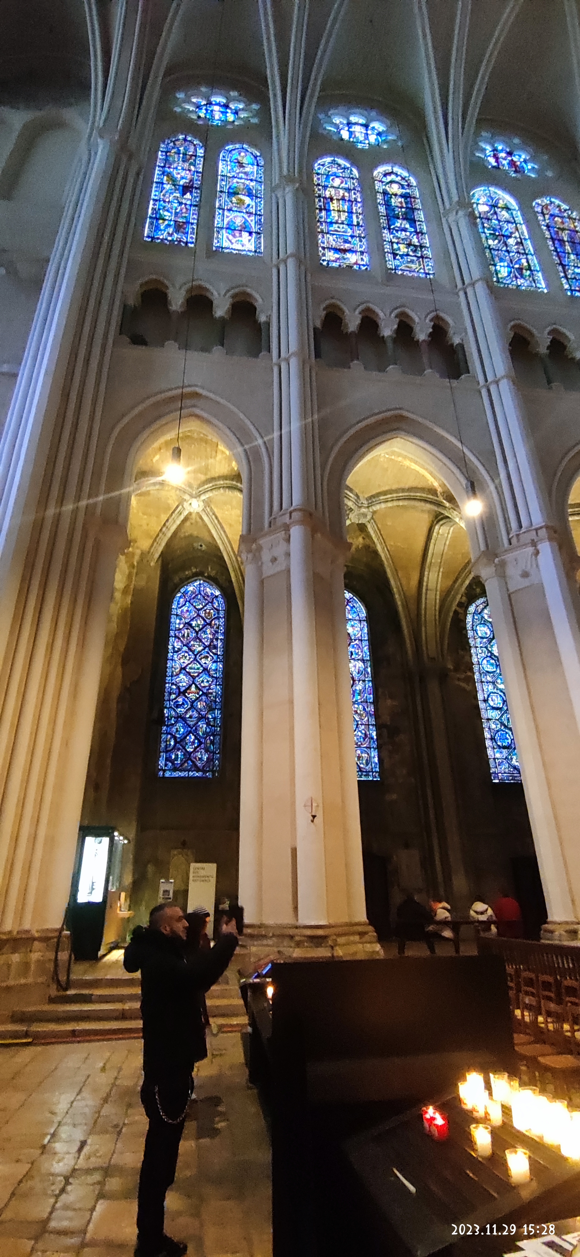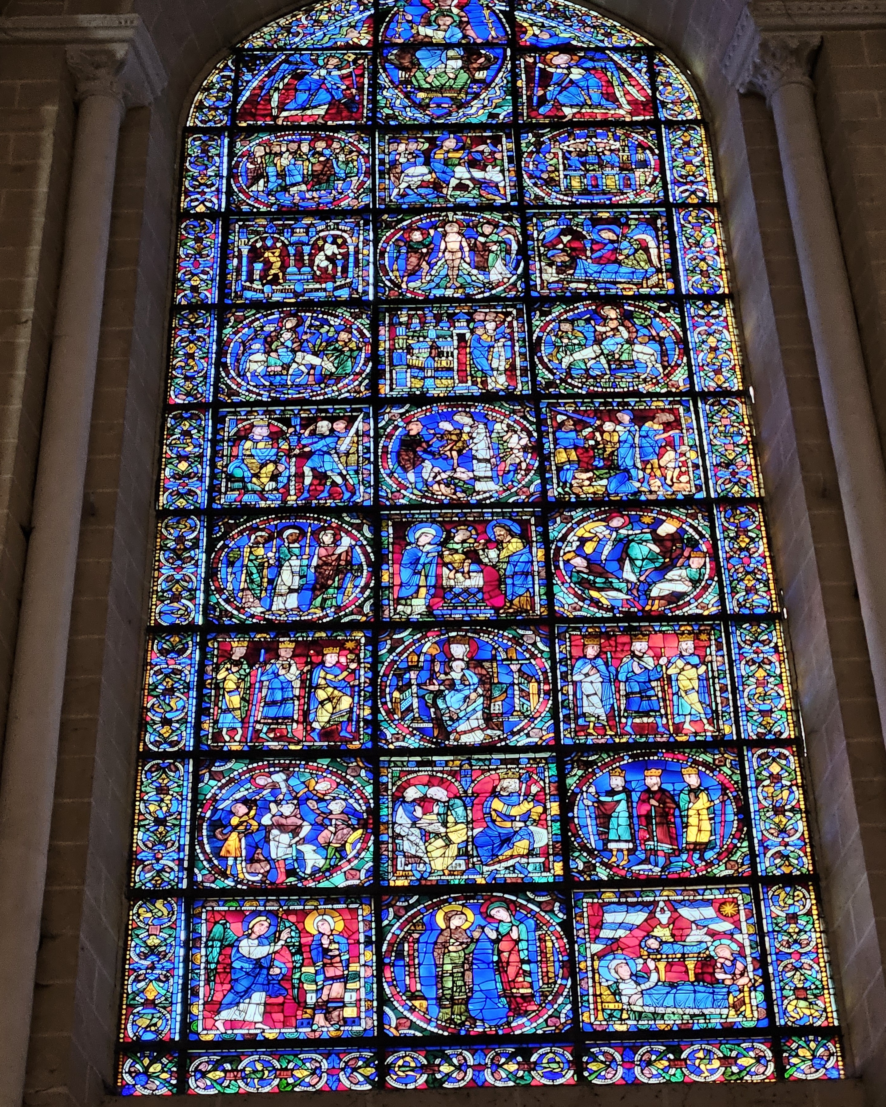Tout d'abord vous êtes pris par les hauteurs, la richesse et la conservation des vitraux , puis se qui frappe se sont les détails et le nombres des sculptures en pierres ,je suis admirative des travaux des artisans de l'époque. Certaine période révolution ont laissés des traces non réparables ( têtes et mains coupés) . Les travaux discrait ,vous font réapparaître la pierre blanche . Le labyrinthe , comme à la cathédrale d'Amiens est visible malgré les chaises .
