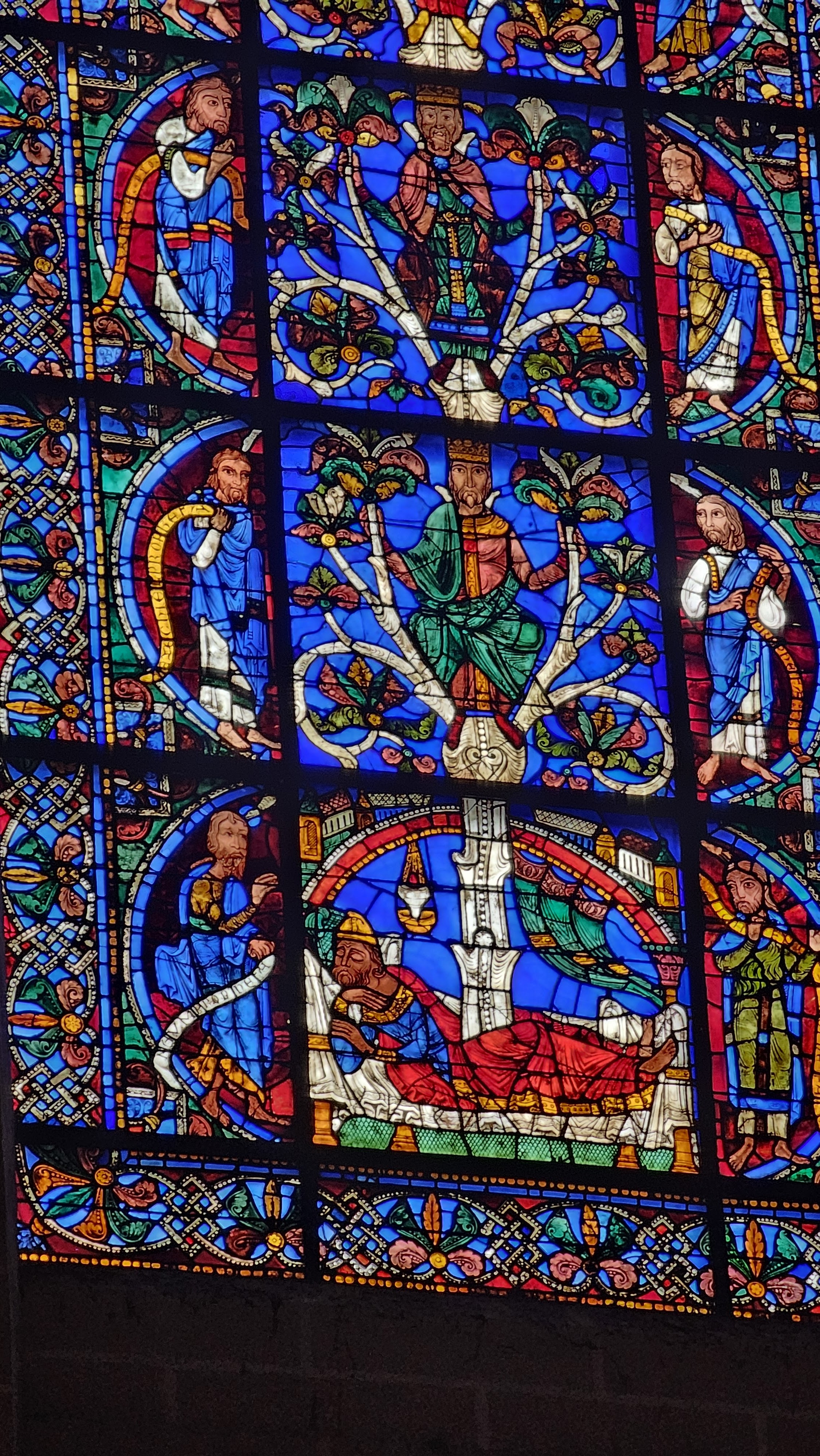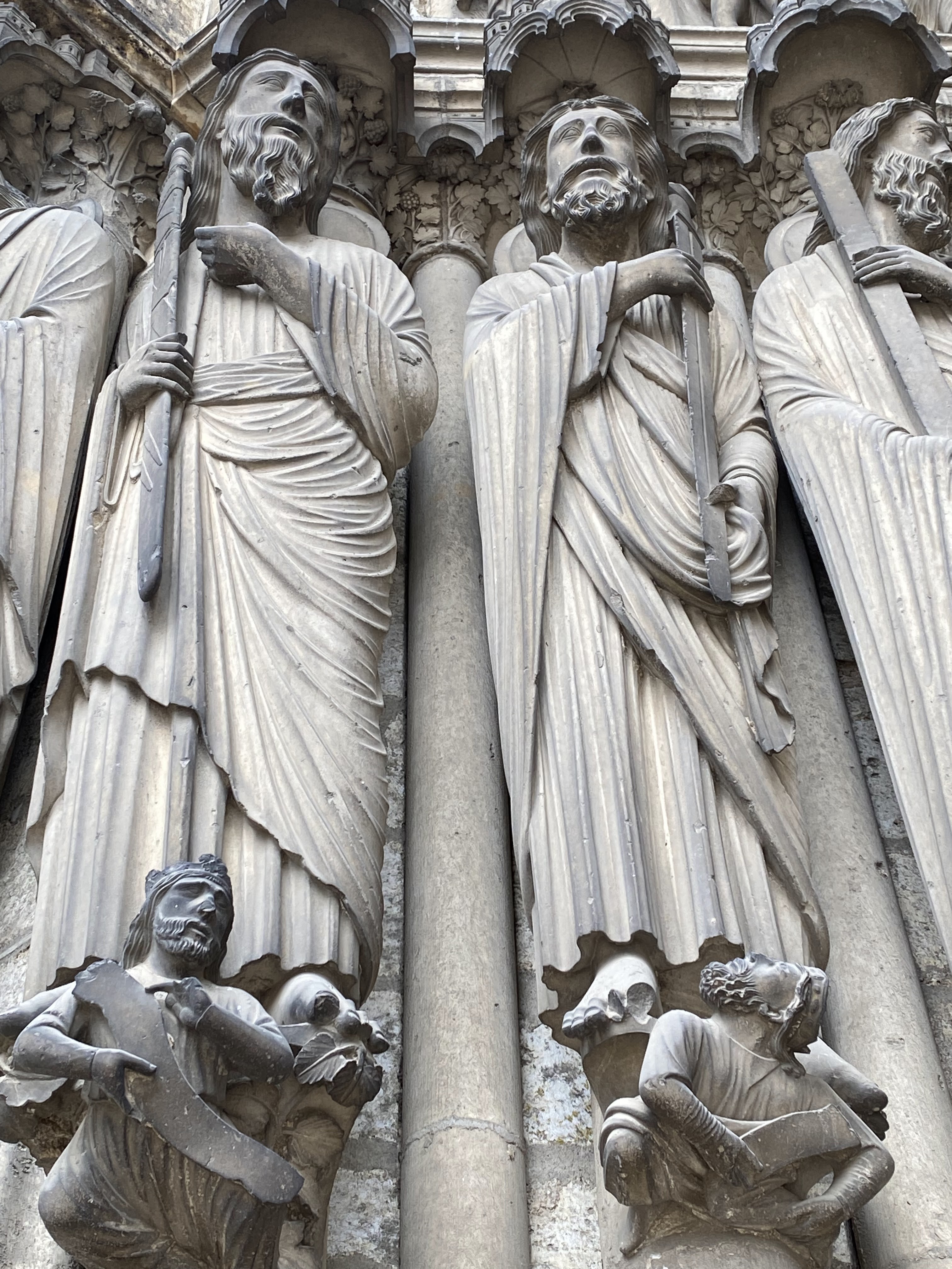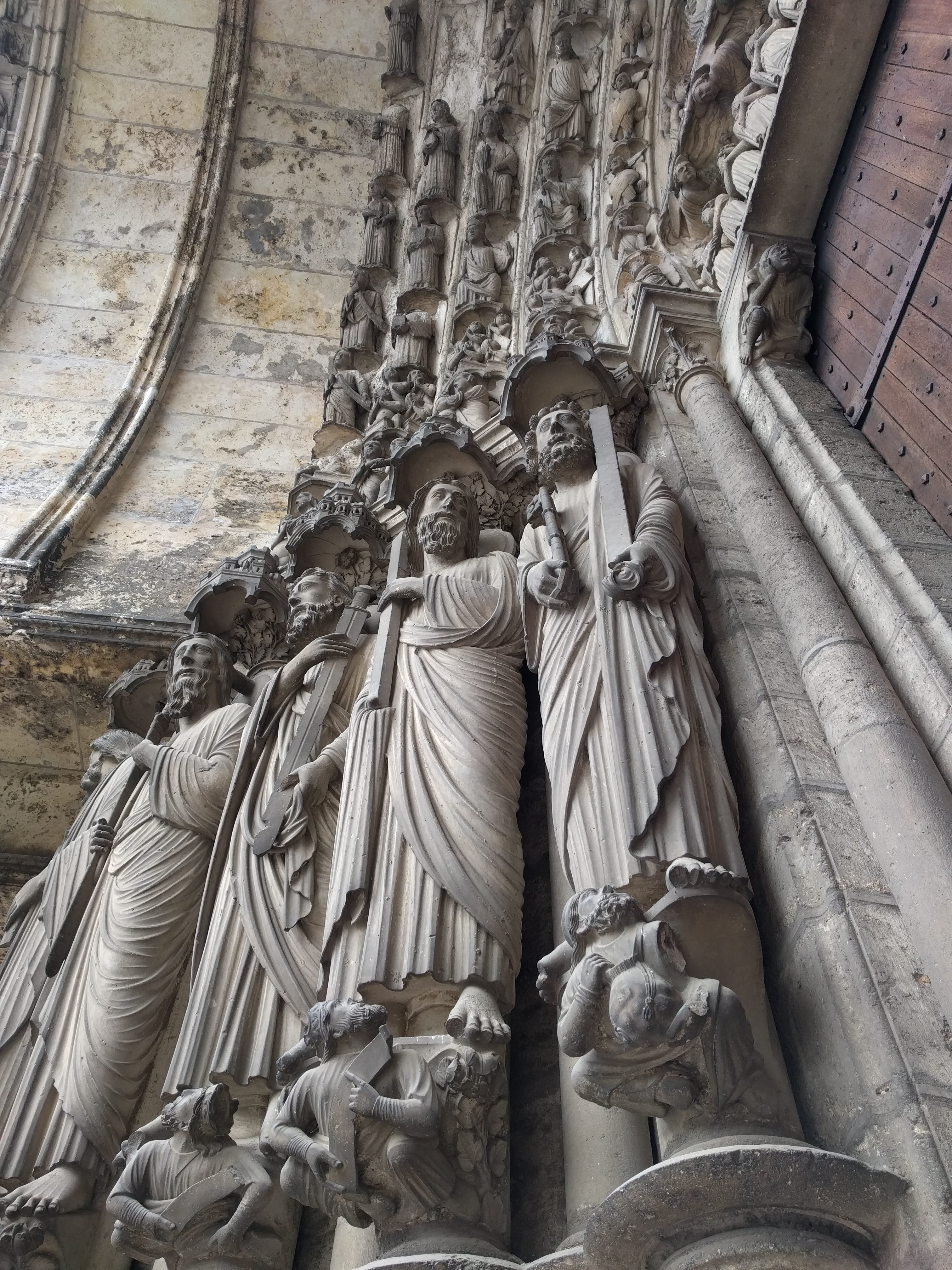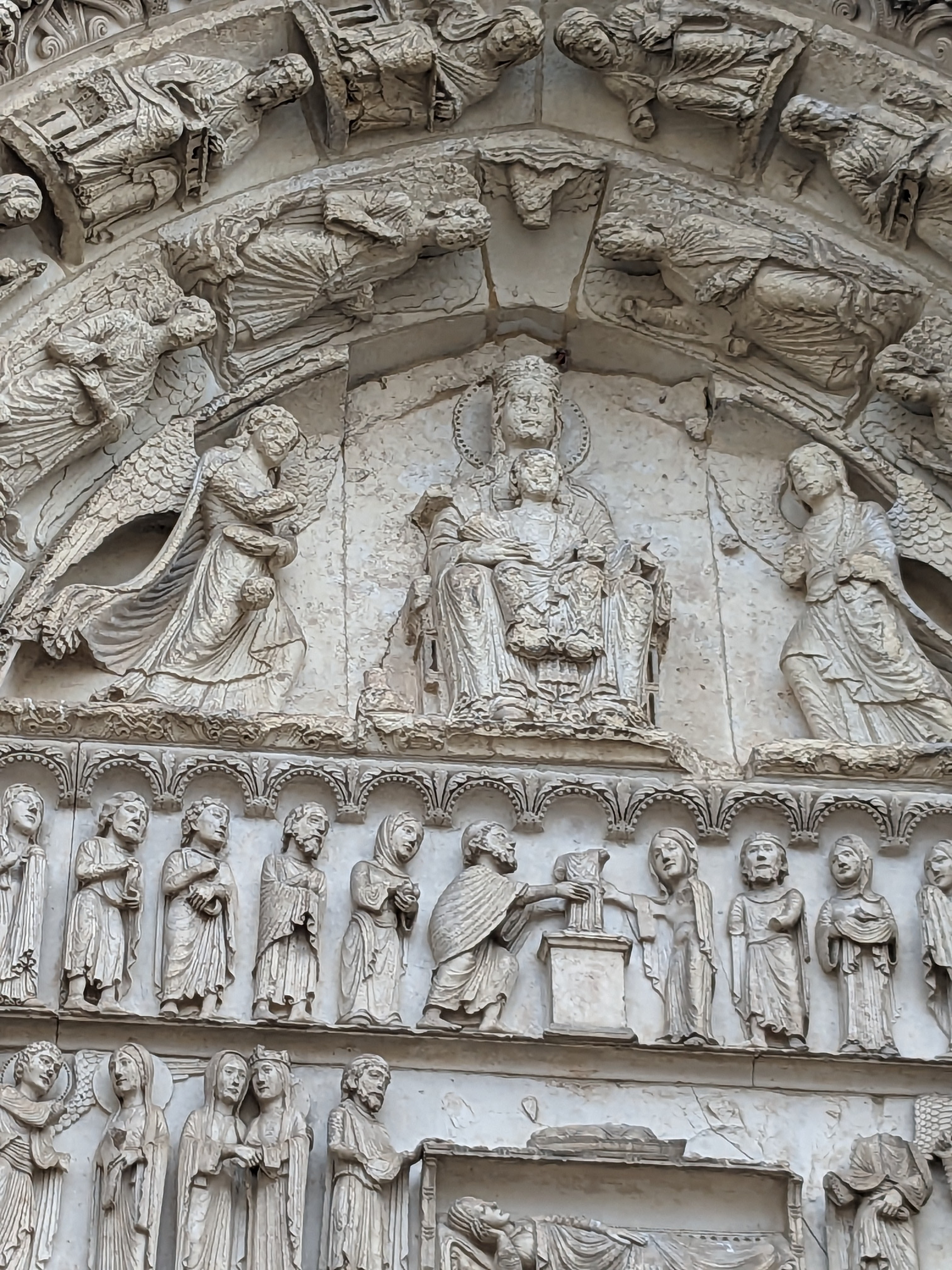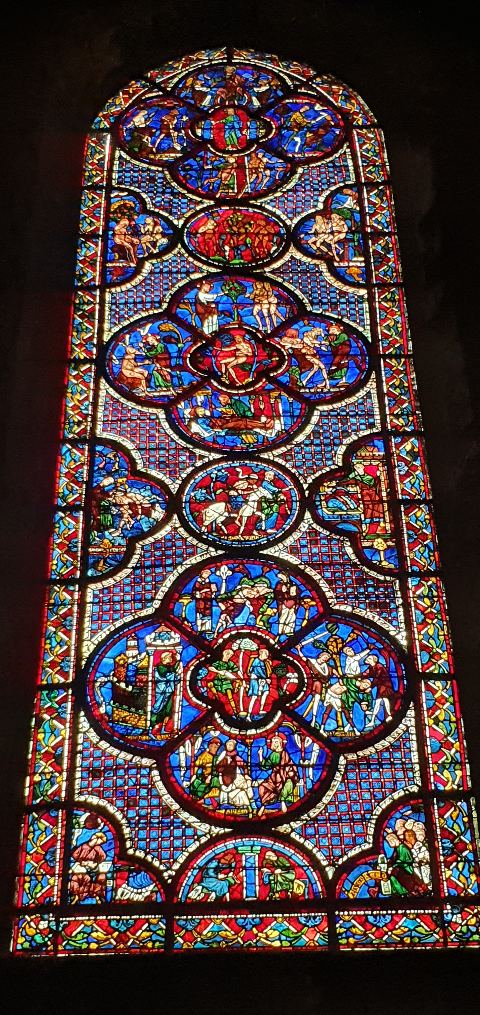 Tout d'abord vous êtes pris par les hauteurs, la richesse et la conservation des vitraux , puis se qui frappe se sont les détails et le nombres des sculptures en pierres ,je suis admirative des travaux des artisans de l'époque. Certaine période révolution ont laissés des traces non réparables ( têtes et mains coupés) . Les travaux discrait ,vous font réapparaître la pierre blanche . Le labyrinthe , comme à la cathédrale d'Amiens est visible malgré les chaises .