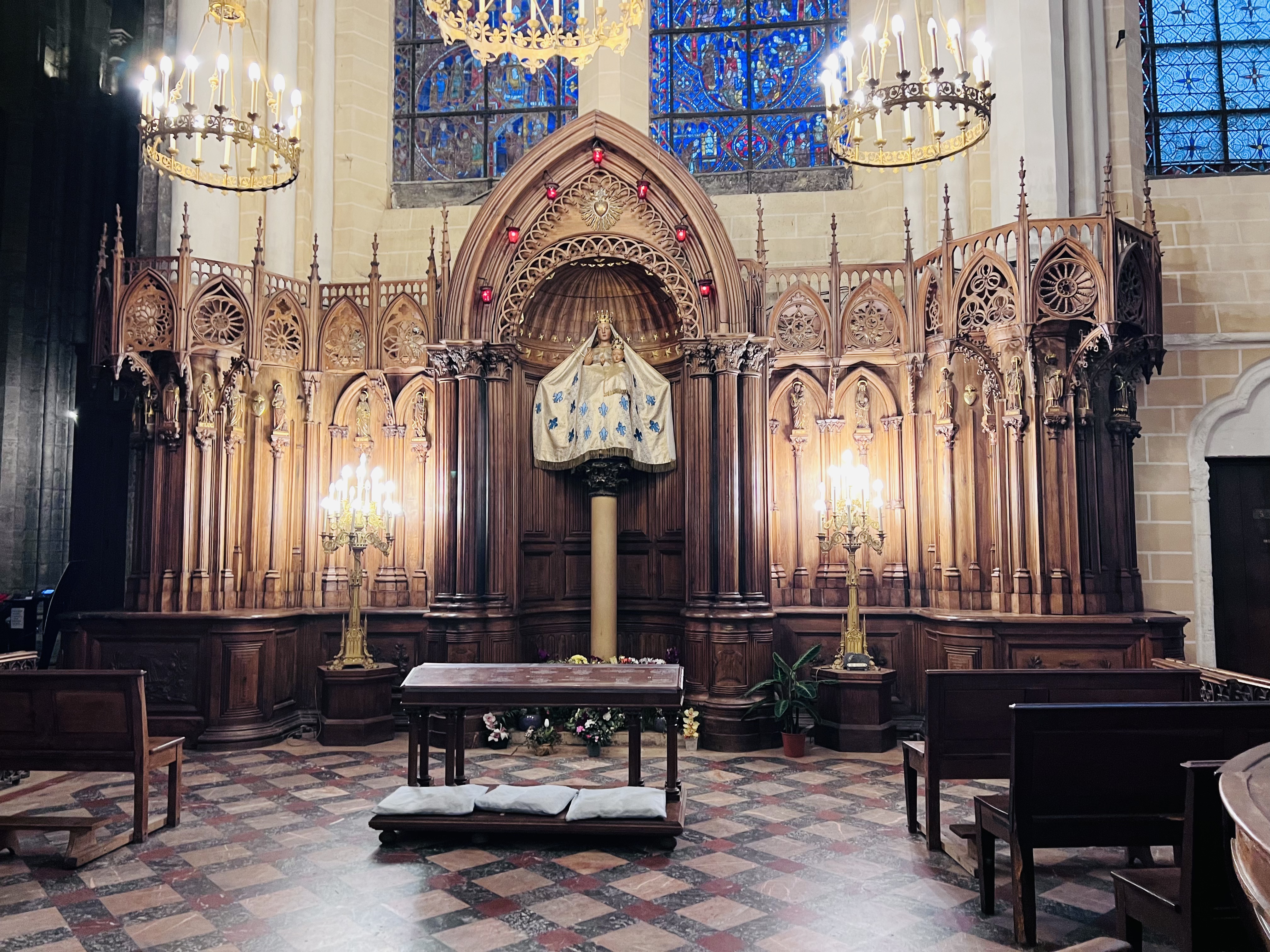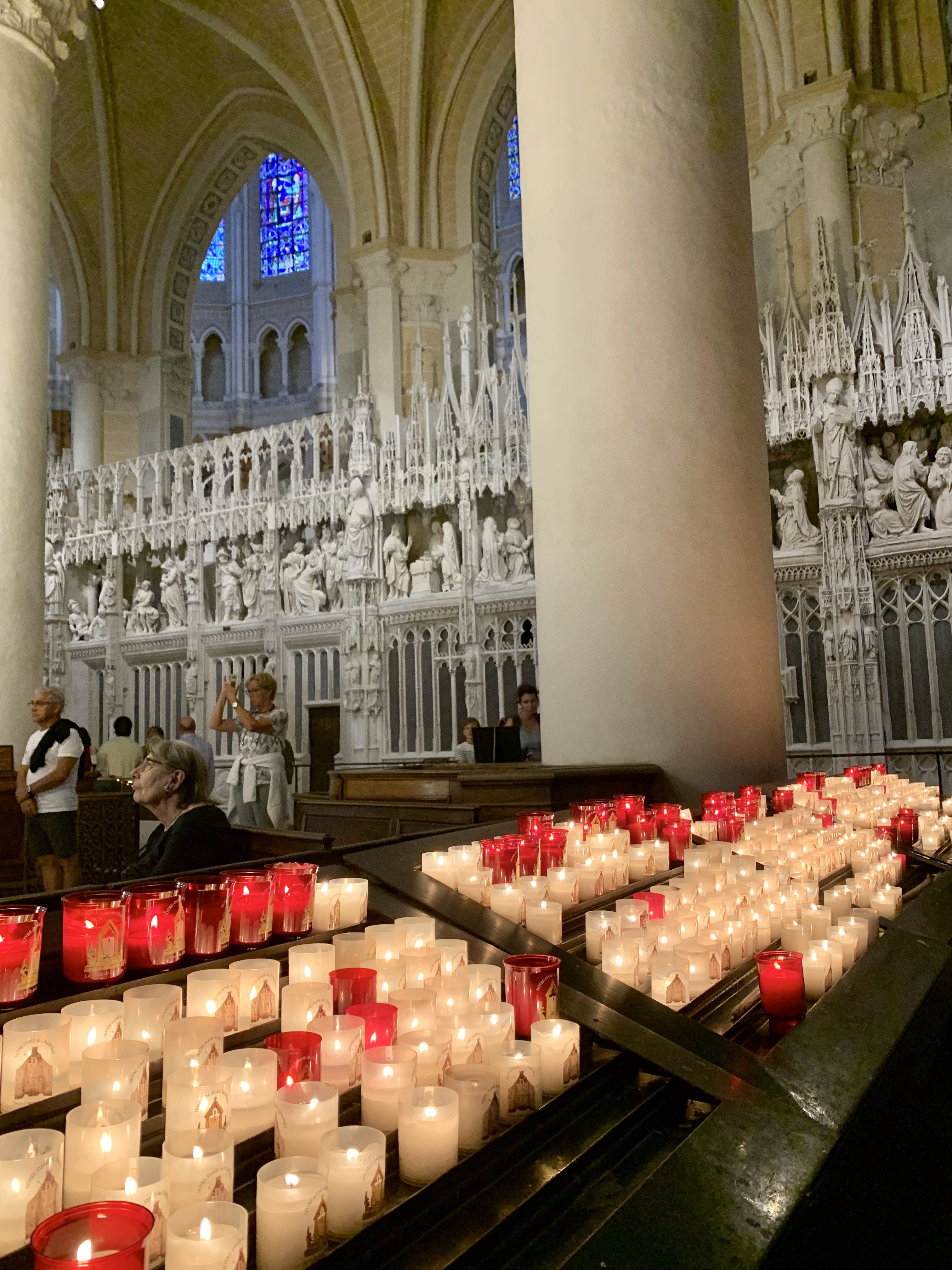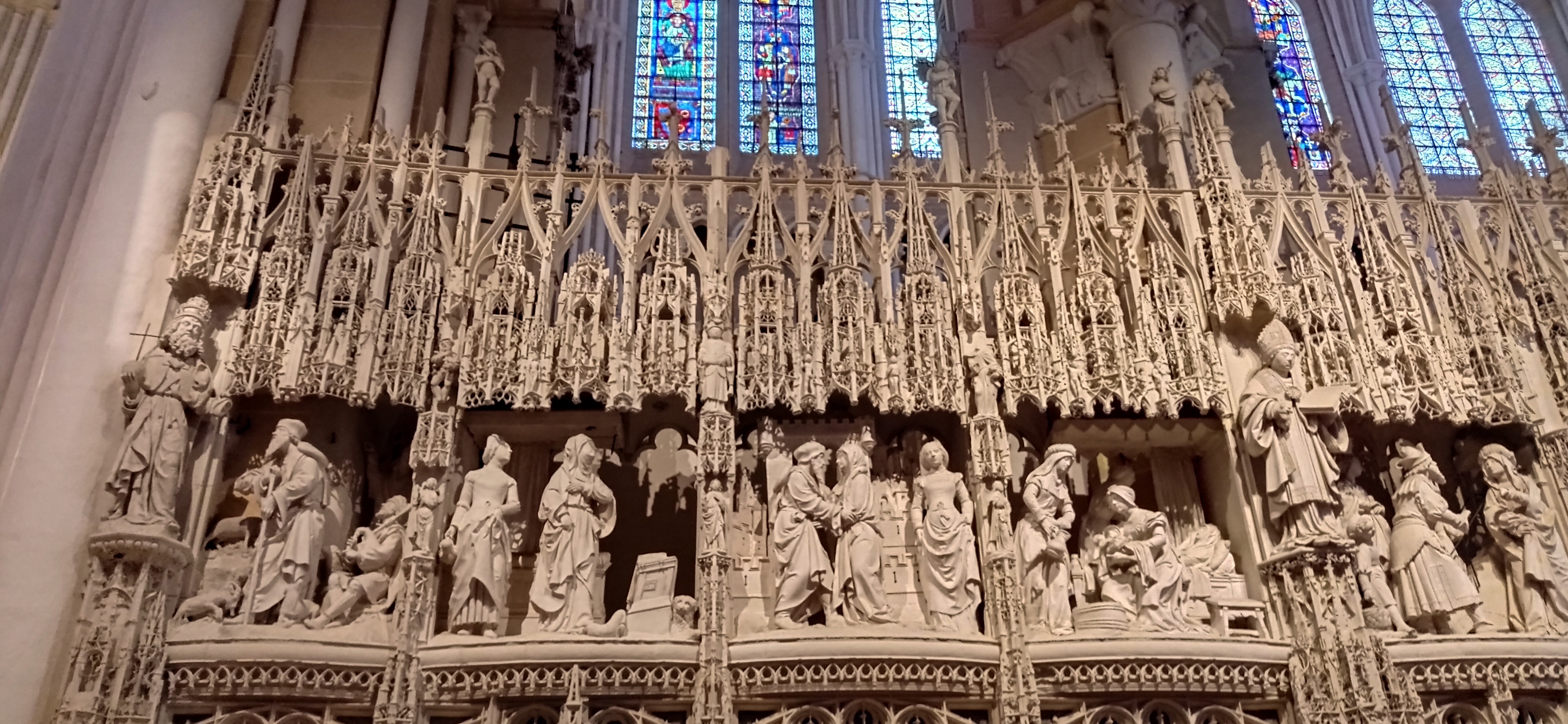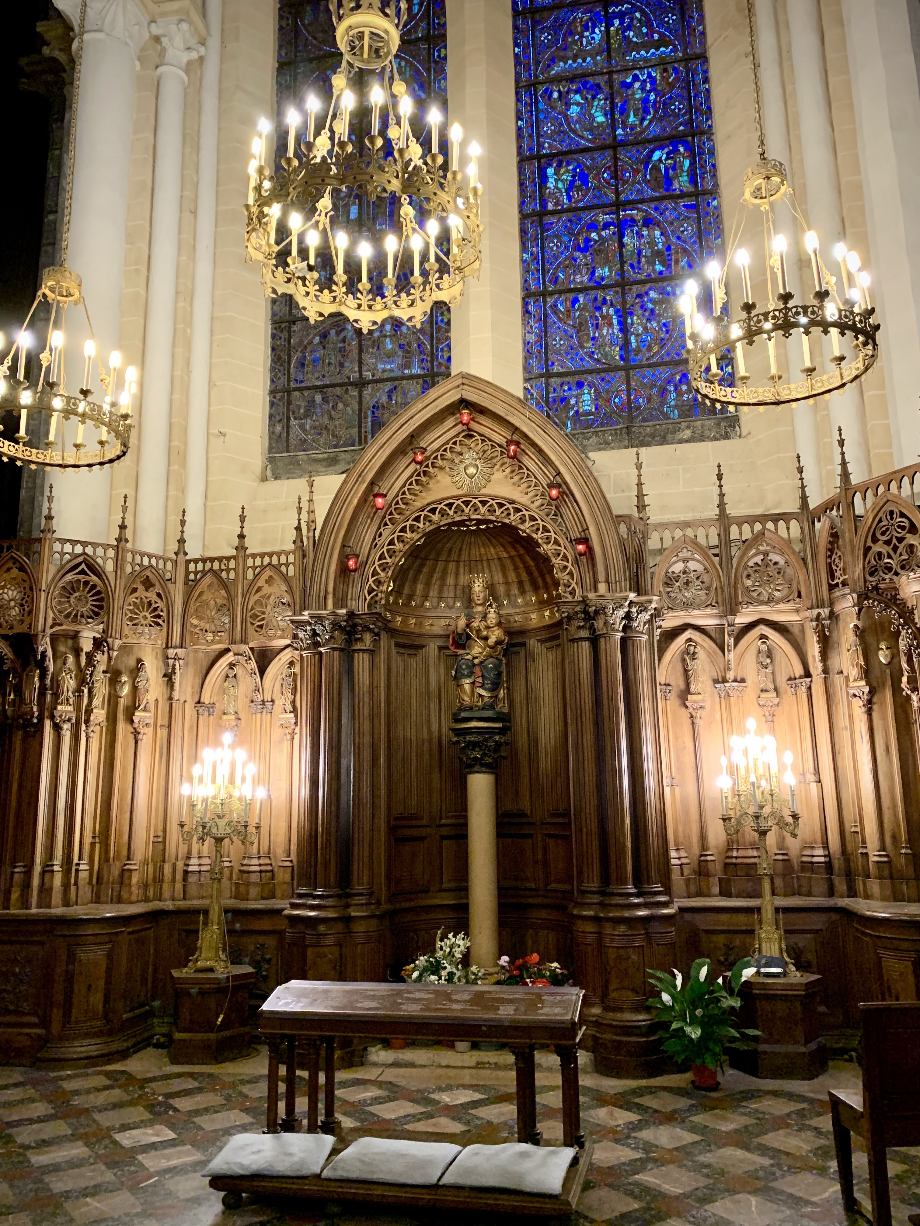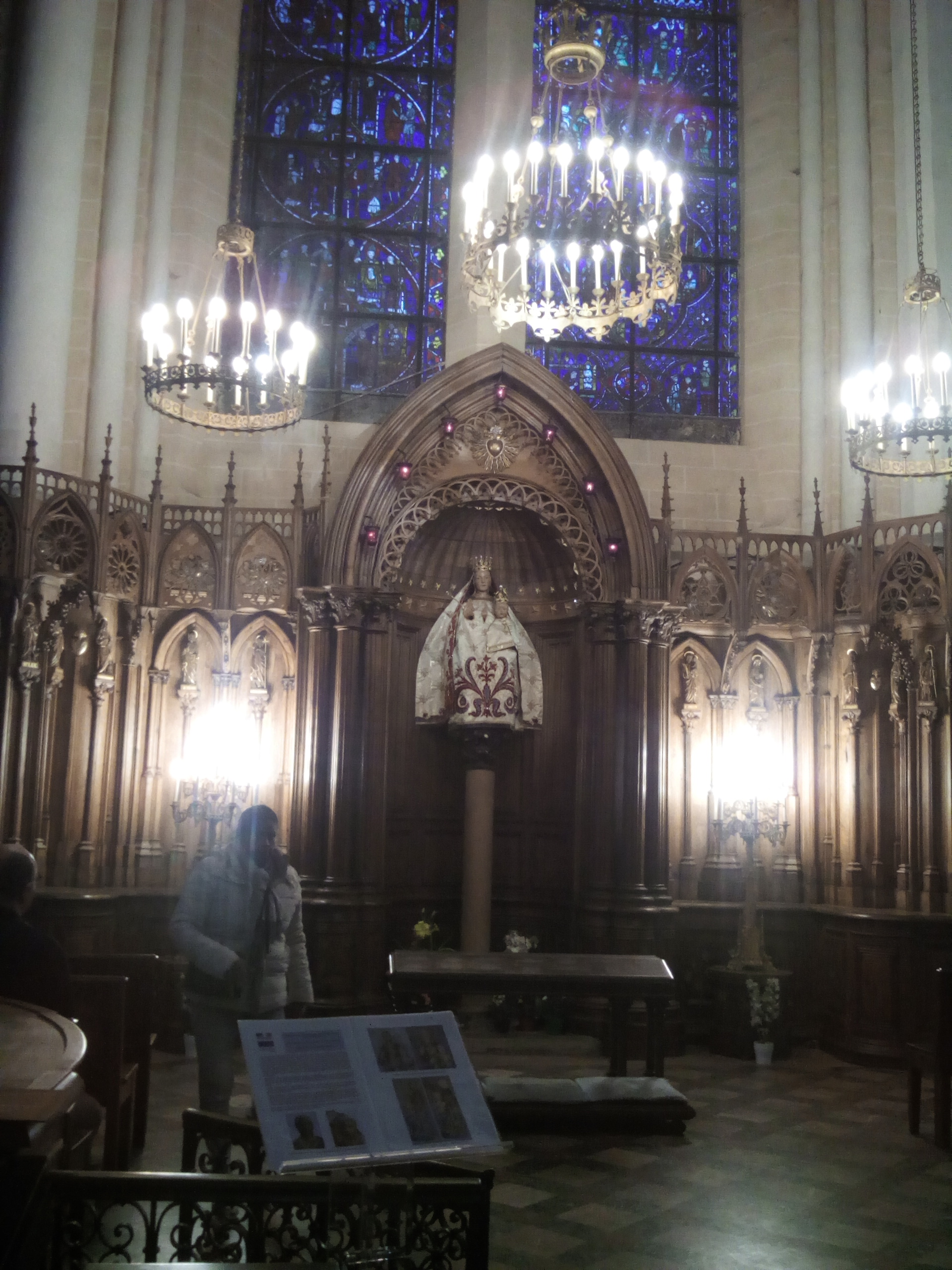En groupe nous sommes allés visiter cette superbe cathédrale. Notre guide, Claire, jeune femme passionnée par son métier nous a appris énormément de choses concernant cet édifice majestueux, ses magnifiques vitraux et sculptures. C'est un joyau de plénitude et de beauté conçu à la gloire de Marie et de Jésus. A l'intérieur, une partie de la cathédrale vient d'être restaurée, c'est encore plus somptueux.