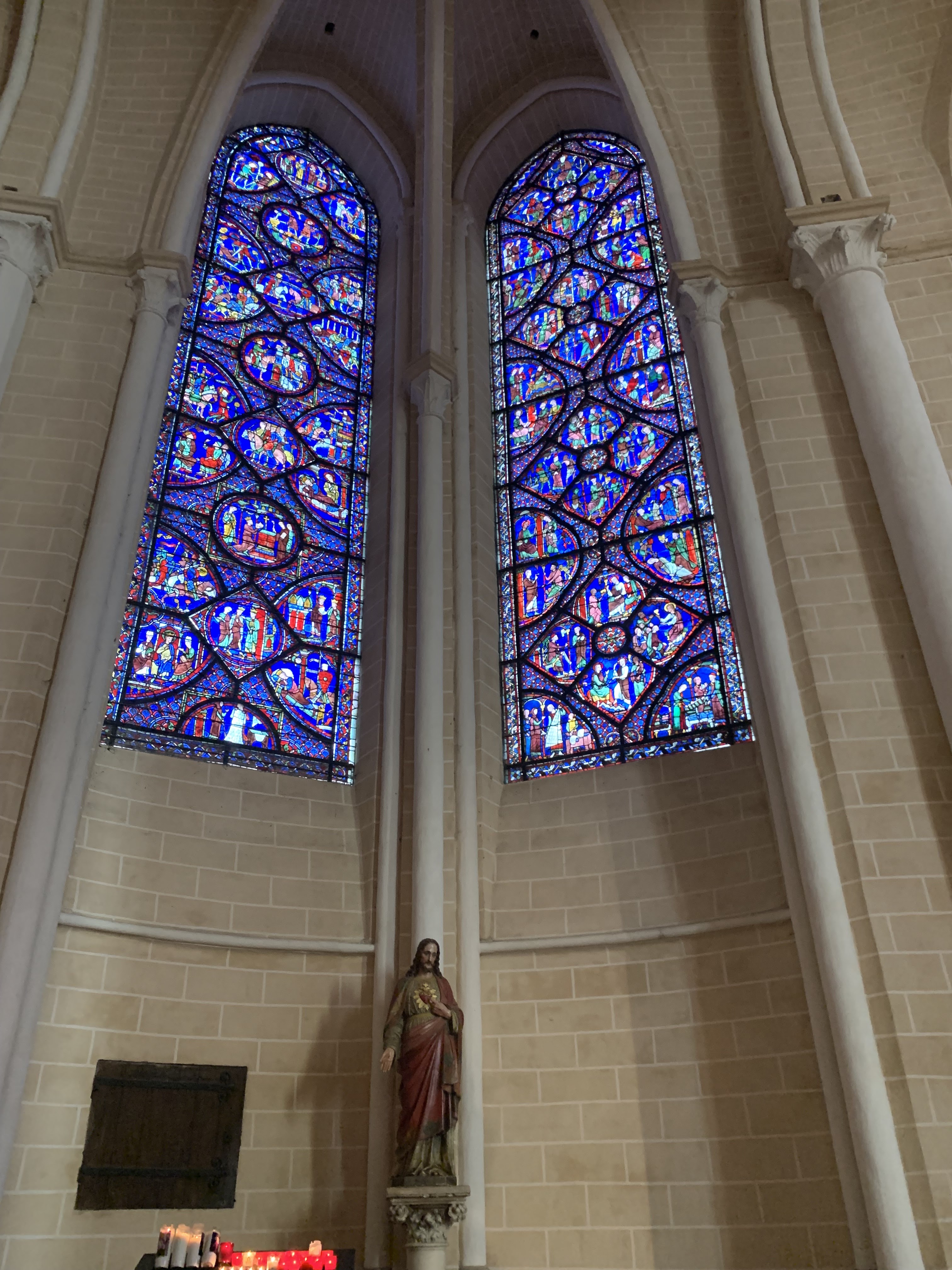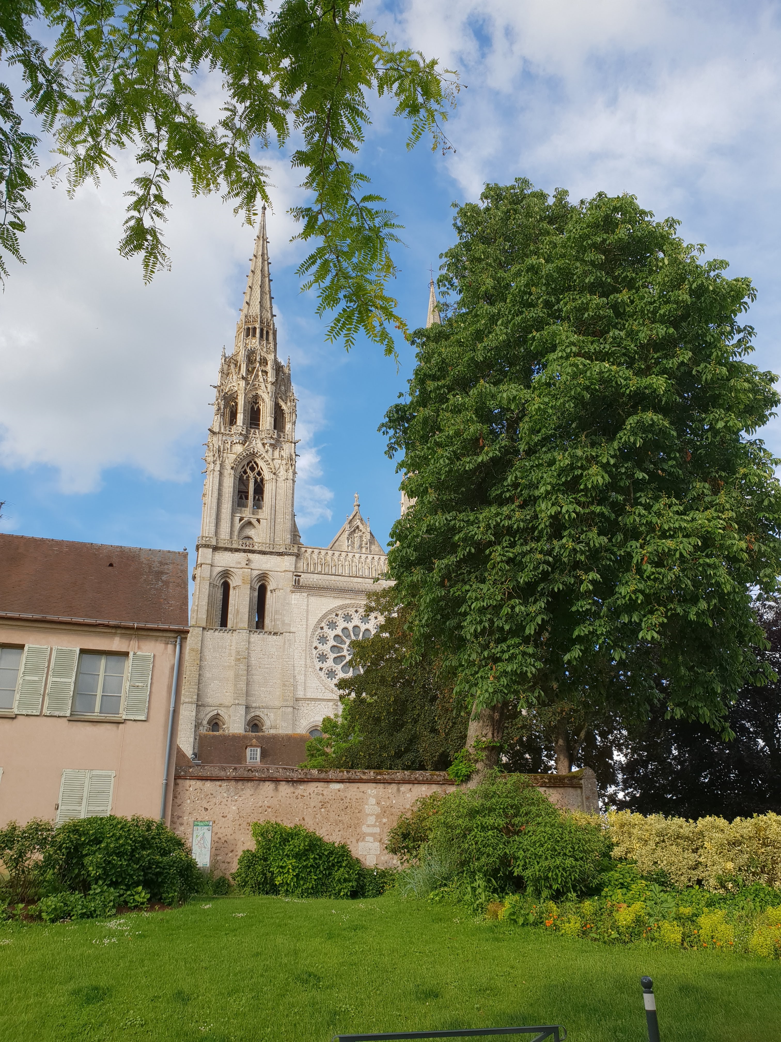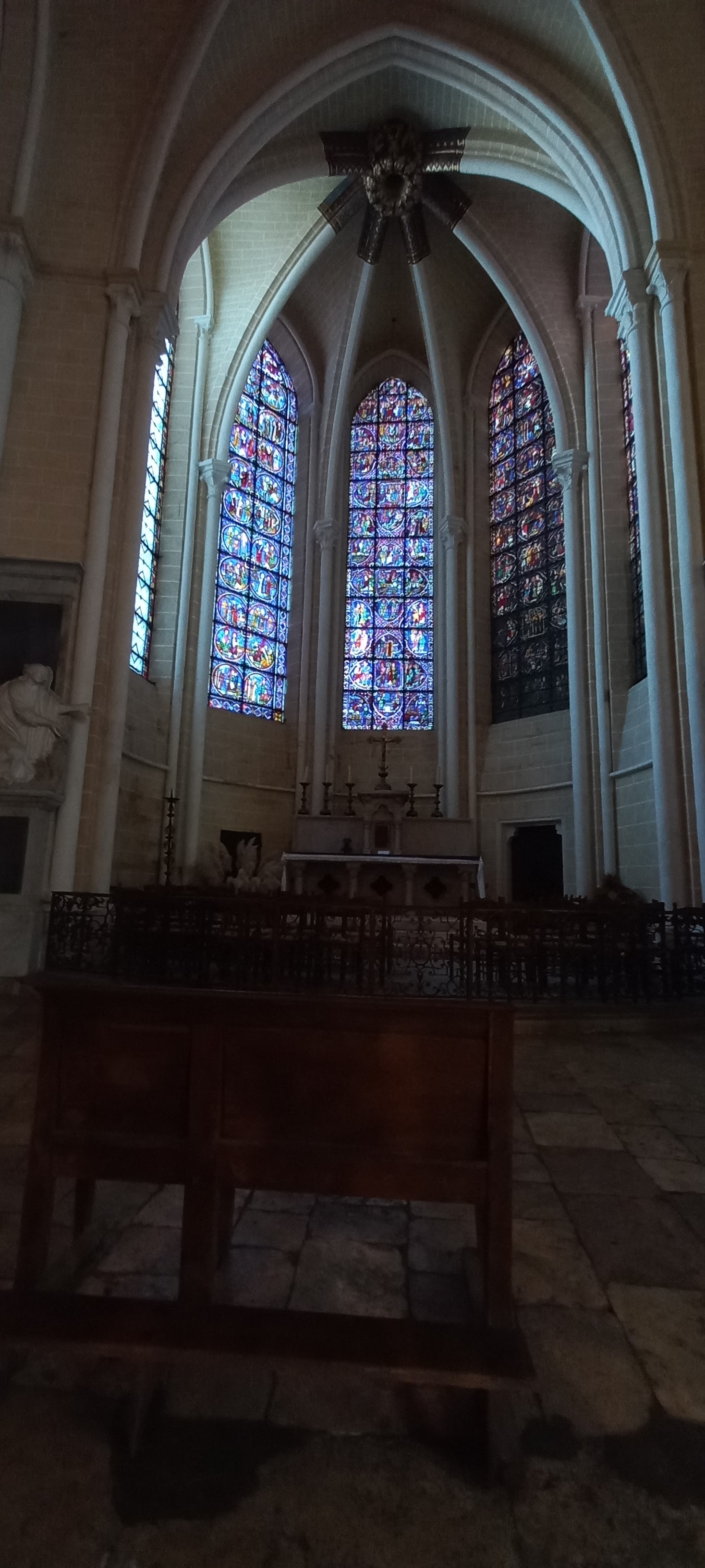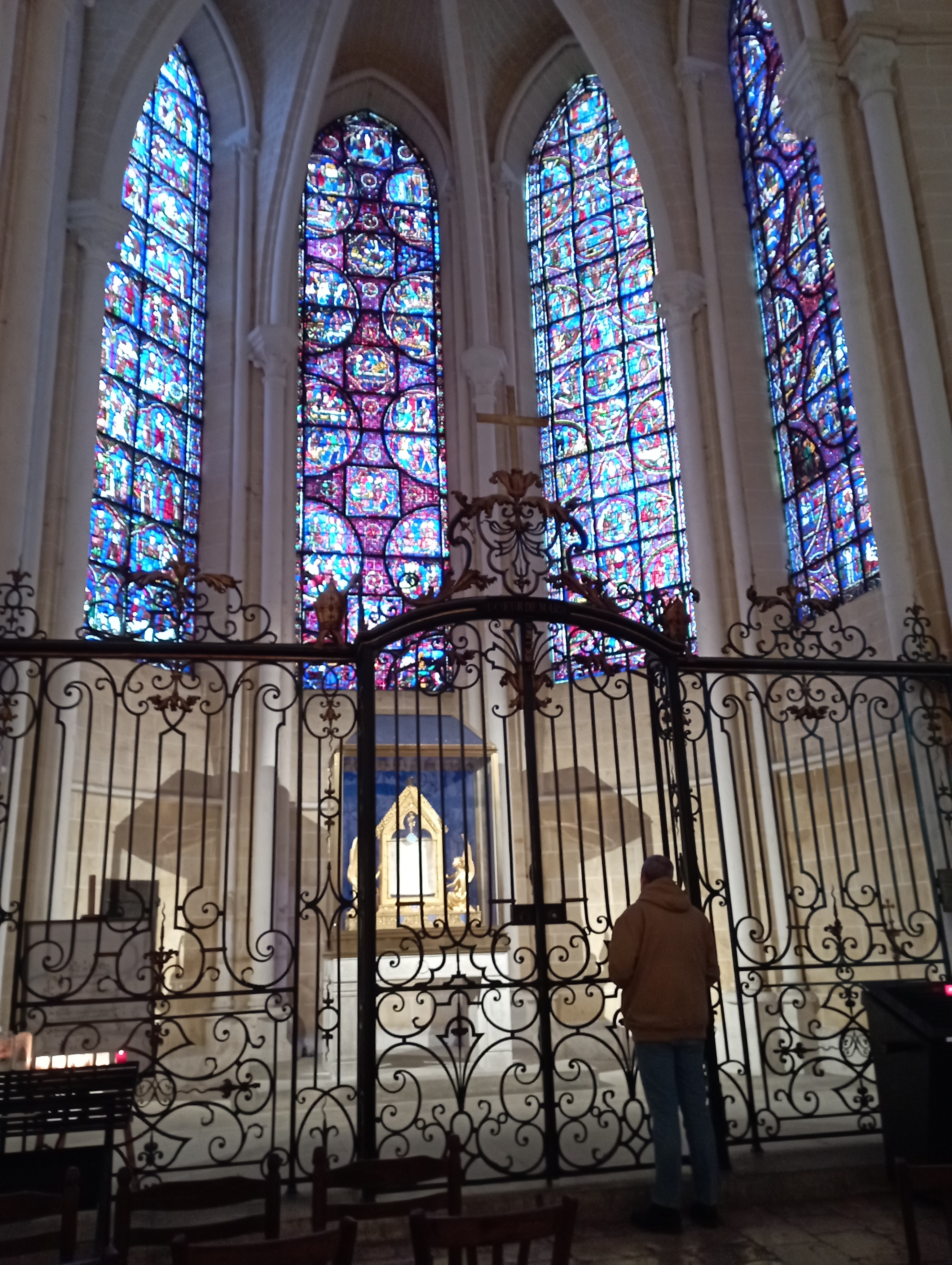 Magnifique. La rénovation redonne une nouvelle clarté autour du chœur, et fait ressortir les vitraux ainsi que les lieux de recueillement plus sombres. Un lieu paisible tout comme les jardins avec cette belle vue. Non loin de là, sur le pignon d'une maison, le visage de Jean Moulin, et toutes les traces de lui dans cette ville. Comme bien d'autres humains courageux et bons, il s'est comporté en Saint. A Chartres et alentour, comme à La Taye, où nous sommes allé nous recueillir, sa présence est partout (il y fut enfermé et battu pour ne pas avoir voulu signer un document qui aurait salit injuste ment des soldats Africains combattant pour la France).