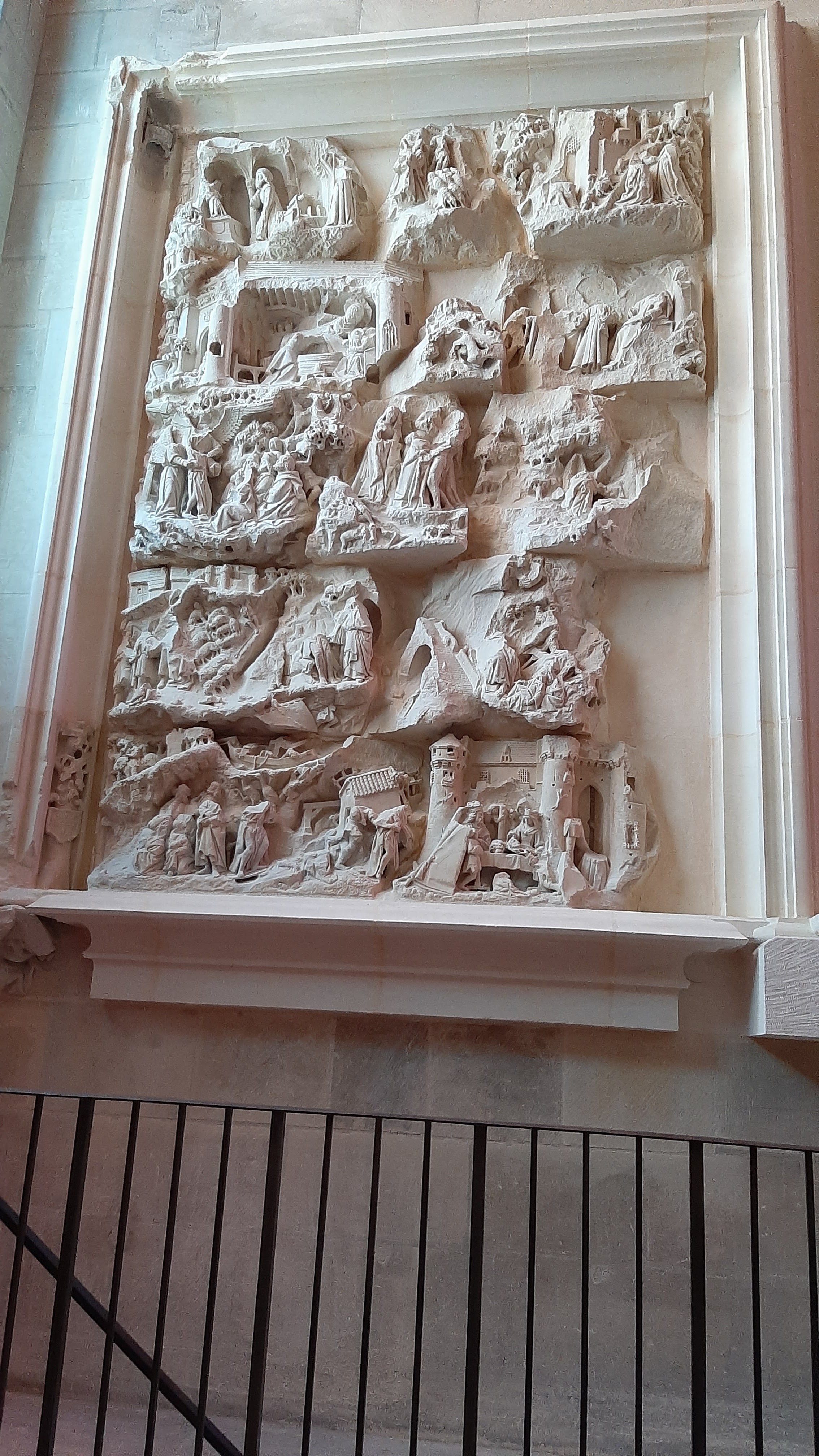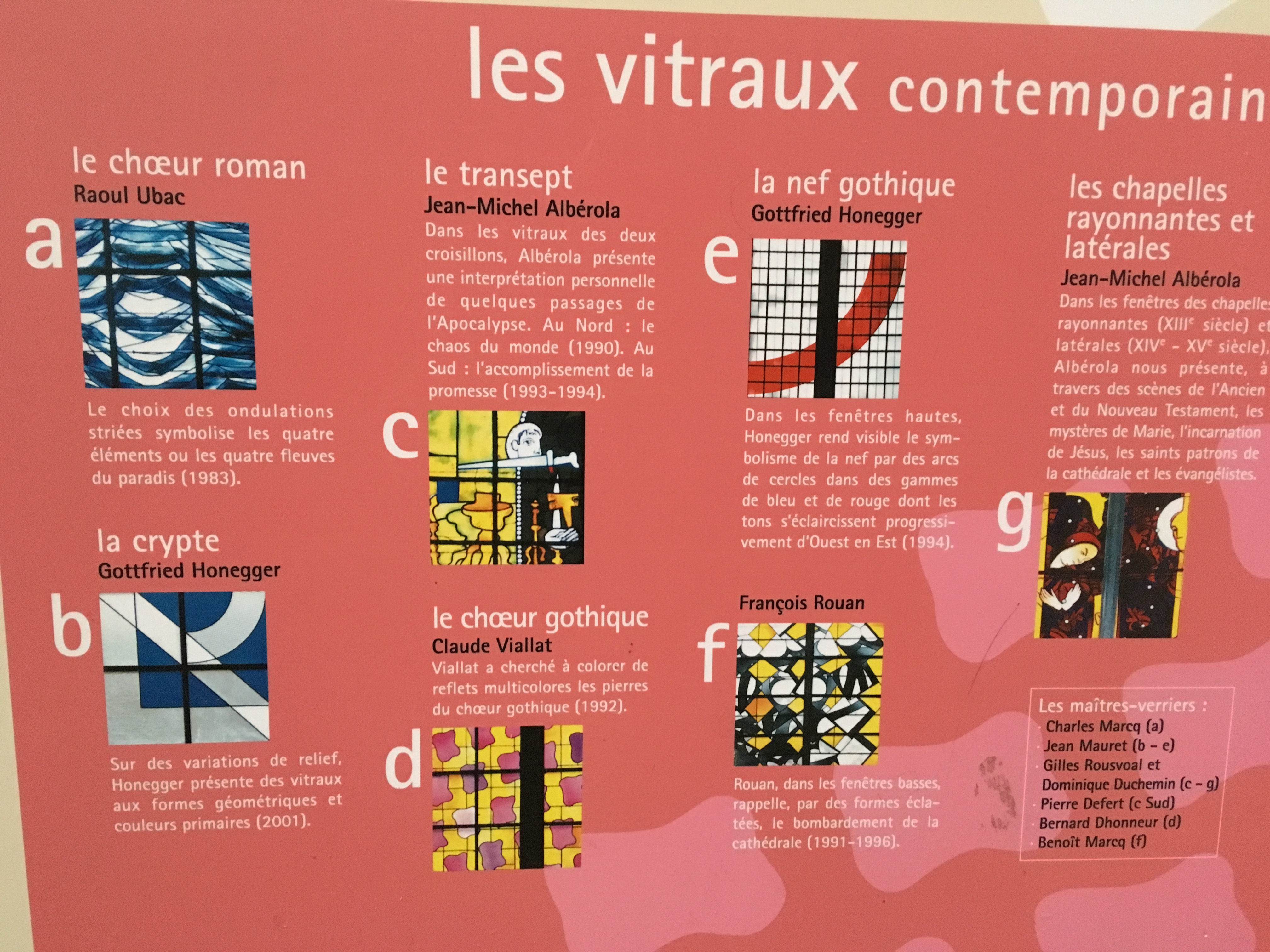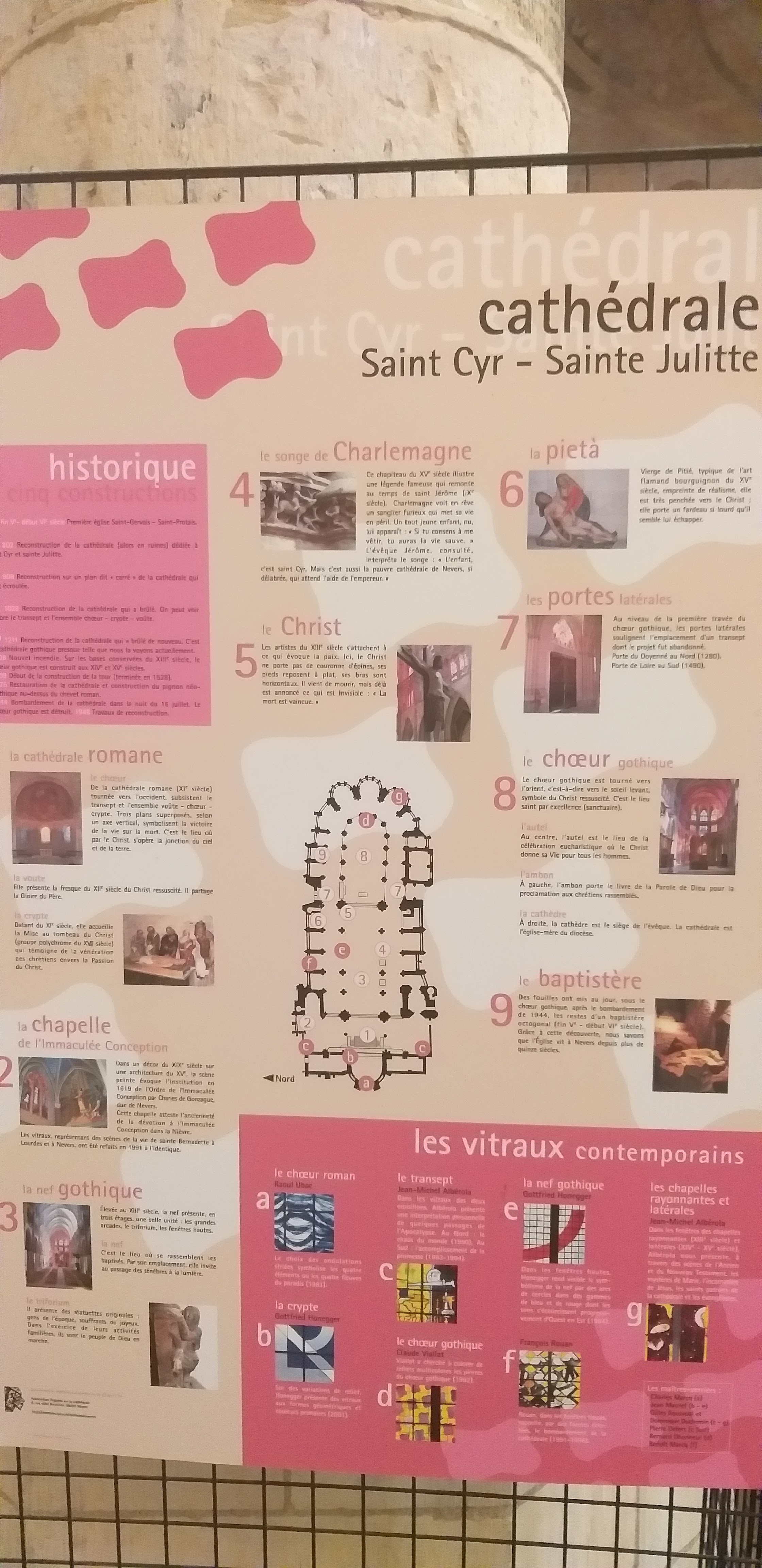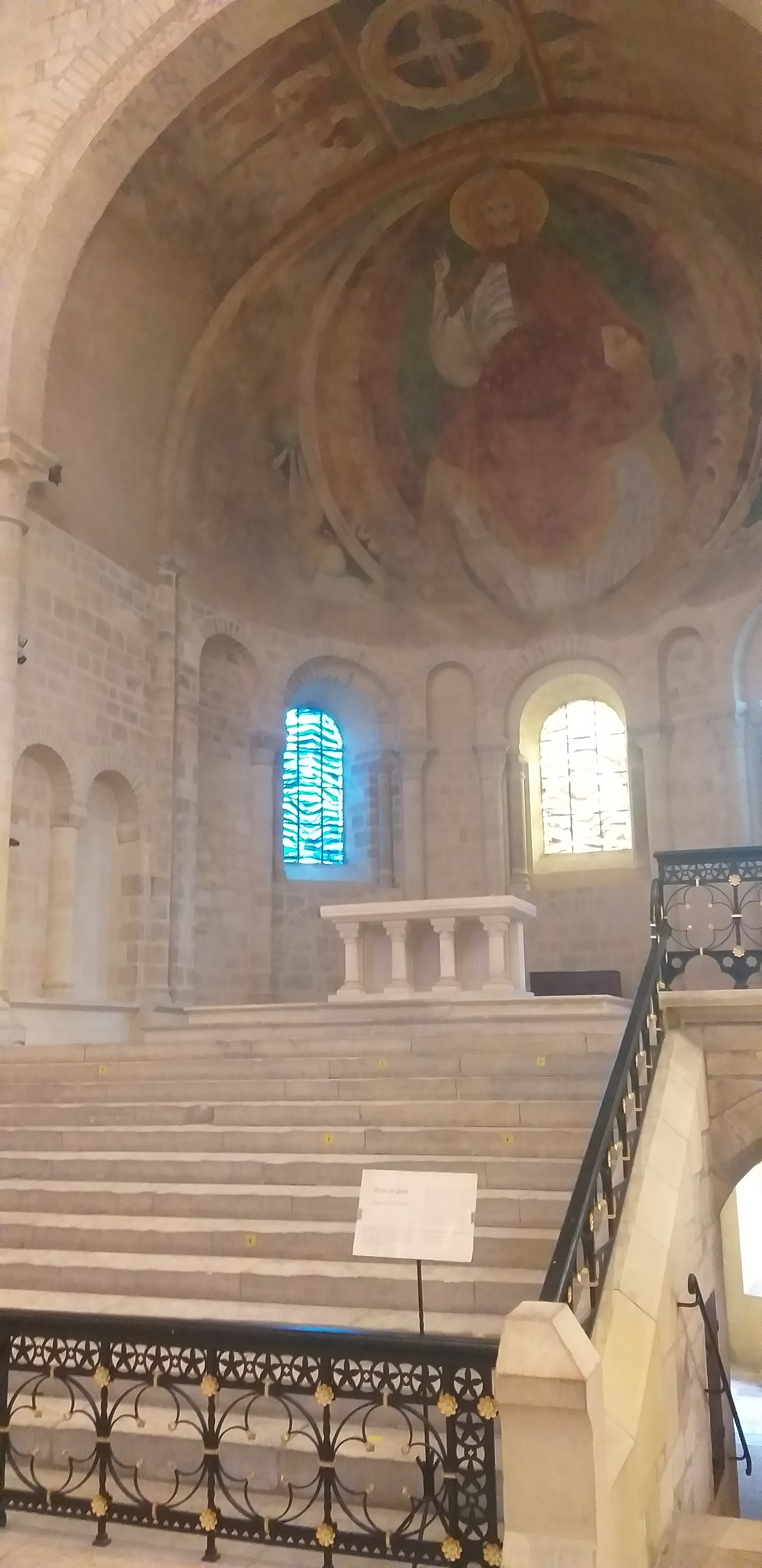 La cathédrale est magnifique. Mais on voit qu’on est en une ville socialiste 😠 Vingt panneaux sur les vitraux modernes de Claude Vaillant dont tout le monde se fout éperdument, et seulement un misérable petit panneau sur le chœur roman de l’église avec l’incroyable fresque du christ en gloire et la crypte à double entrée. Mieux vaut en rire que d’en pleurer.