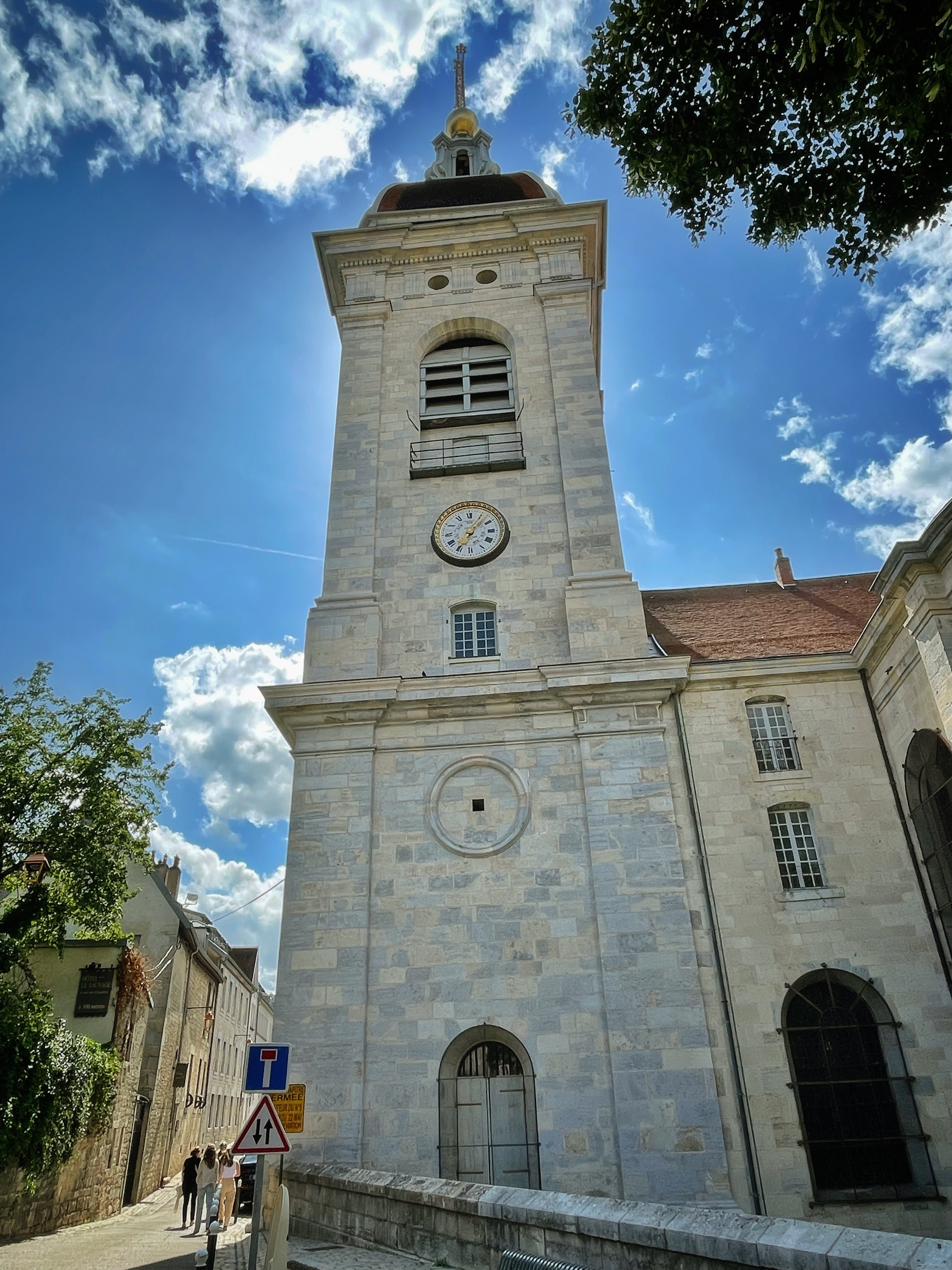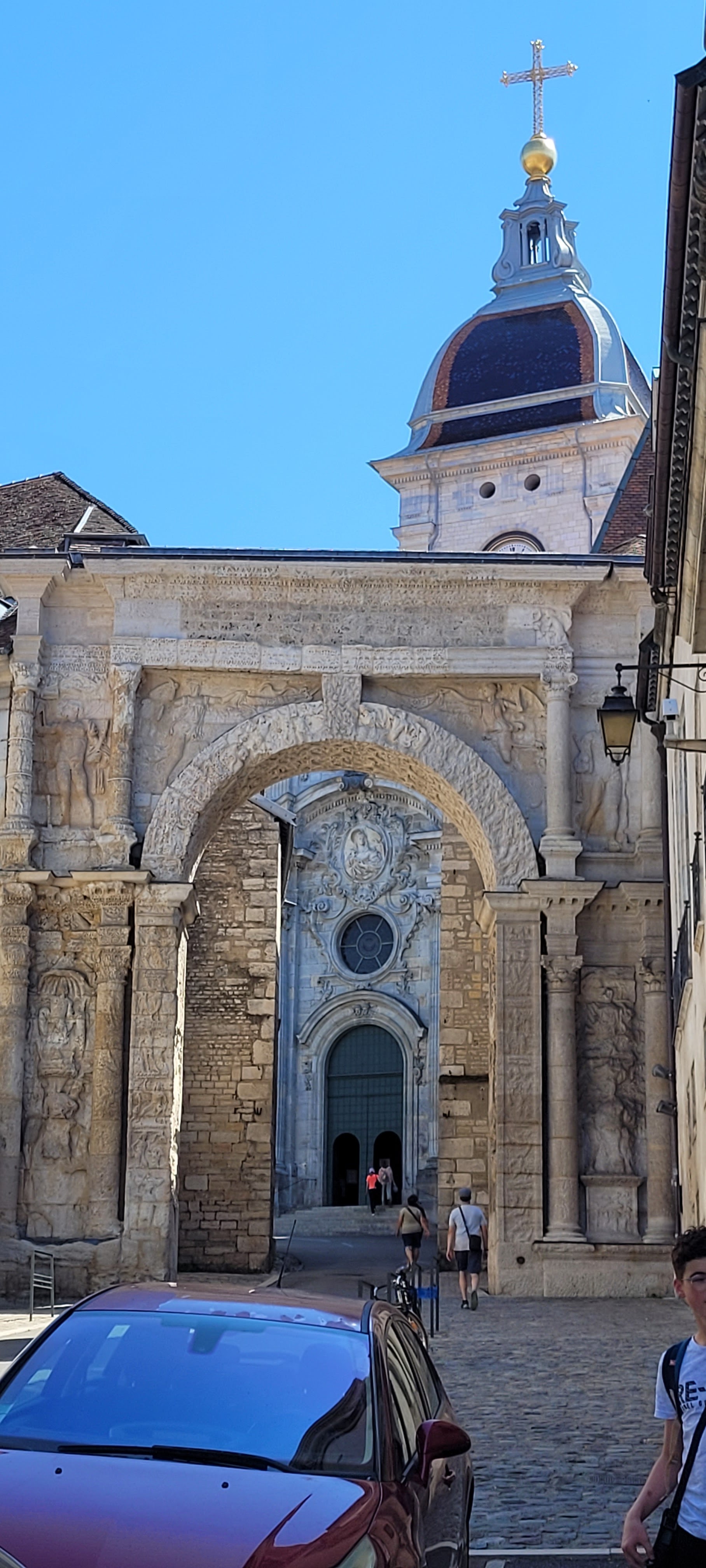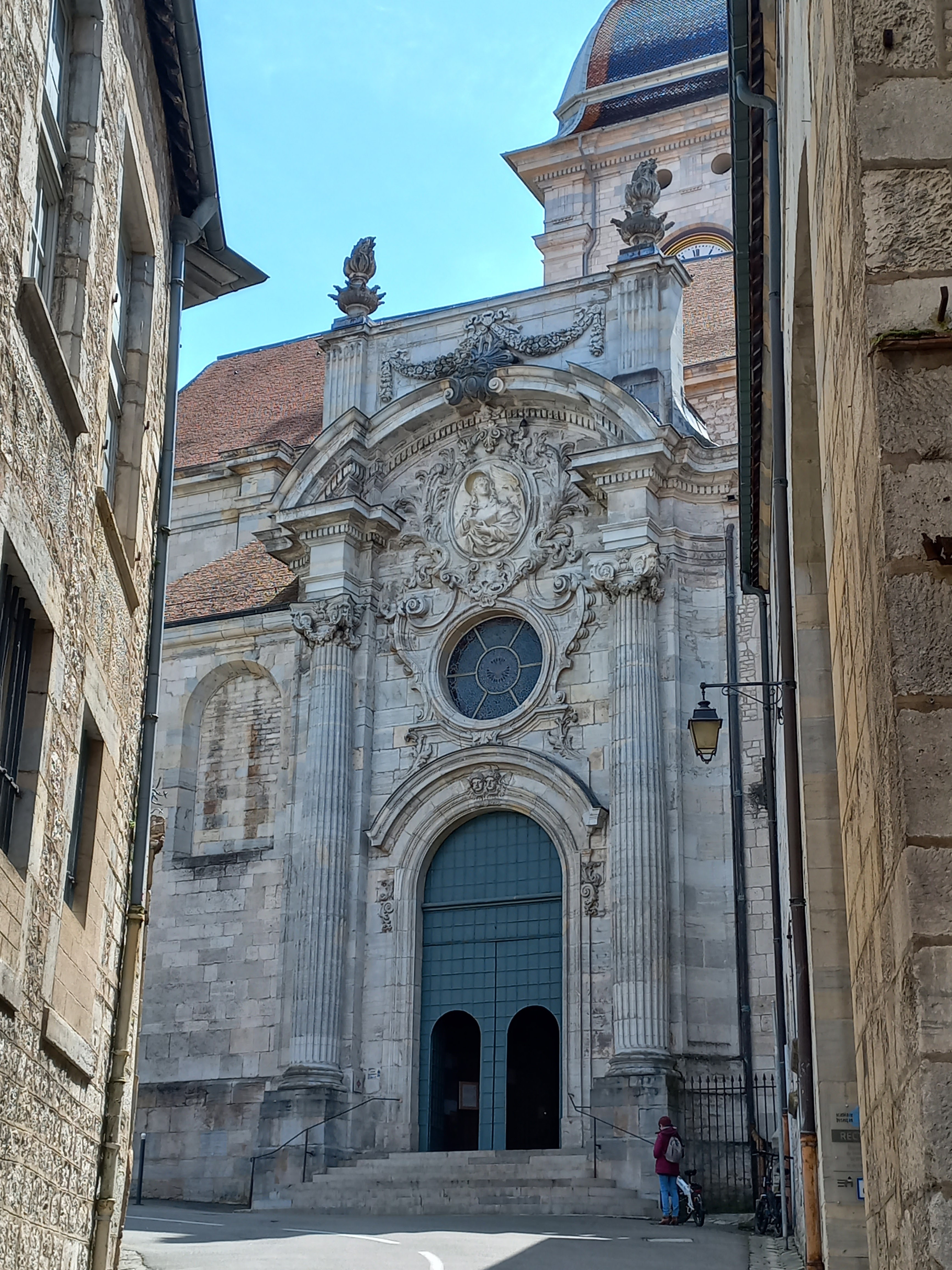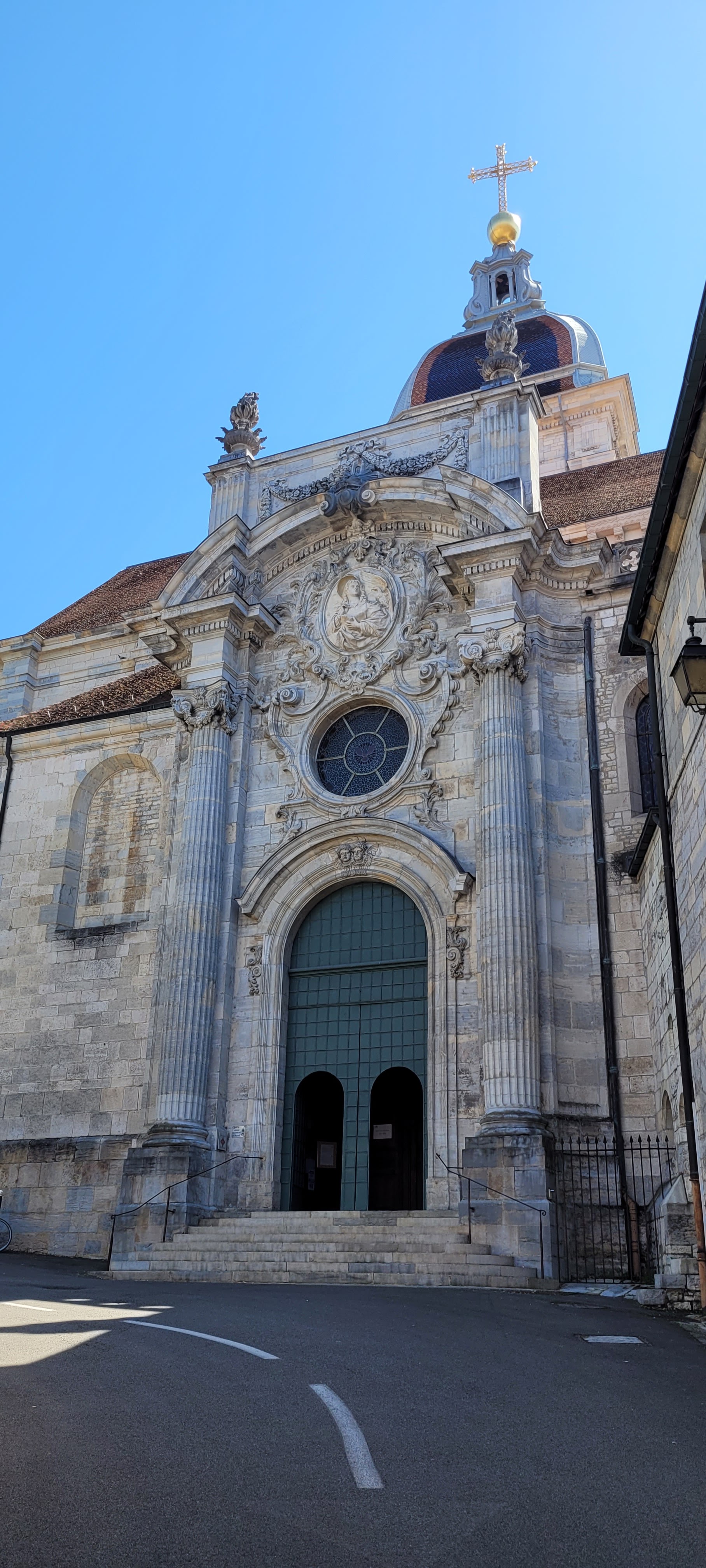 Superbe ! Qu'elle étrange cathédrale ! Entièrement reconstruite au 12e s. à l'emplacement d'une première cathédrale (9e s.) bâtie elle-même sur un groupe épiscopal du 5e s., elles a été profondément remaniée au 13e puis au 18e s. D'une grande discrétion extérieure, l'absence de portail principal et la présence de deux absides opposées, dotées chacune d'un chœur. À voir l'abside du Saint-Suaire, la Vierge aux saints, tableau de Fra Bartolomeo, une Vierge à l'Enfant de Dominico Cresti que l'on appelle également « Vierge des Jacobins » chère aux cœurs des Bisontins.