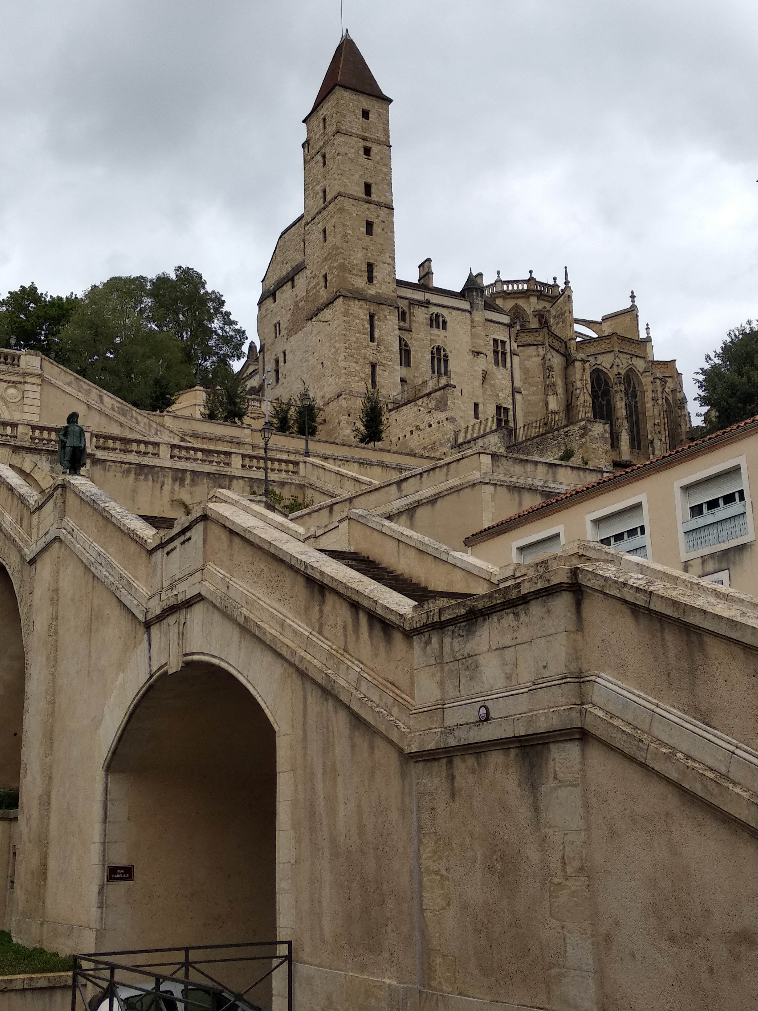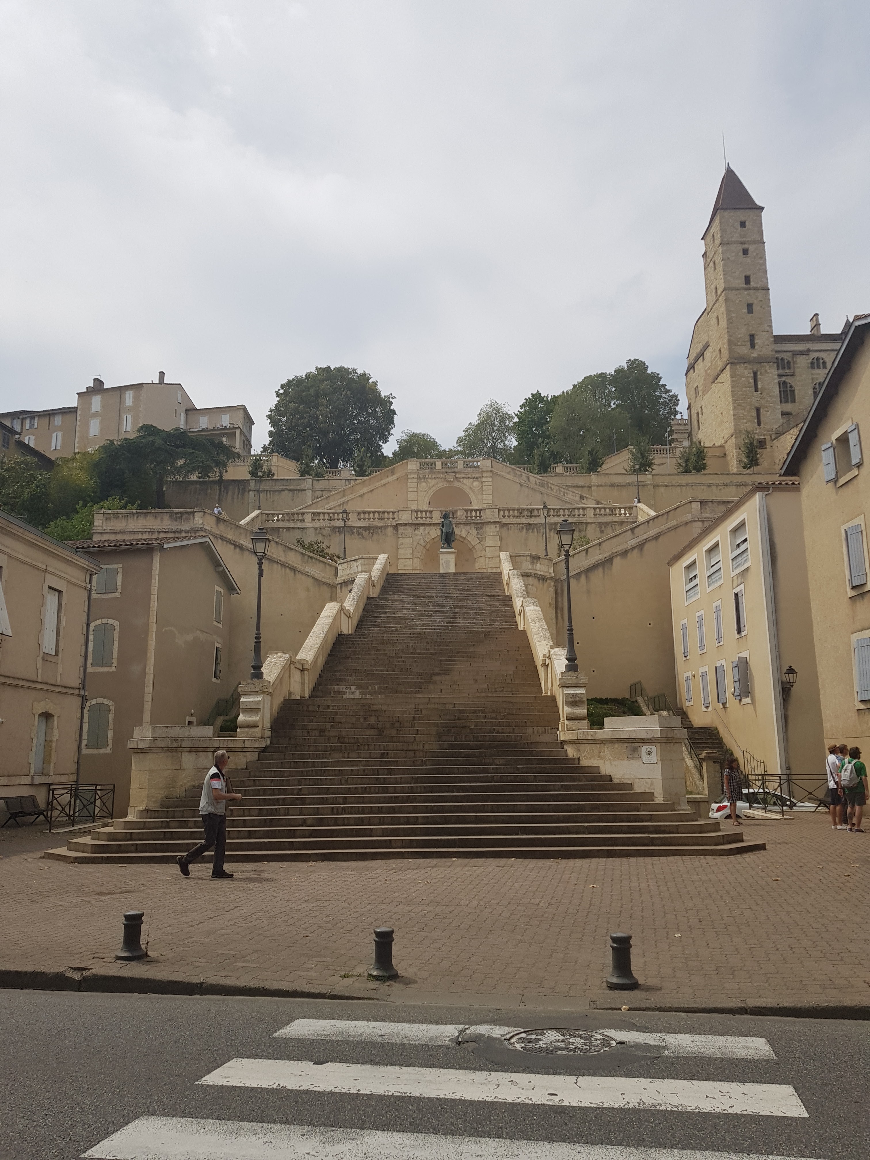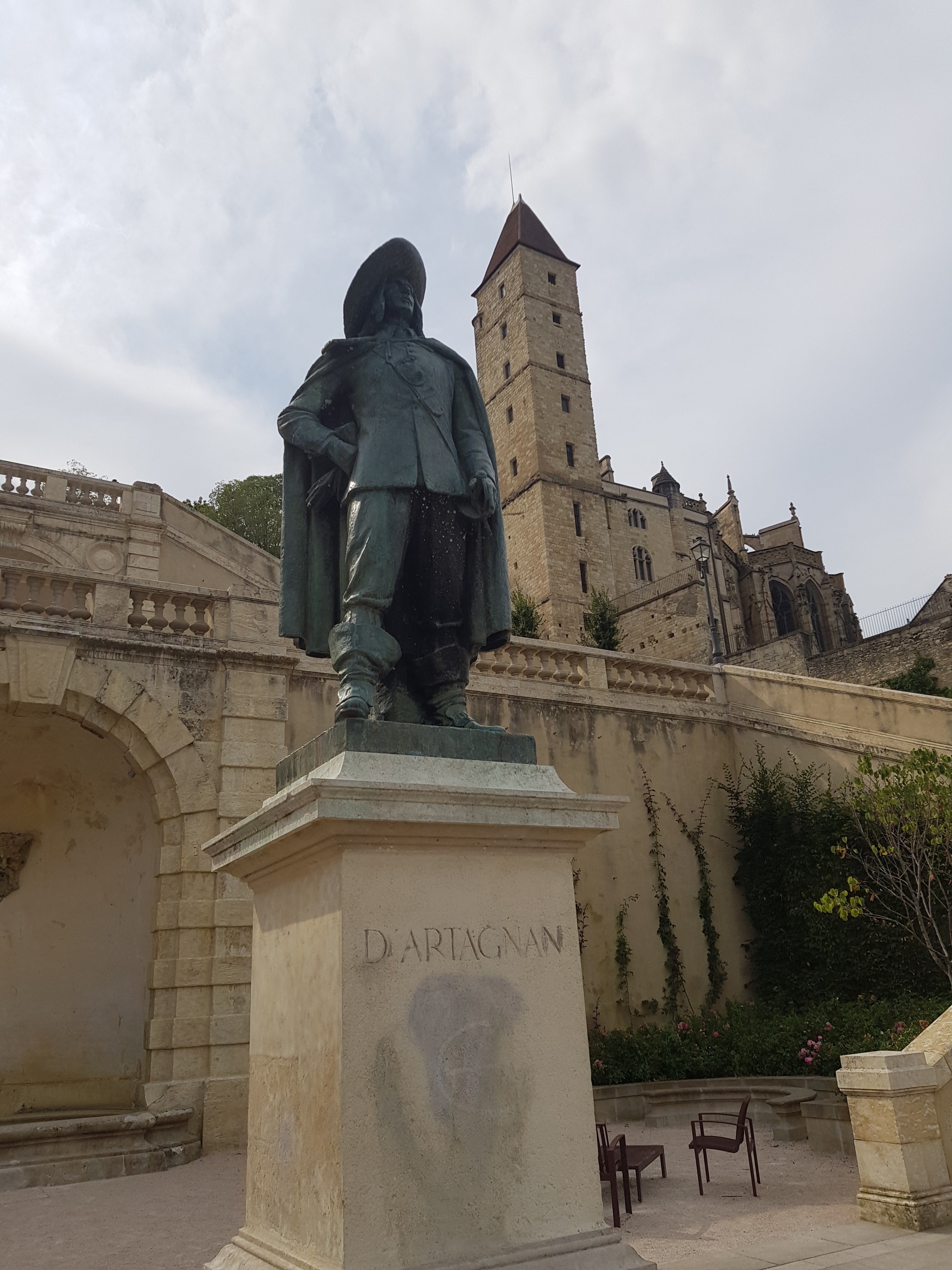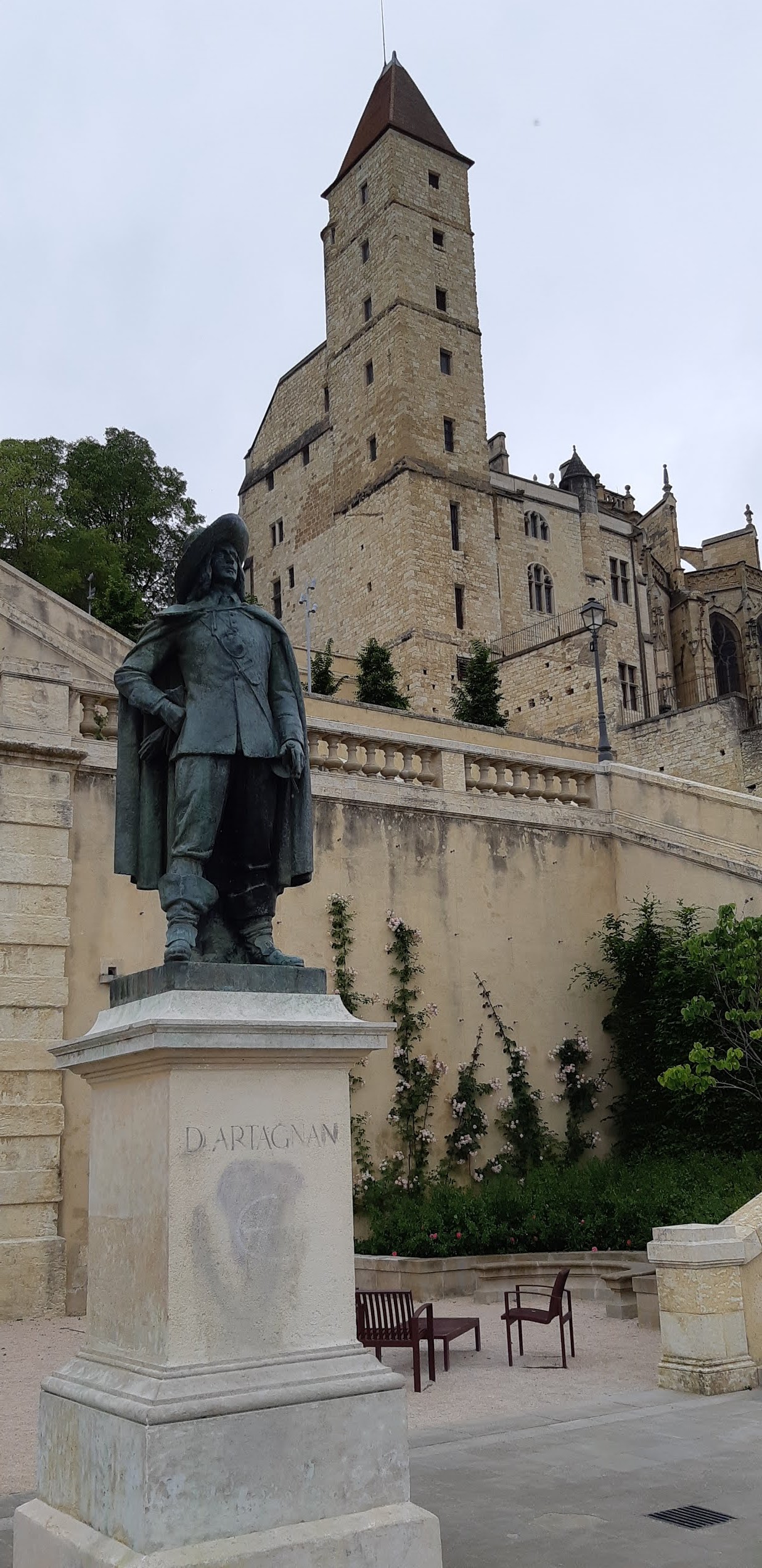 La vieille ville est située sur une colline avec cette cathédrale entourée d un bourg composé d anciennes batisses. L escalier est impressionnant avec a son départ la statue de d Artagnan. Dommage que le musée ne soit pas encore ouvert. Cela fait deux fois que nous passons dans cette ville pour le visiter.