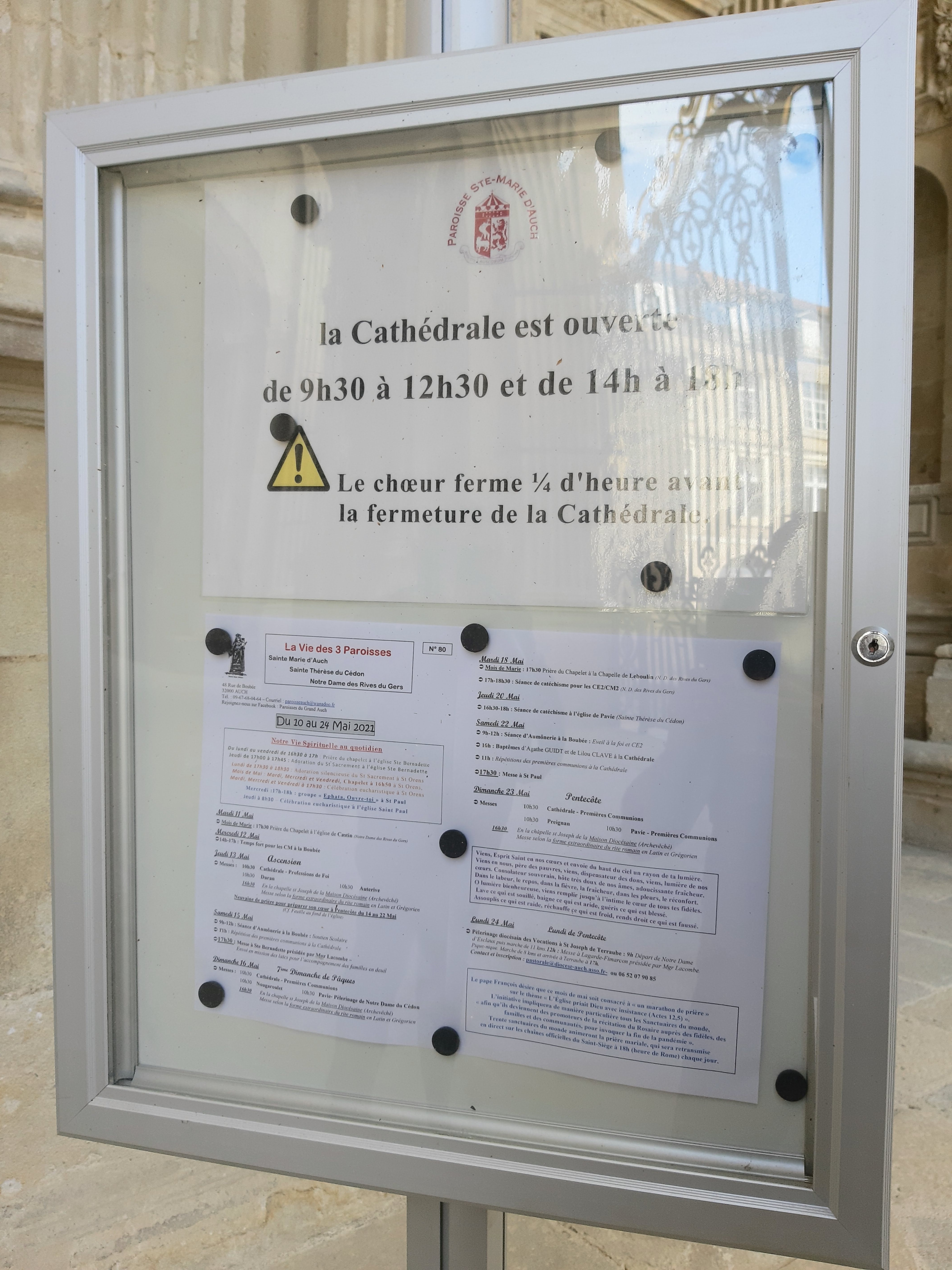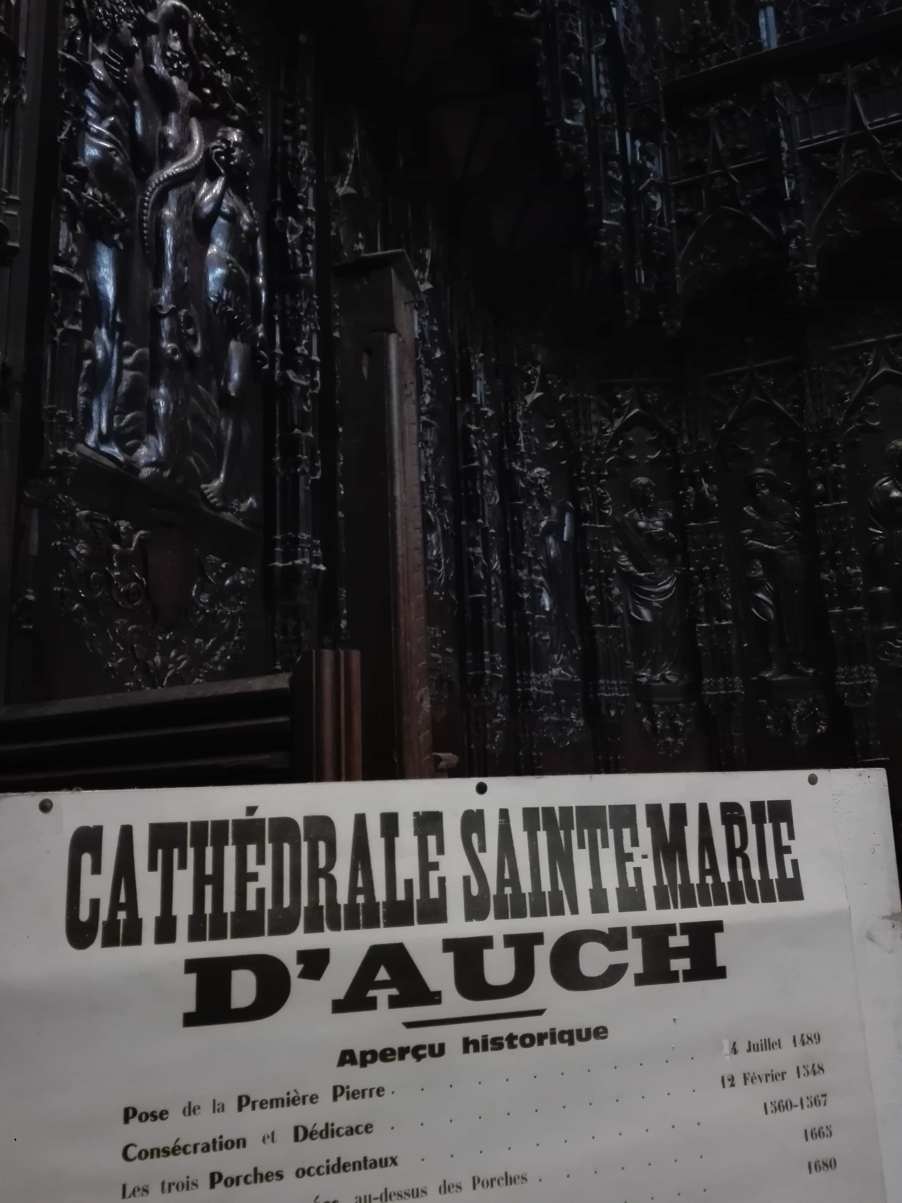 De passage à Auch pour une visite de la ville quelle ne fut pas notre déception de trouver la cathédrale fermée entre 12 et 14 heures, comme la plupart des boutiques de la ville. Incompréhension de cette décision pour ce lieu de recueillement et de prières nous espérons un jour revenir à Auch et trouver ces portes ouvertes.
