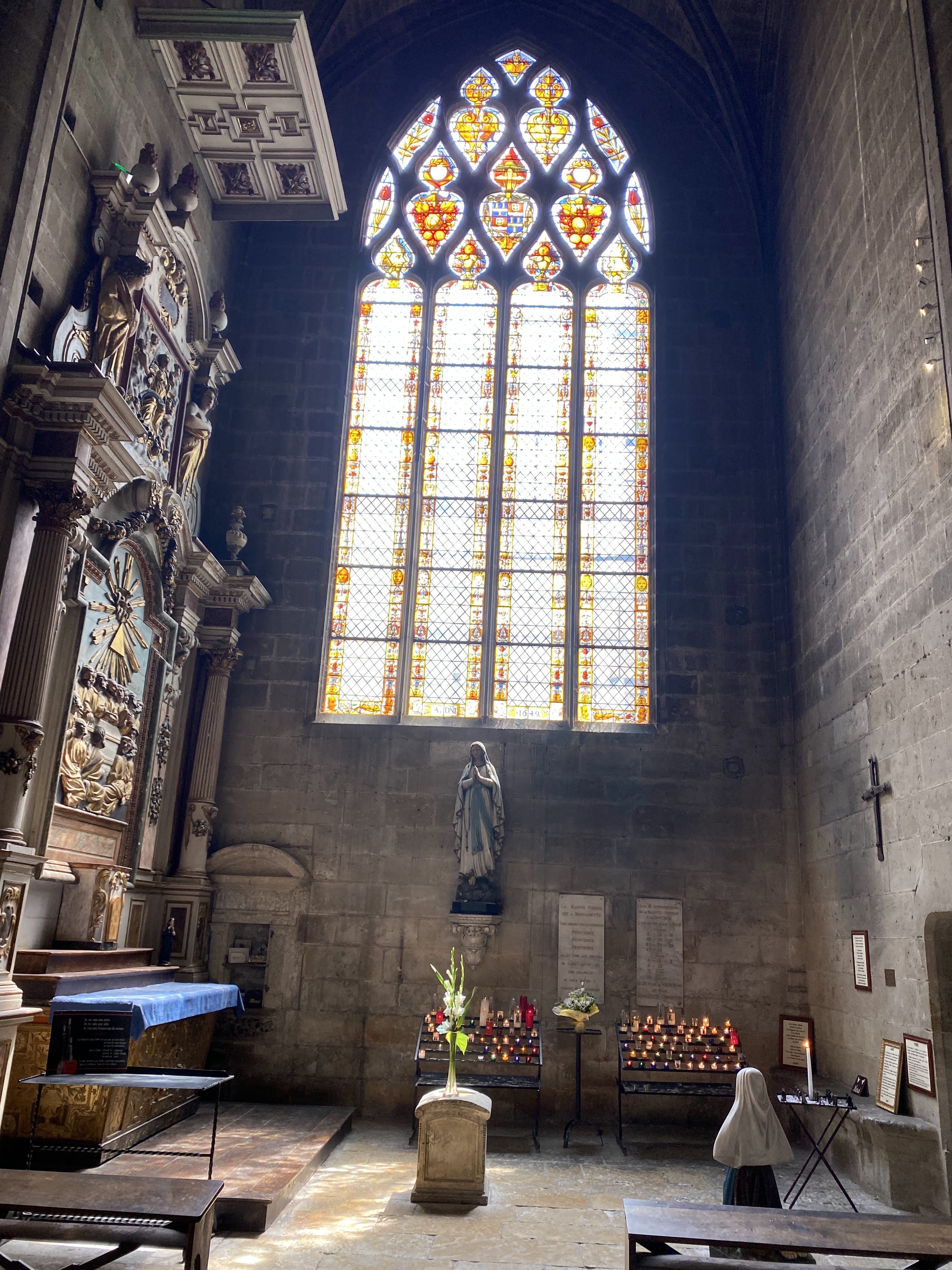 C'est toujours un plaisir de rentrer dans la cathédrale d'Auch. Les vitraux d'Arnaud de Môles sont magnifiques et c'est surprenant qu'un tel verrier soit si peu connu. Visitez bien sûr les stalles toutes sculptées de différents personnages et certains sont vraiment surprenants dans une église... Les 2 orgues qui se font face. La vierge d'Auch près de l'hôtel. Et en entrant à gauche vous avez une magnifique pieta sculptées par Daphné du Barry.
