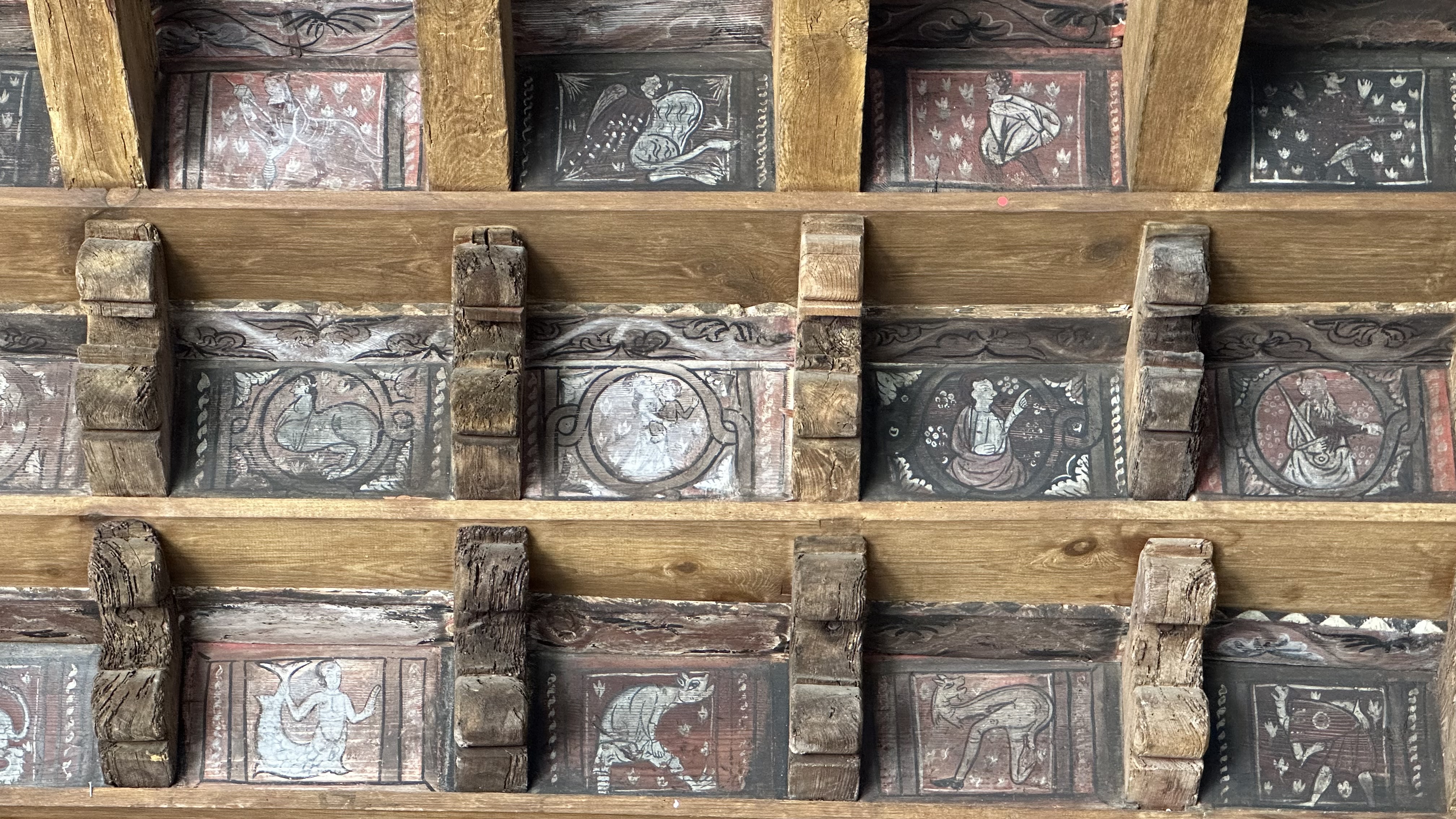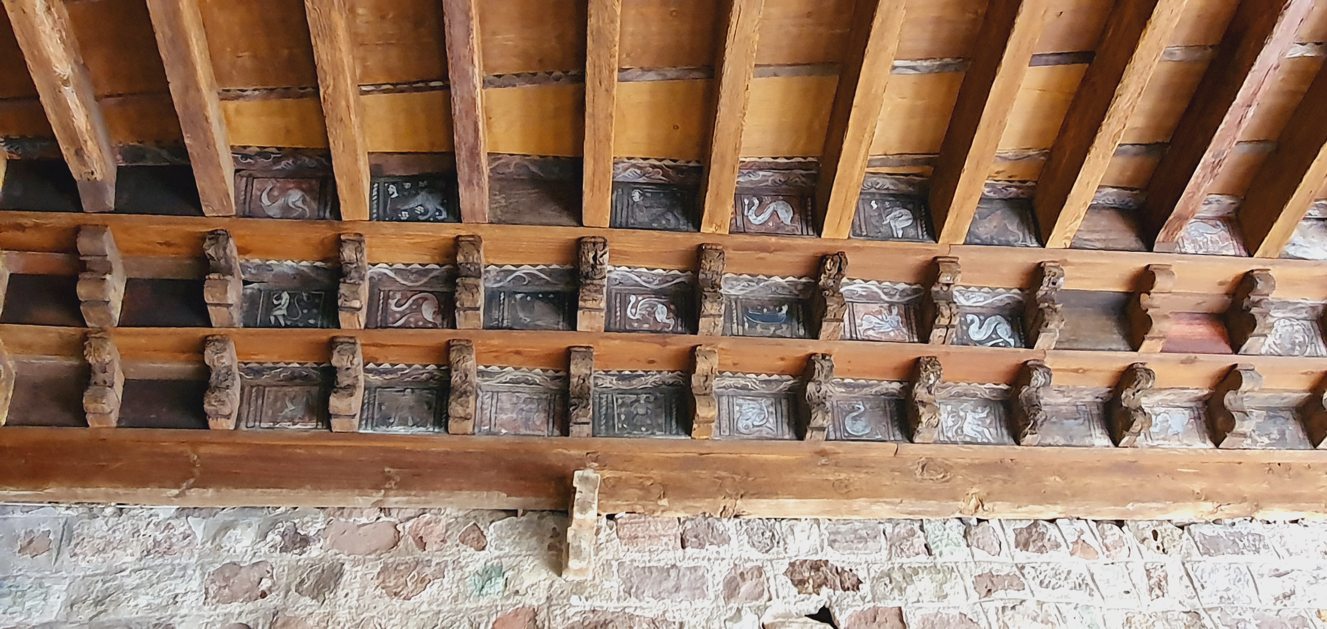 Sur le côté de la cathédrale, par une entrée indépendante, admirez ce petit cloître unique en France : sur sa charpente en bois, vous y verrez des dessins représentant de la vie quotidienne et des animaux. A voir avec une lanterne fournie par l'accueil. Comme on dit à ce moment-là : BLUFFANT. Ne manquez pas la video explicative à ce sujet dans une salle à part ainsi que d'autres détails sur la construction de ce cloître à l'étage.