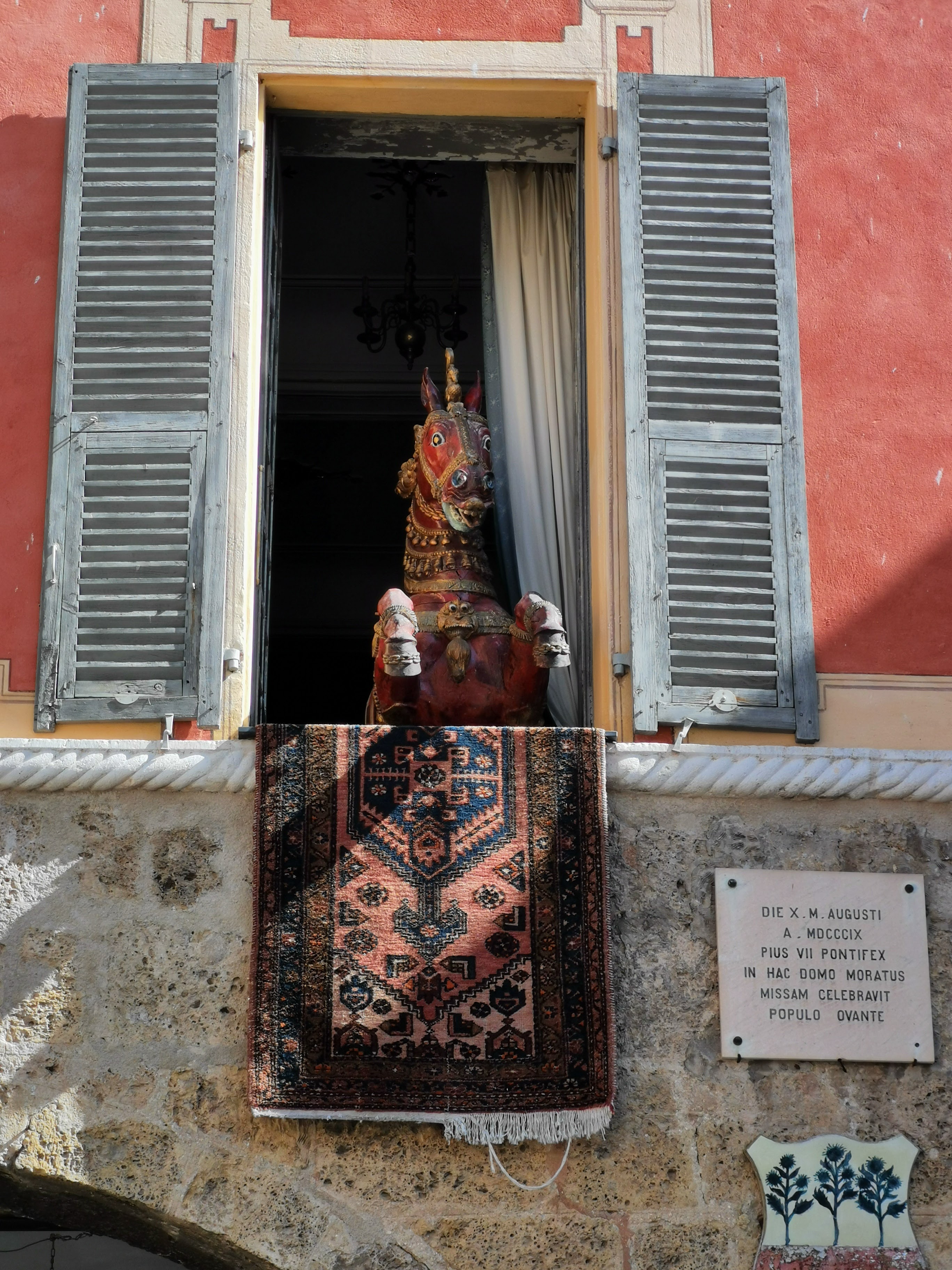 TRES BELLE ! NE PAS LOUPER SUR LA PLACE À UNE FENÊTRE D'UN APPARTEMENT UN CHEVAL EN BOIS QUI SORT SA TÊTE PAR LA FENÊTRE !