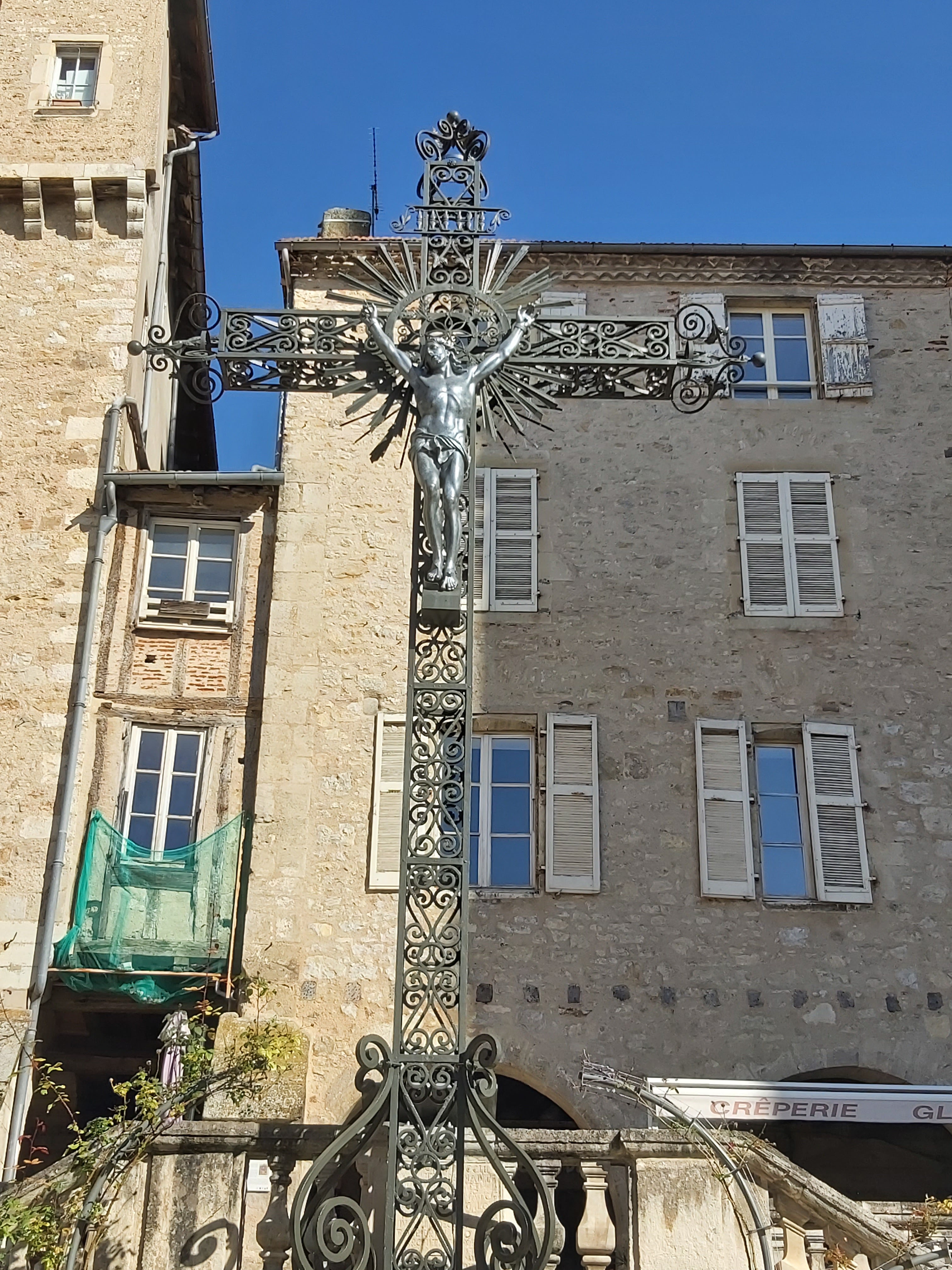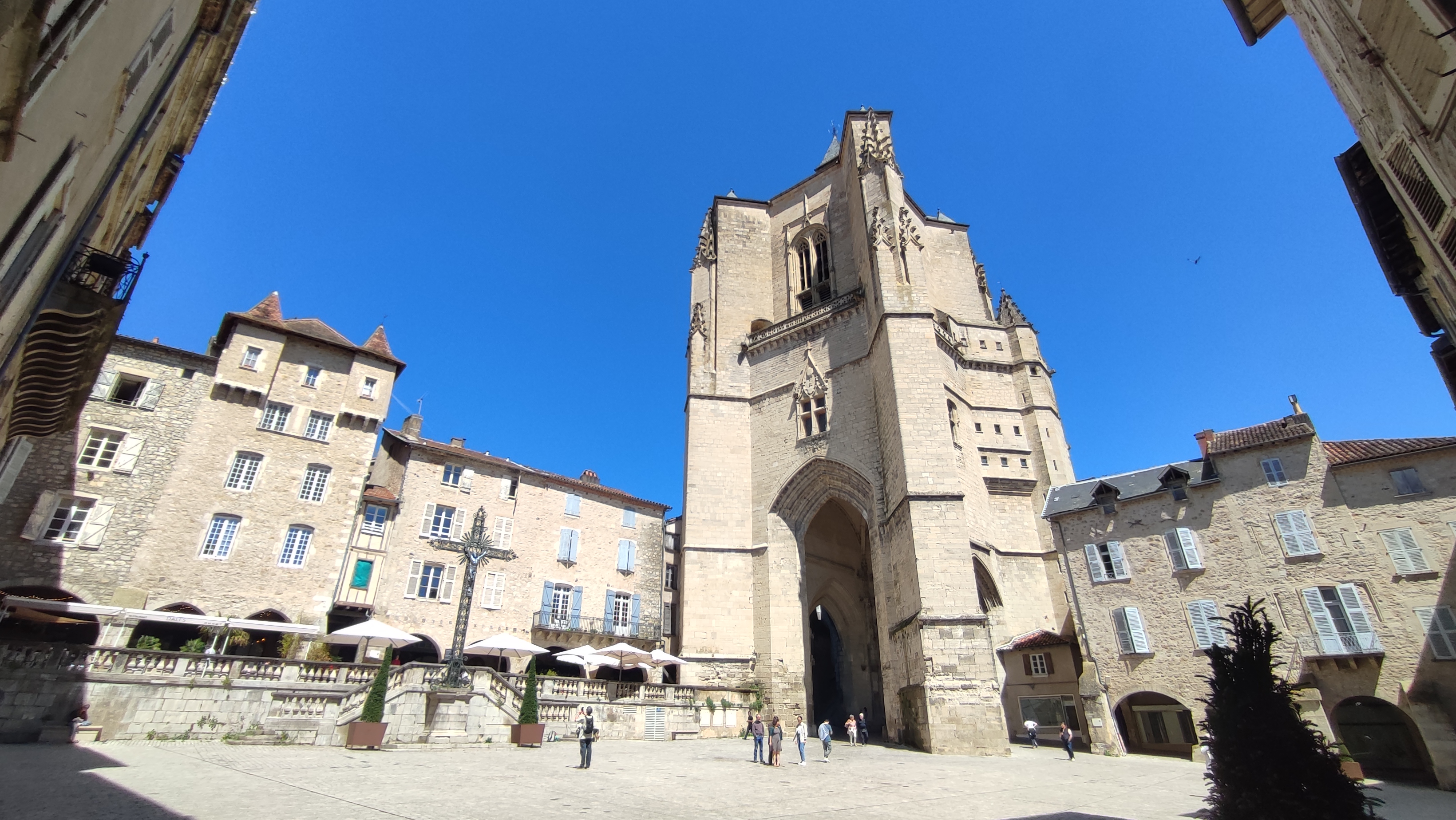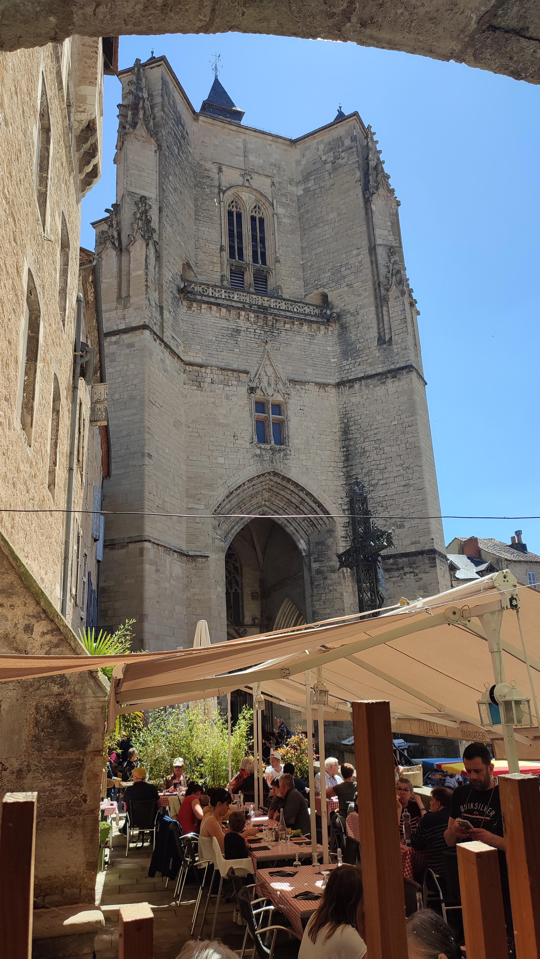 Un lieu où les forces du sacré se rencontrent. Tous les jeudi matin qu'il pleuve, vente, gèle ou encore qu'il fasse un soleil de plomb... Se tiennent les commerçants des alentours, de la jeune mamette au fromager ( de Saint Cirq Lapopie), des sœurs fromagères à l'artisan tisanière, du poissonnier au volailler... Un régal qui se poursuit une rue latérale plus haut, sur le flanc gauche en partant du parvis de la Collégiale, avec les Halles où fleurent bon olives et houmous, ail confit et saucissons. Seul grand absent de ces festivités hautes en couleurs et parfums, le célèbre gâteau à la broche. Peu d'artisans le vendent et le pâtissier renommé de Villefranche le vend très cher.