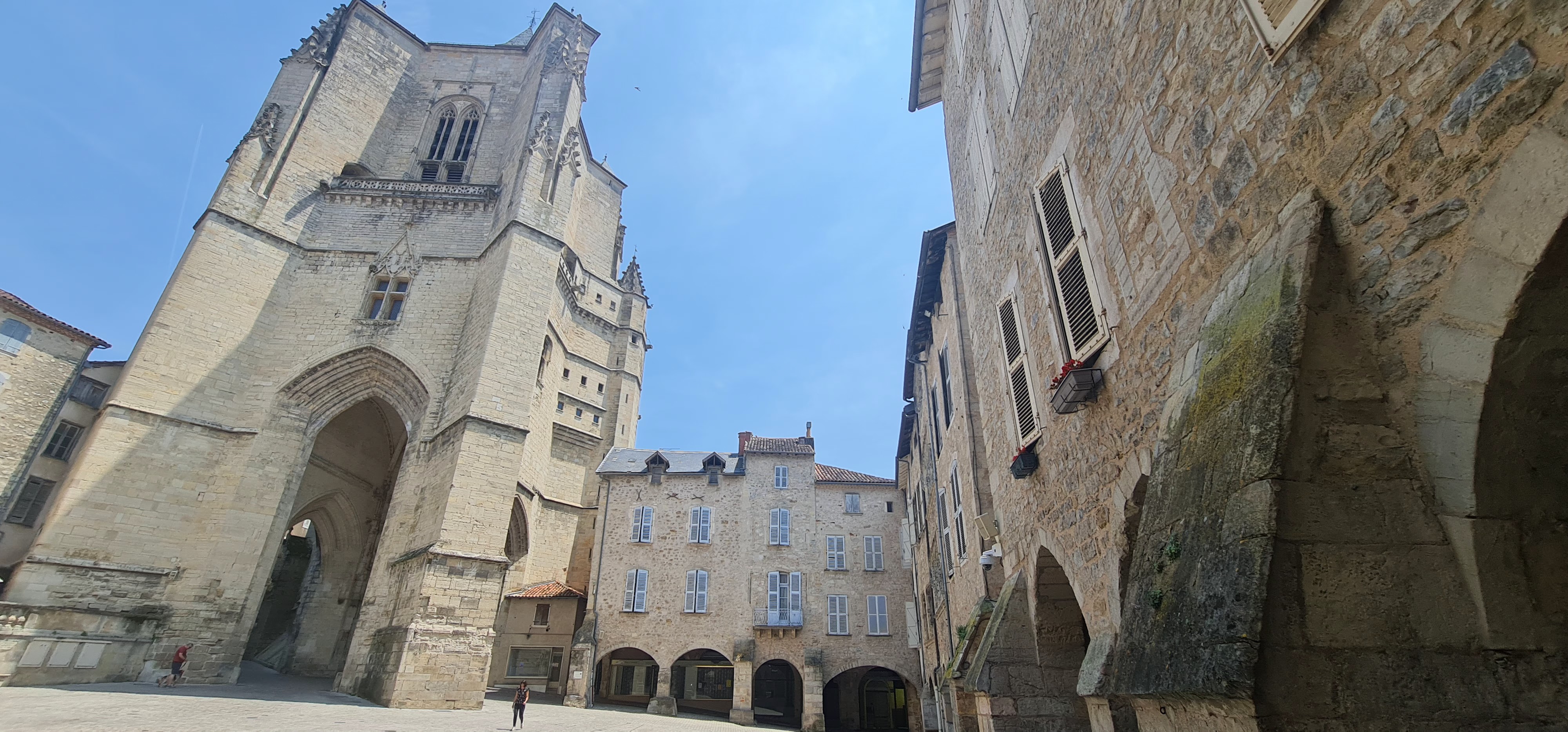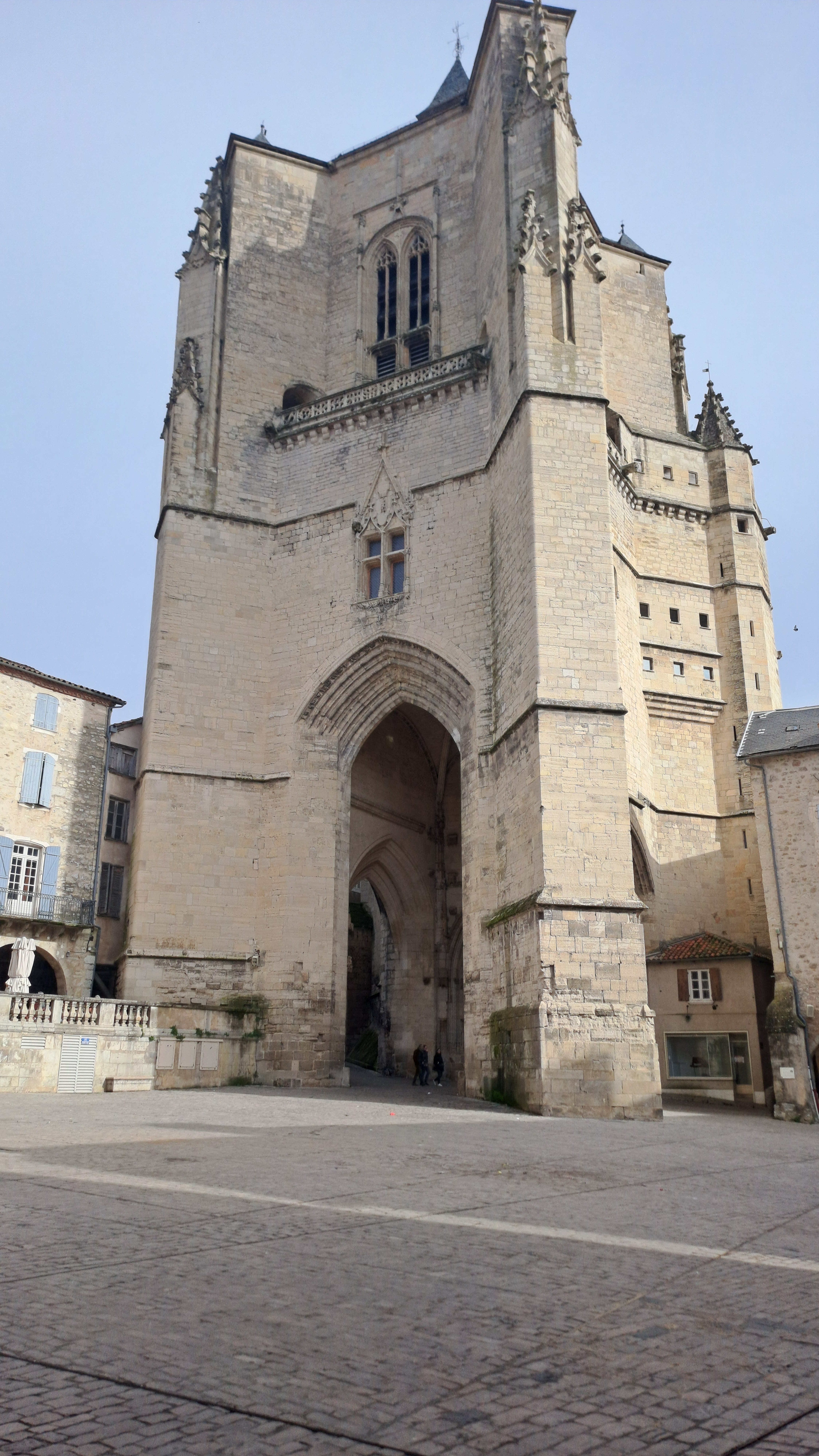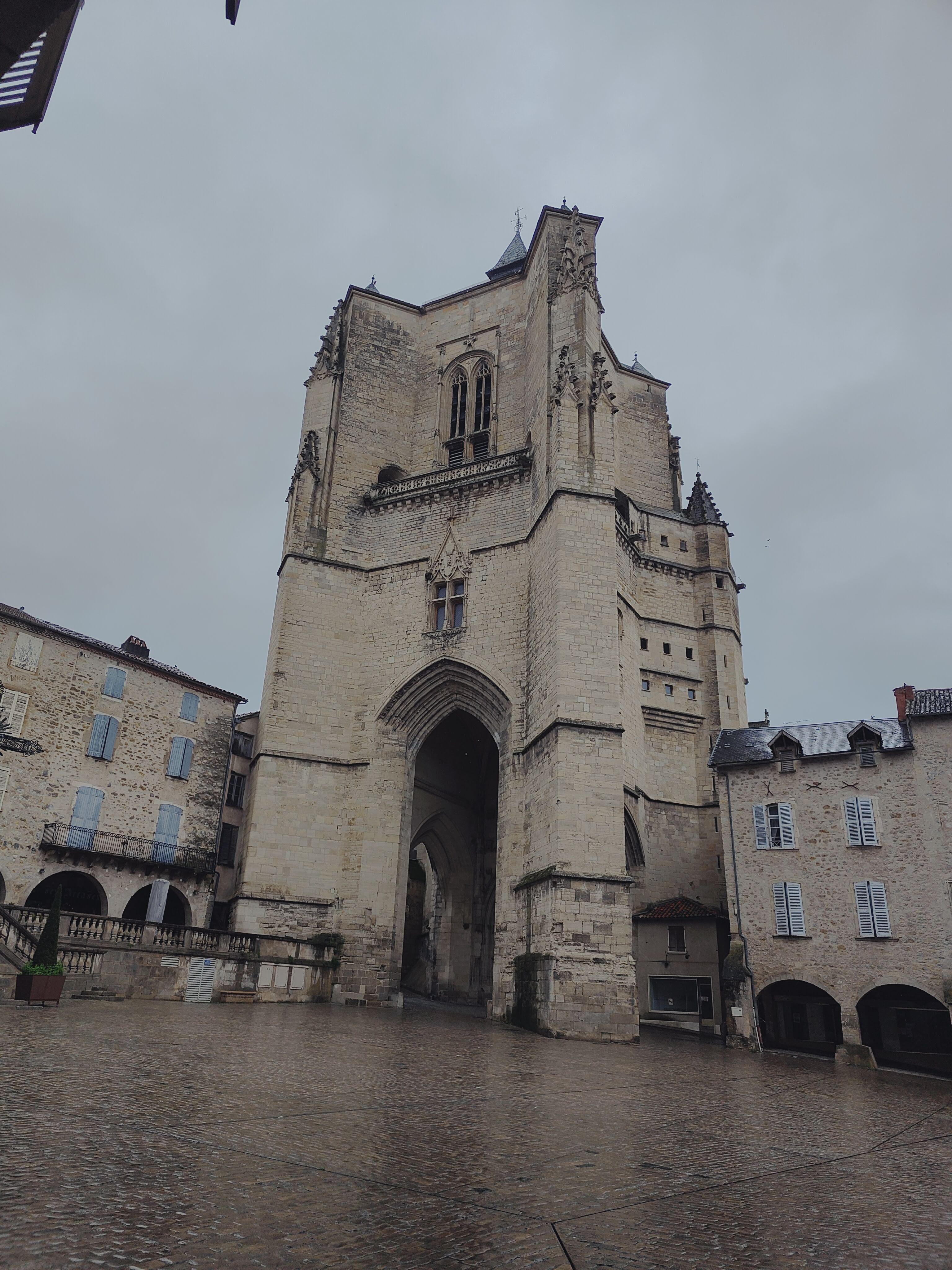 Belle cathédrale qui débouche sur une place pavée. Belle bastide