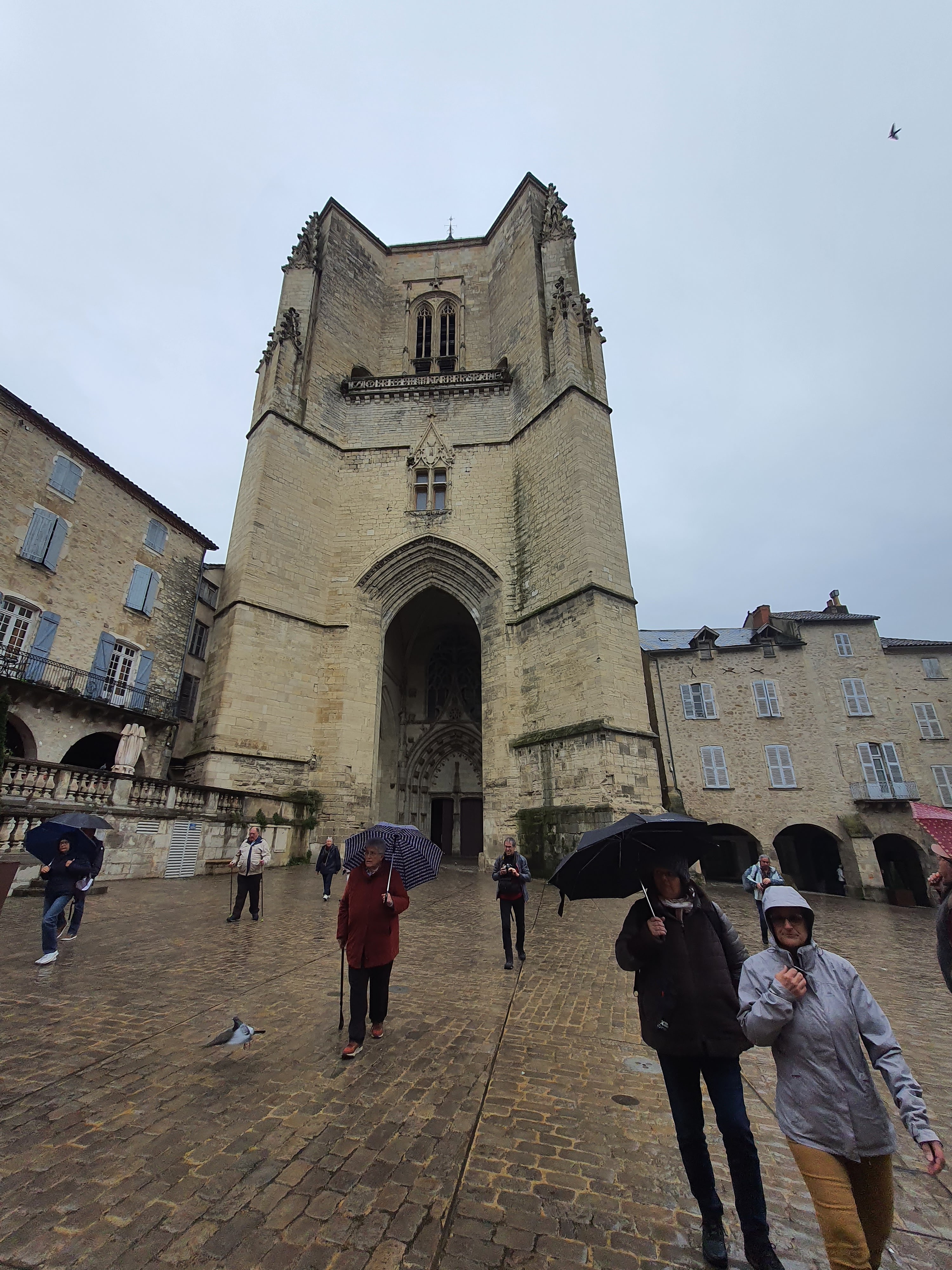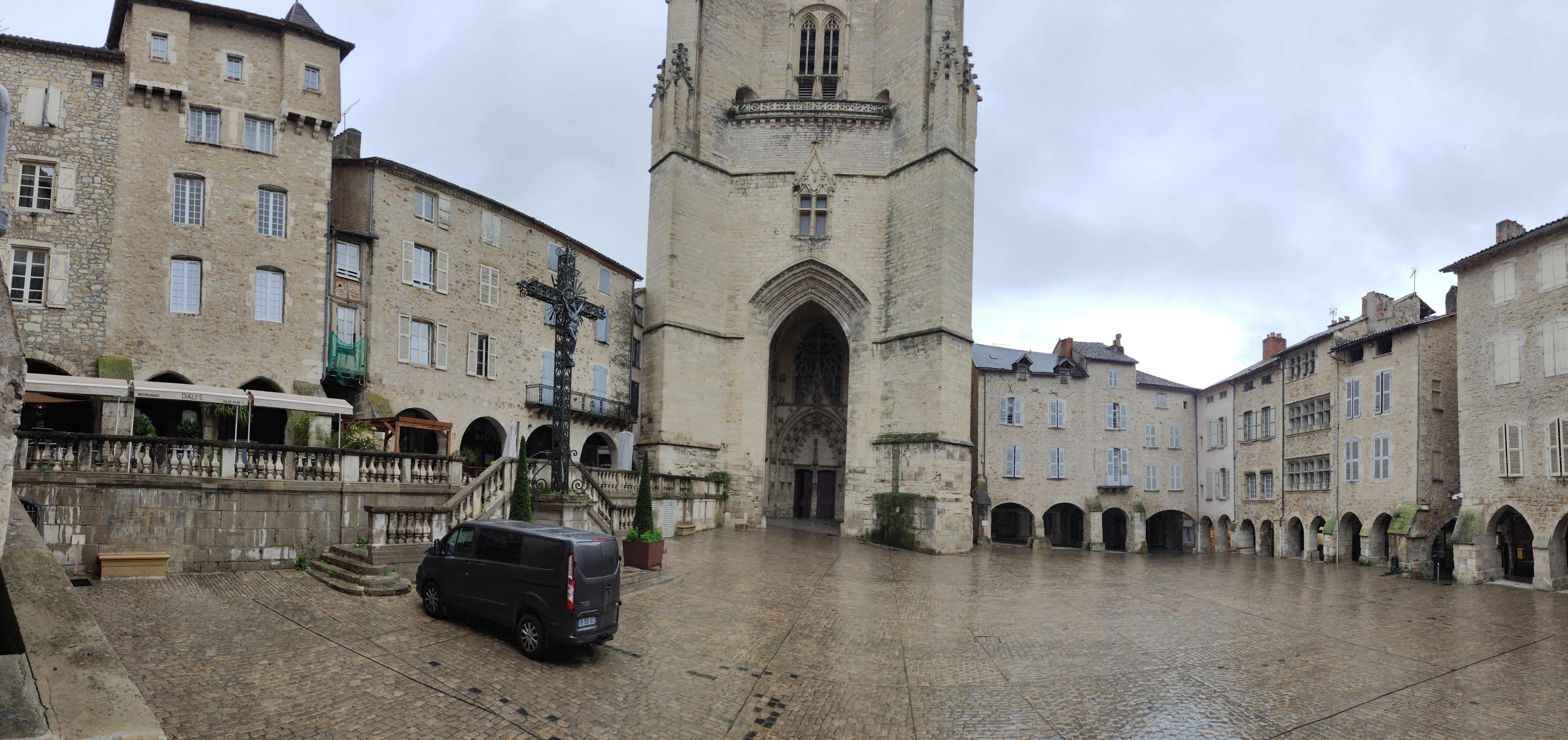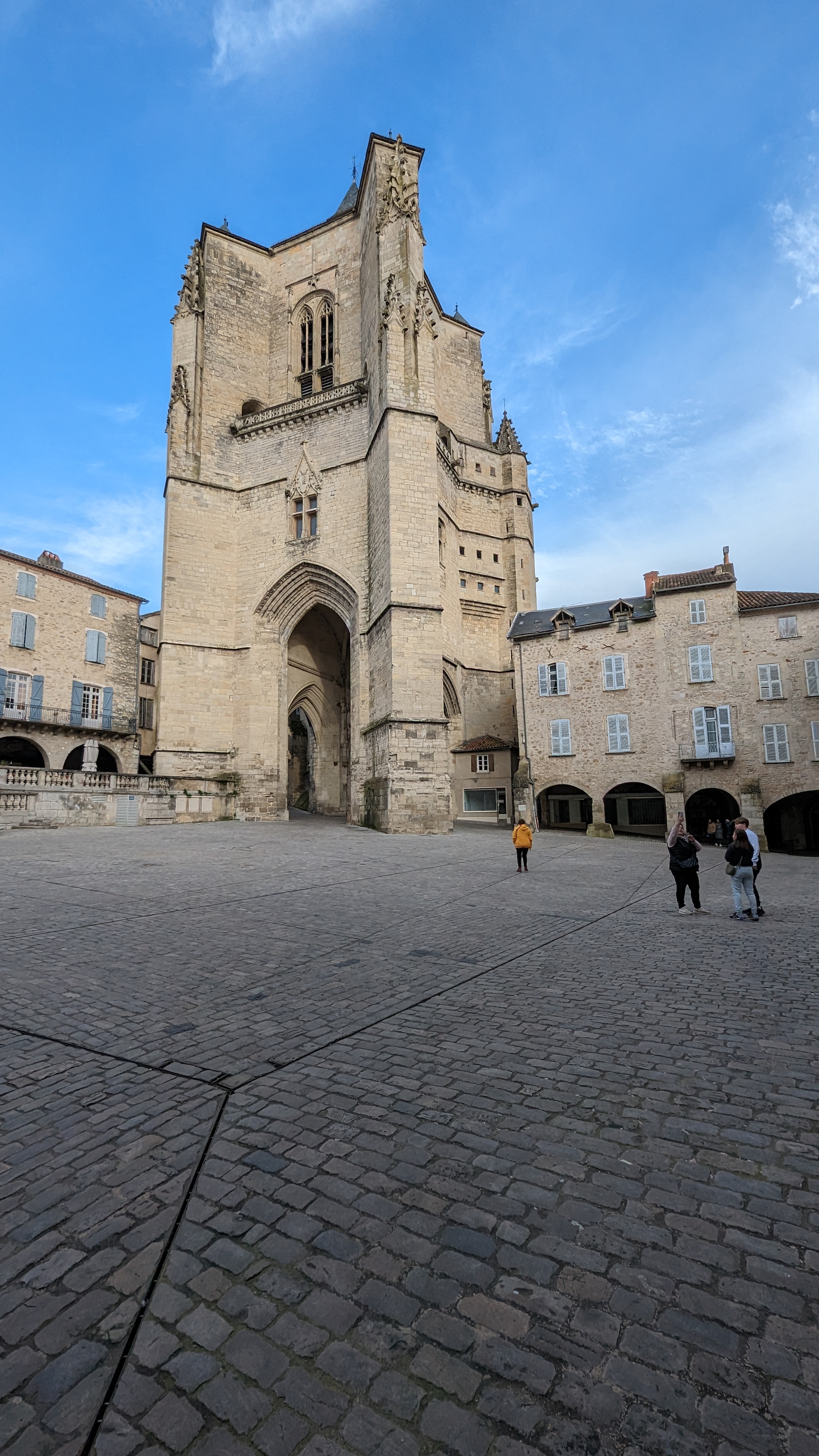 Belle cathédrale qui débouche sur une place pavée. Belle bastide
