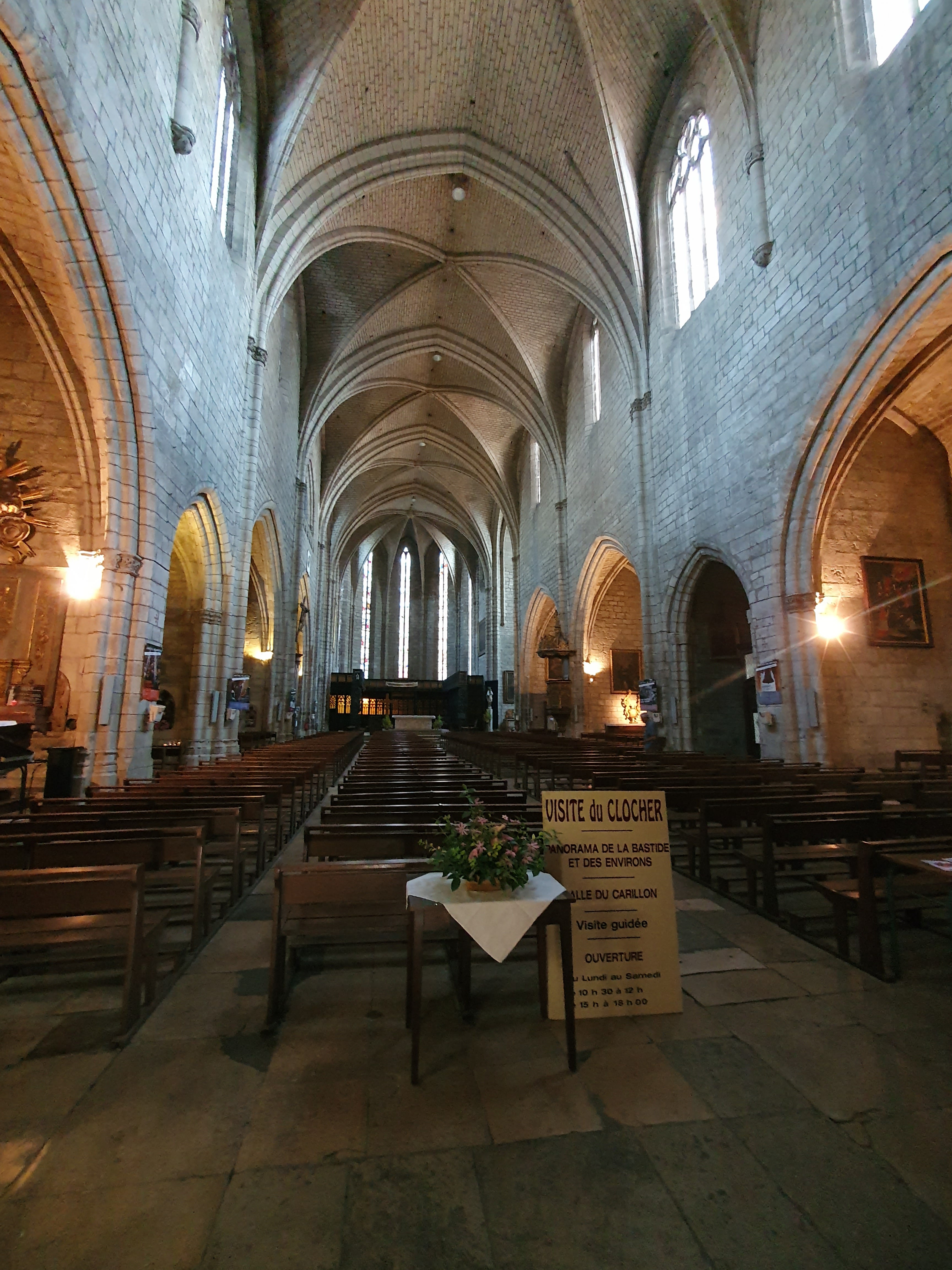 Massive telle une forteresse la Collégiale domine la place Notre Dame sans lui faire de l'ombre du fait de sa situation. Commencé quelques années après la fondation de la Bastide, le chantier s'achève à la fin du XVe siècle par la construction du clocher. Il s'intègre parfaitement à l'architecture du lieu. Après la visite de la Collégiale il est possible d'accédé au clocher et de profiter d'un magnifique panorama sur la Bastide ( la visite de celui-ci est guidé)